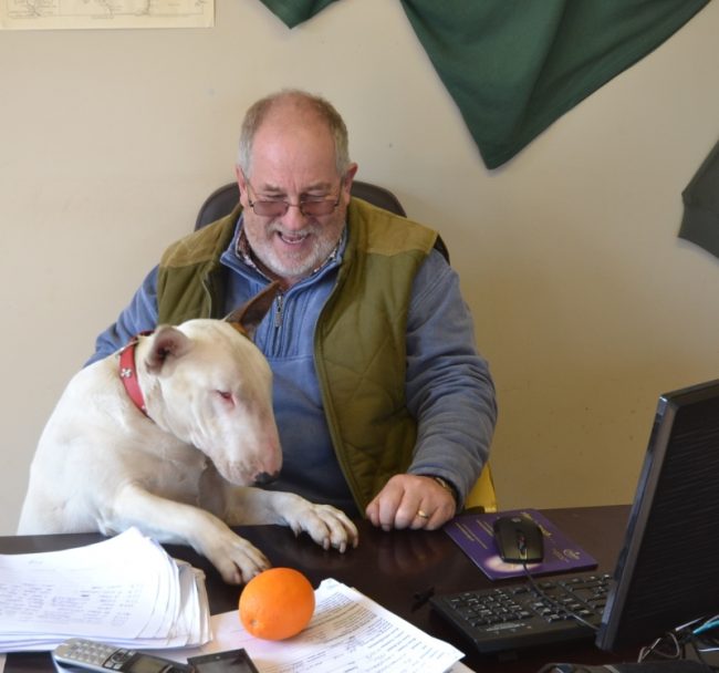 Our Team dog learning the ropes with a member of the team. Its a dogs life. Update: The Company Dog is in the Dog House. He was left in the car for 2 minutes and he has eaten a whole loaf of bread and was sitting on the wrapper, trying to hide the evidence.