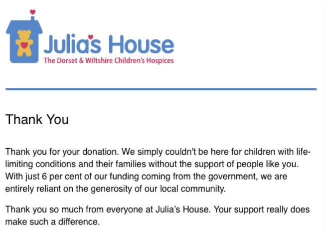 We have just donated £250.00 to Julia’s House Children’s Hospice who provide care for babies, children and young people with life-shortening or life-threatening conditions and support for their families.