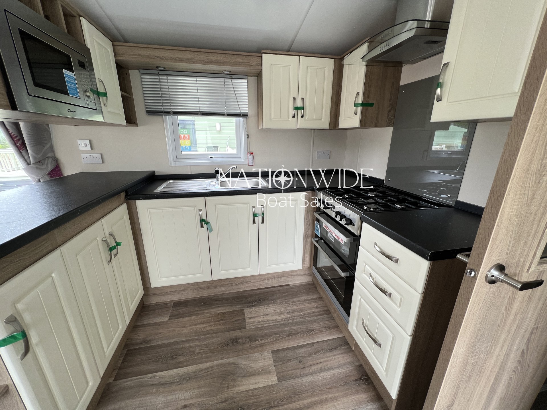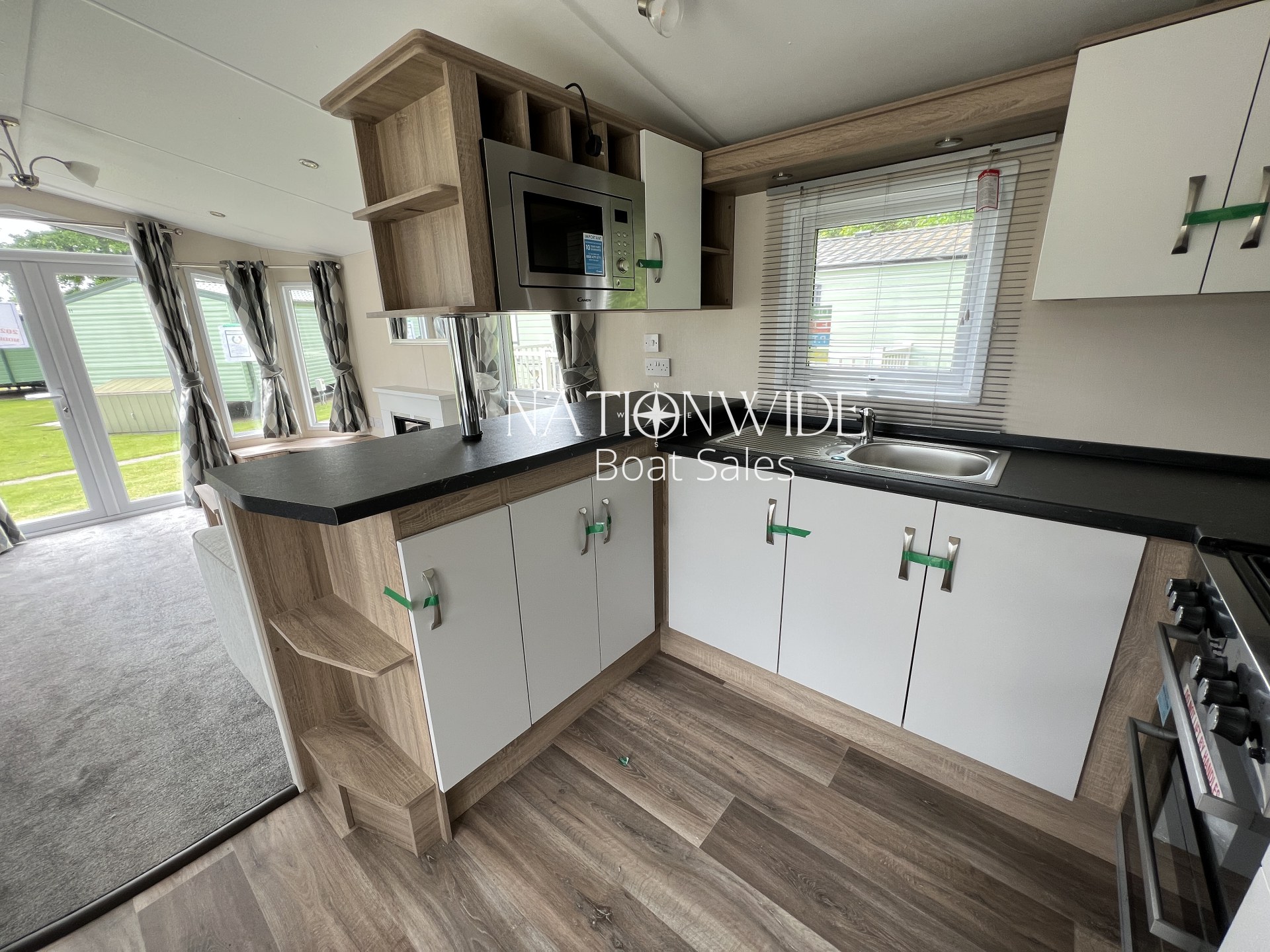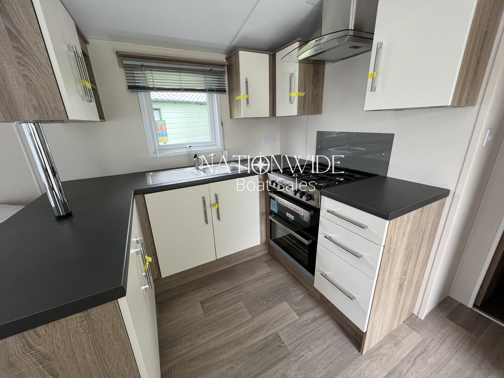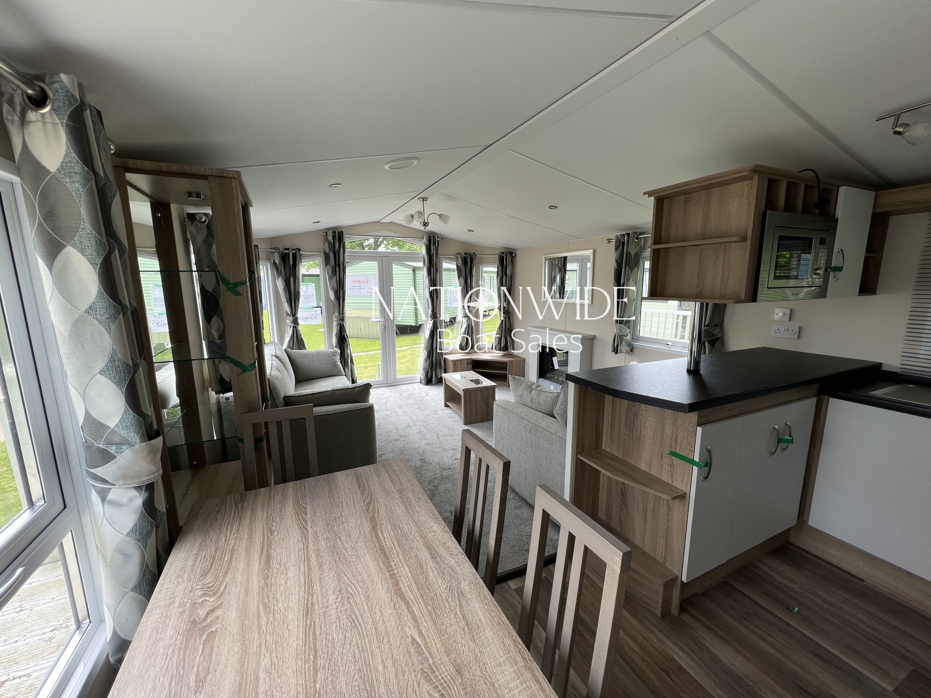 With the benefit of double glazing and central heating along with outlook doors. Mulberry Neo offers a contemporary design with the latest colour scheme with graphite windows. The kitchen area boasts an integrated fridge/freezer, integrated microwave and a cooker.