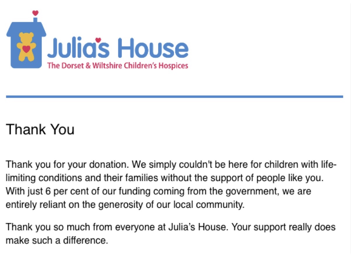 We have just donated £250.00 to Julia’s House Children’s Hospice who provide care for babies, children and young people with life-shortening or life-threatening conditions and support for their families.