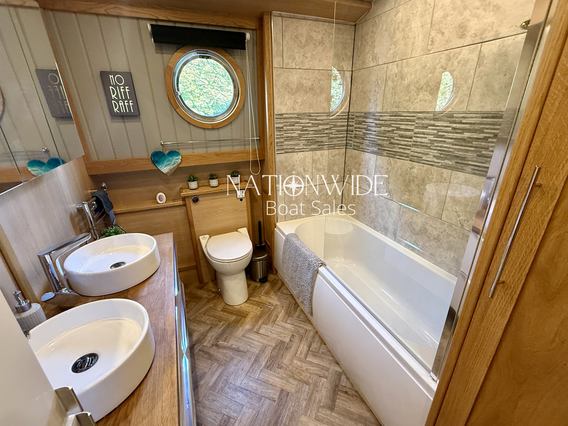 Accommodation is arranged across two cabins both featuring a double bed with ample storage/wardrobe space as well as the potential for additional berths in the saloon. The bathroom is fitted with a shower-over-bath, dual vanity basins, Vetus pump-out toilet, and a heated towel radiator.