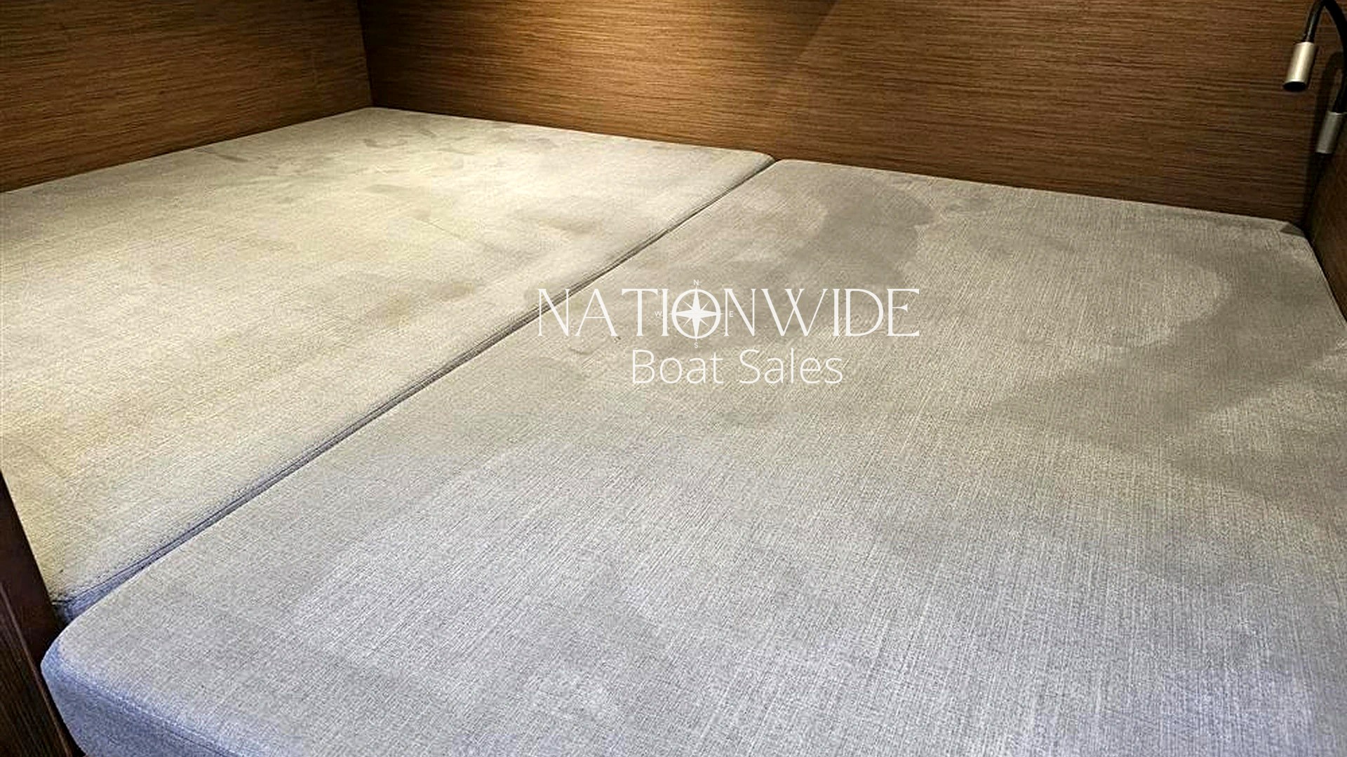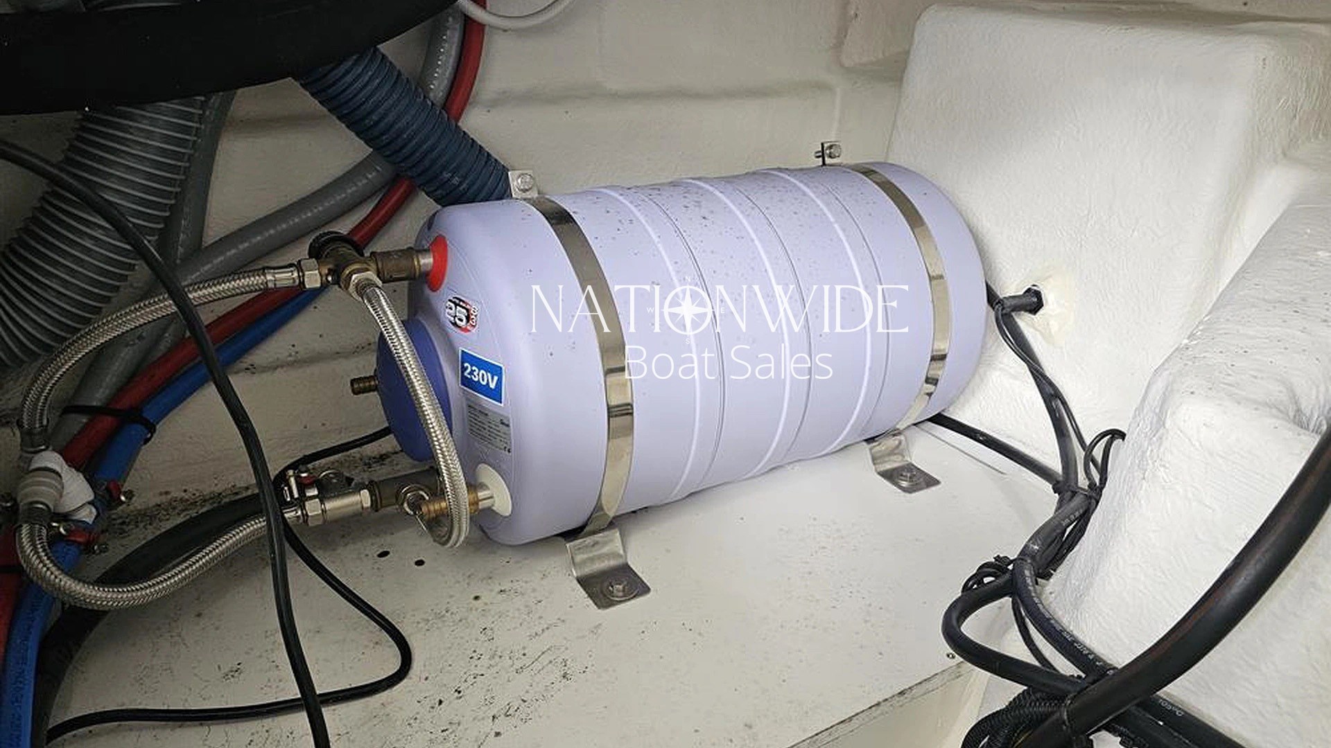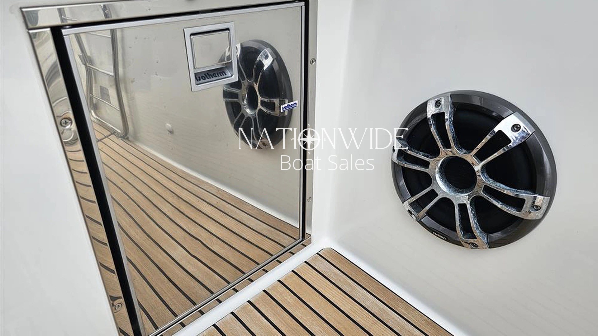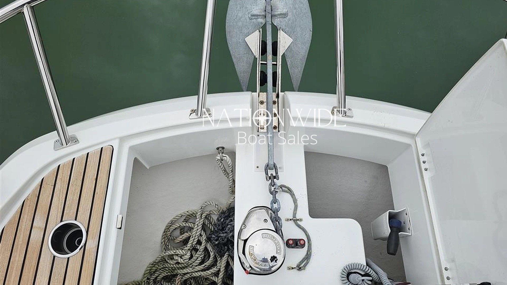 Her impressive inventory includes a Skyhook digital anchor, Joystick controls, SidePower bow thruster, Simrad 18inch/GPS/Plotter, Garmin DCS/VHF radio, Zipwake auto trimtabs, Plastimo compass, Fusion Stereo with cockpit speakers, a twin burner hob, sink, two fridges, a microwave combi oven, electric sea toilet, saloon table, cockpit roll up camper cover, electric windlass, fenders and warps, and she’s even copper coated.