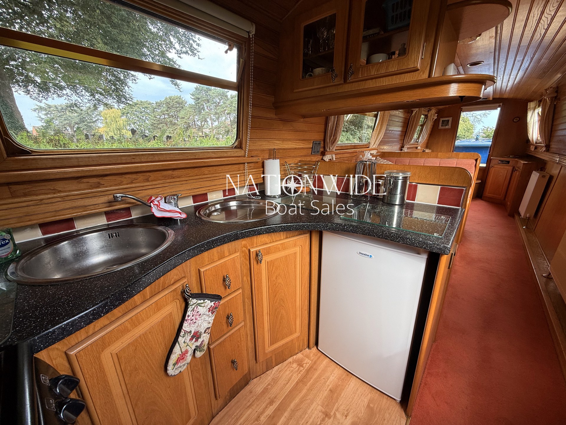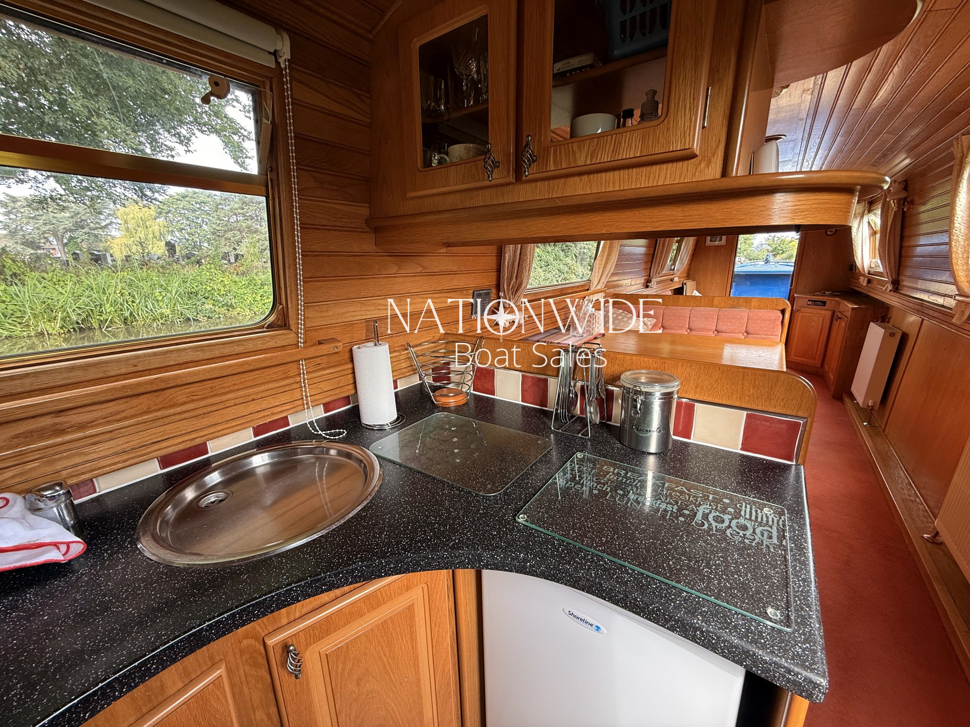The galley is equipped for life on the water, with a cooker, 12v Shoreline fridge, and attractive Minerelle worktops, providing the perfect space to prepare meals. Sleeping arrangements are flexible, with a fixed double bed complemented by dinette and L-shaped seating that convert into additional berths – ideal for welcoming family or friends aboard.