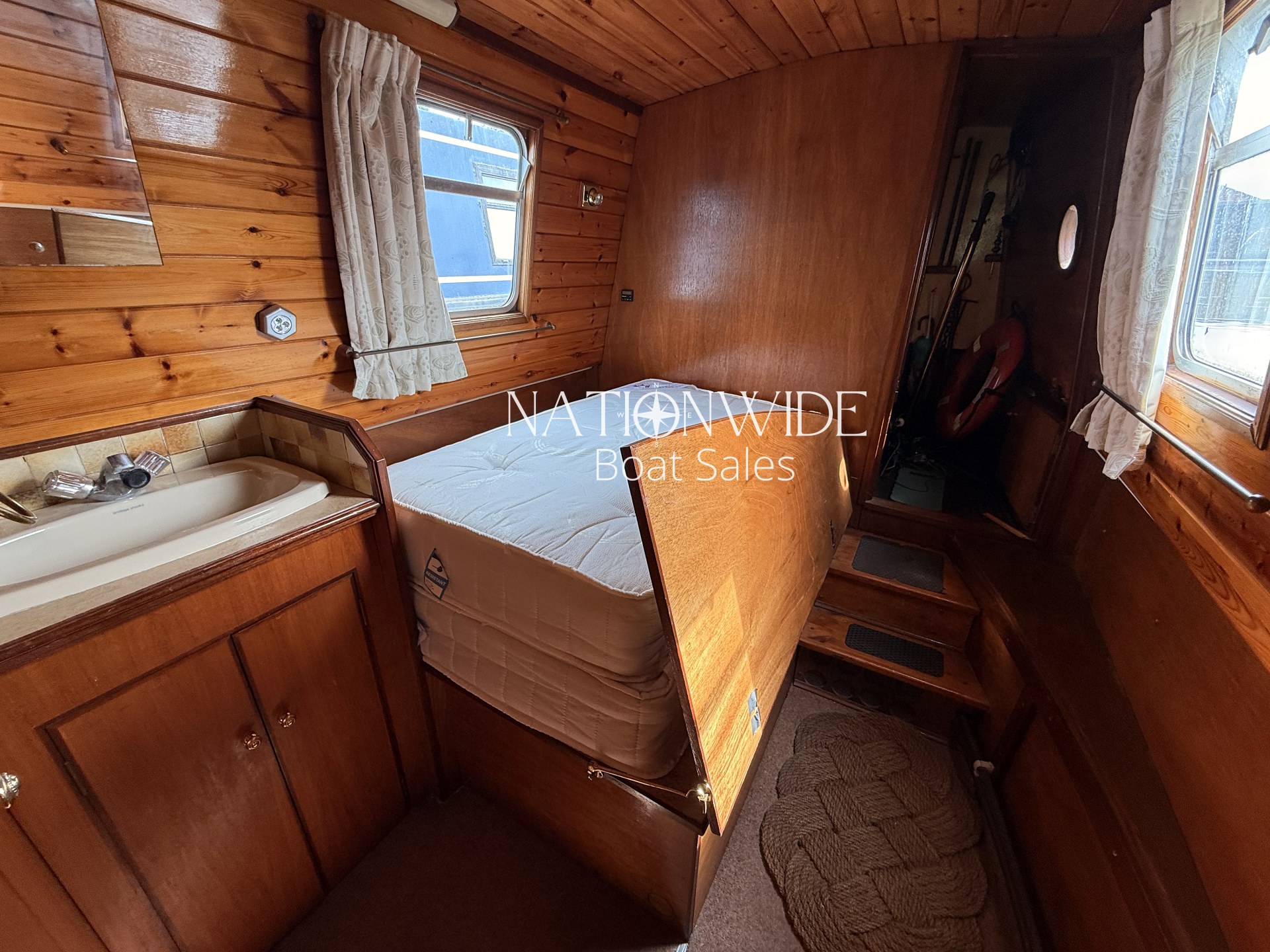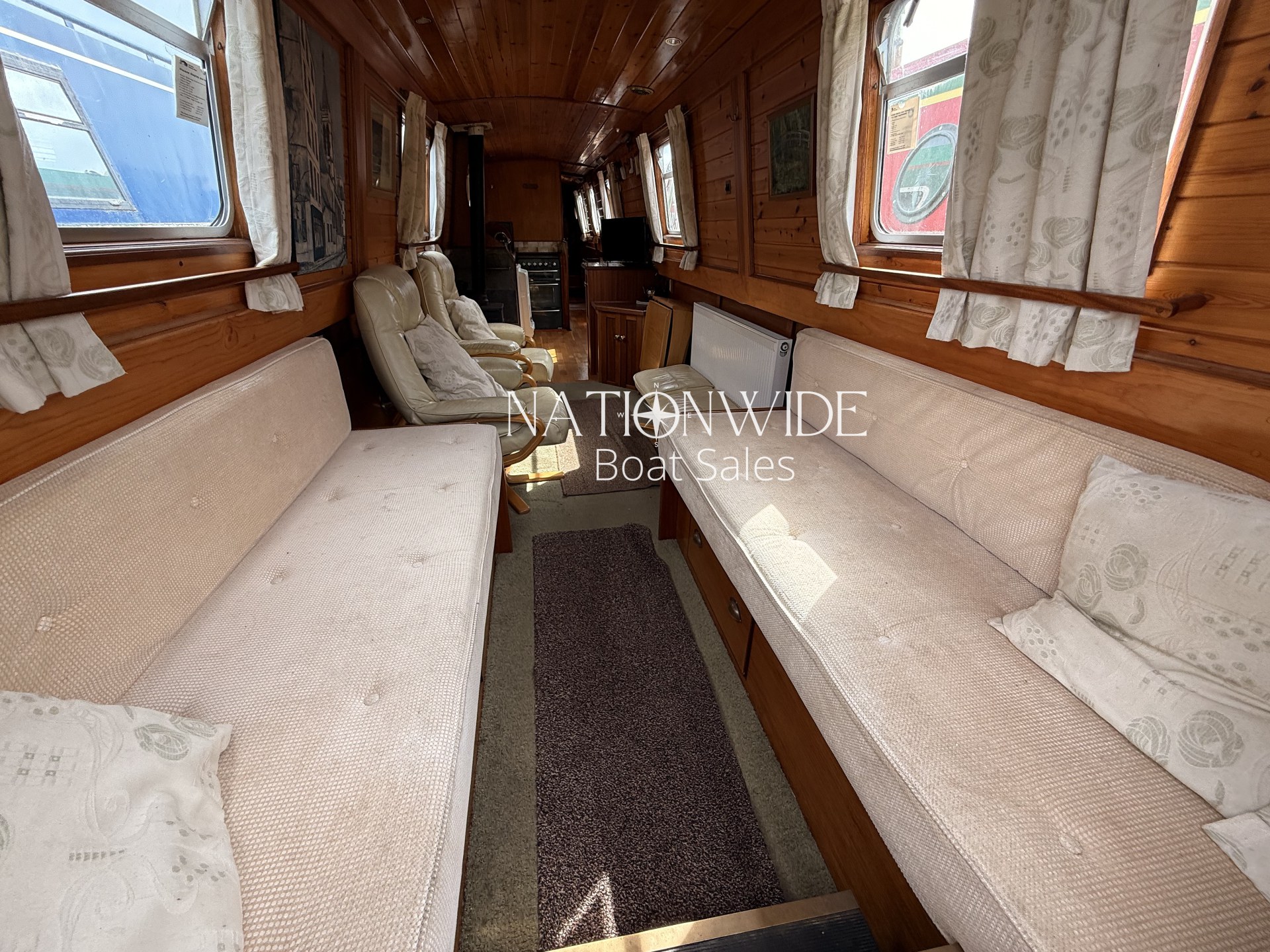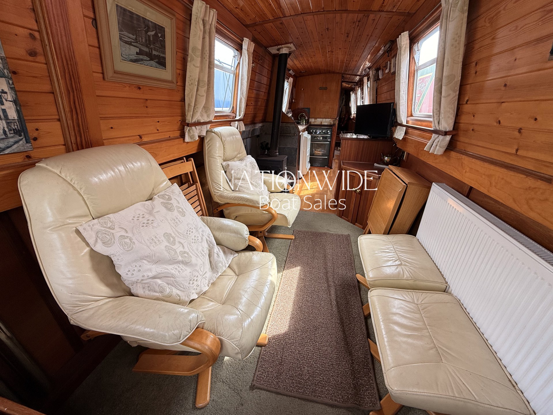 Her layout is thoughtfully arranged to make the most of the space onboard. A generous bow area offers flexible seating or room to relax, while the galley features a Spinflo cooker, 12v Shoreline fridge, and melamine worktops—practical touches that support life afloat without compromise.