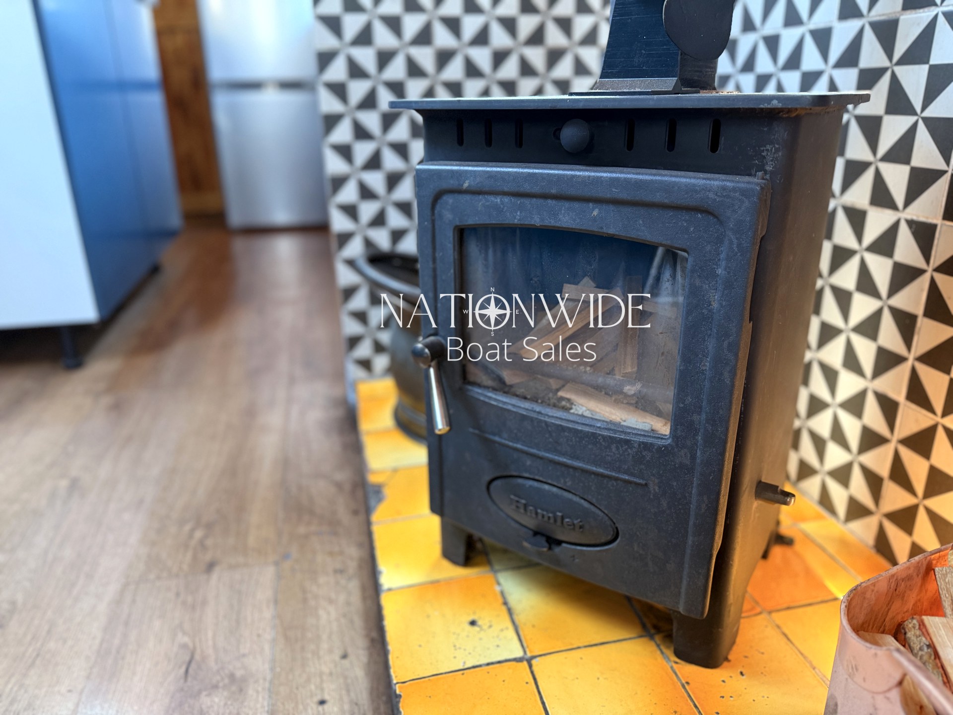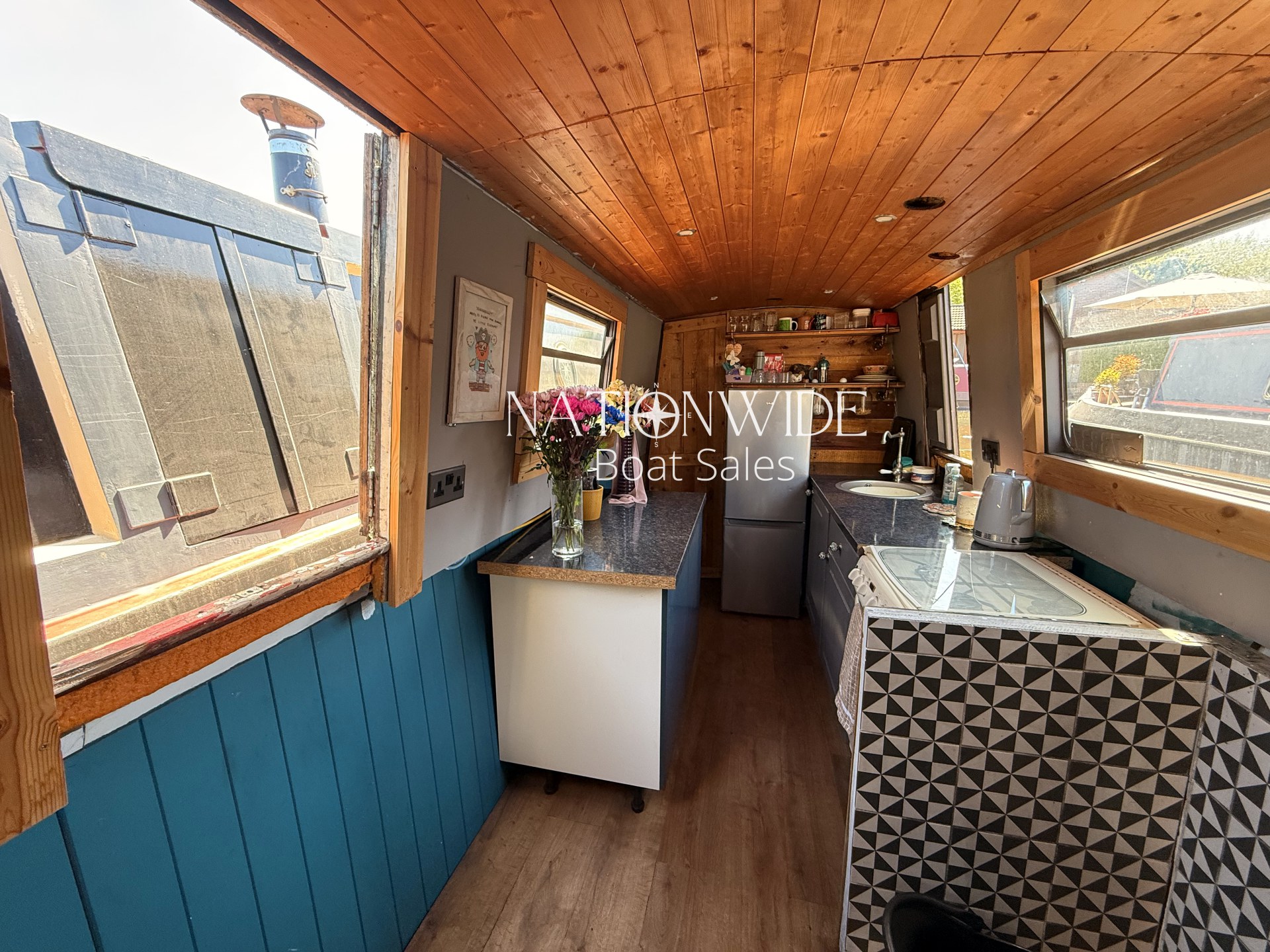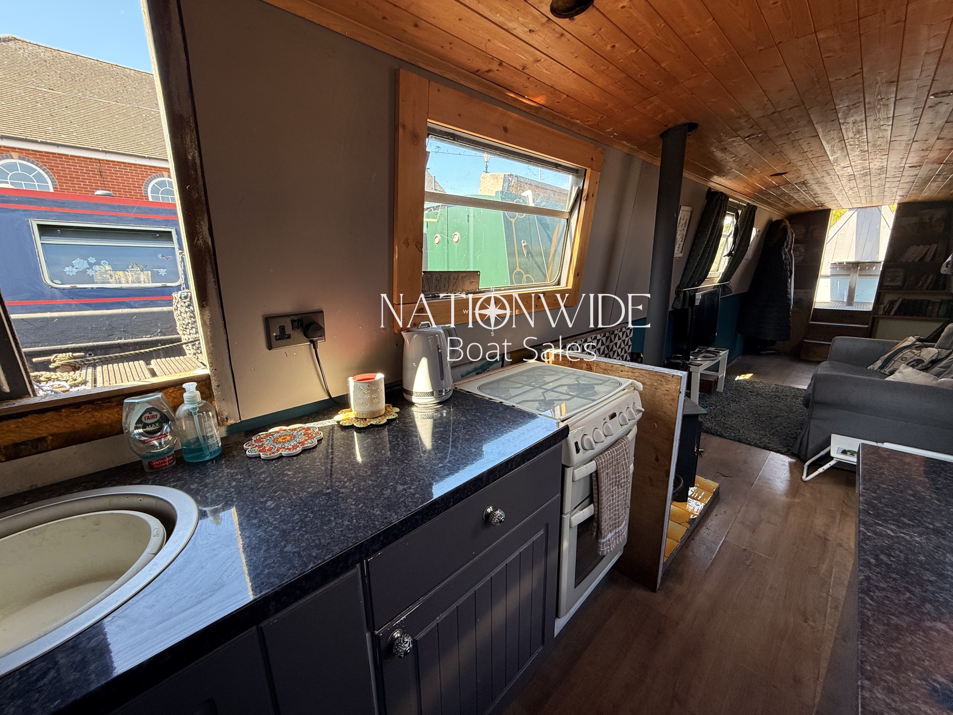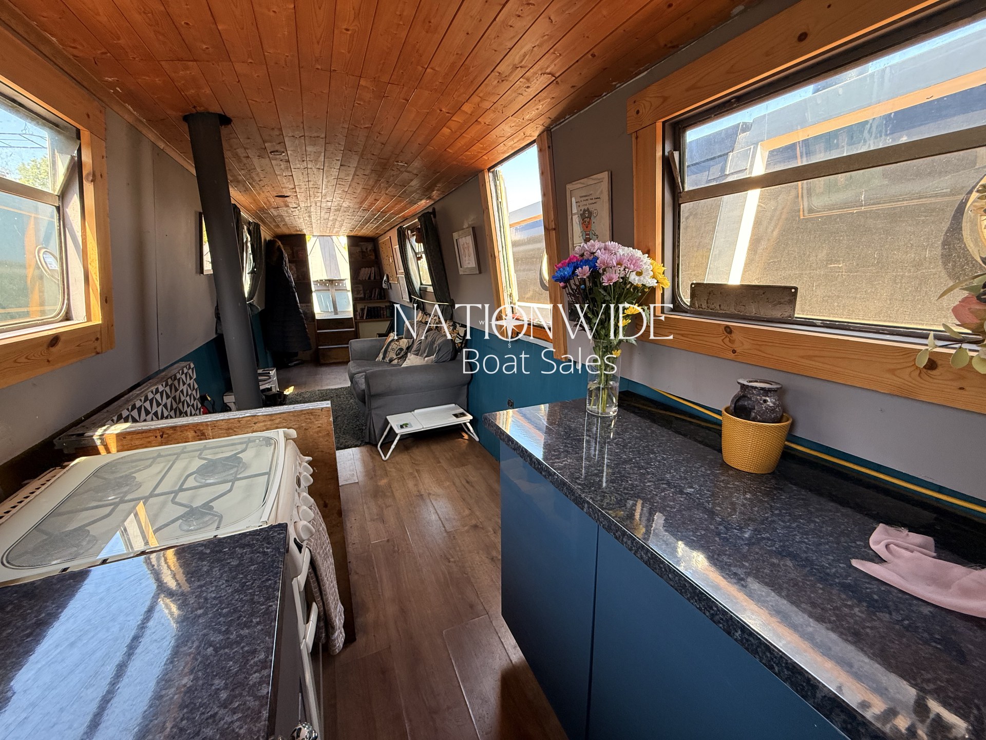Introducing Gallingale, a 65ft Trad built by Mike Heywood. Propulsion is provided by the BMC 4 cylinder engine. Hot water is supplied by the calorifier whilst the Hamlet 5kw solid fuel stove keeps the vessel warm throughout the year. The boat’s electrical setup comprises of 12v, 240v, Victron Multiplus Compact inverter, 1 starter, 1 leisure battery and a galvanic isolator. Within the galley we can find a Stoves oven and hob along with a Logik 240v fridge. Accommodation is provided for two with a fixed double bed to the stern, which can easily be extended when not needing a walkway through to the stern. There is also potential for additional berths within the saloon. The walkthrough bathroom is home to a cassette toilet, shower and vanity basin.