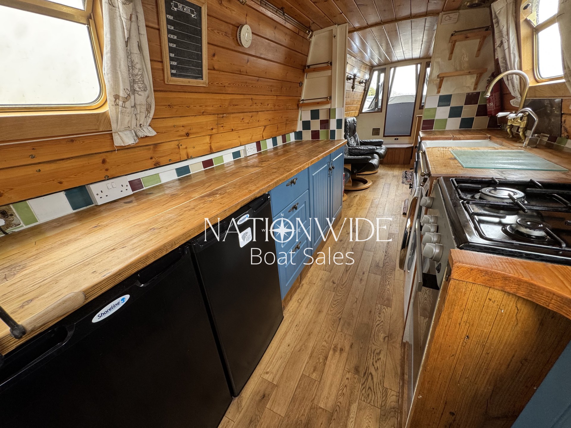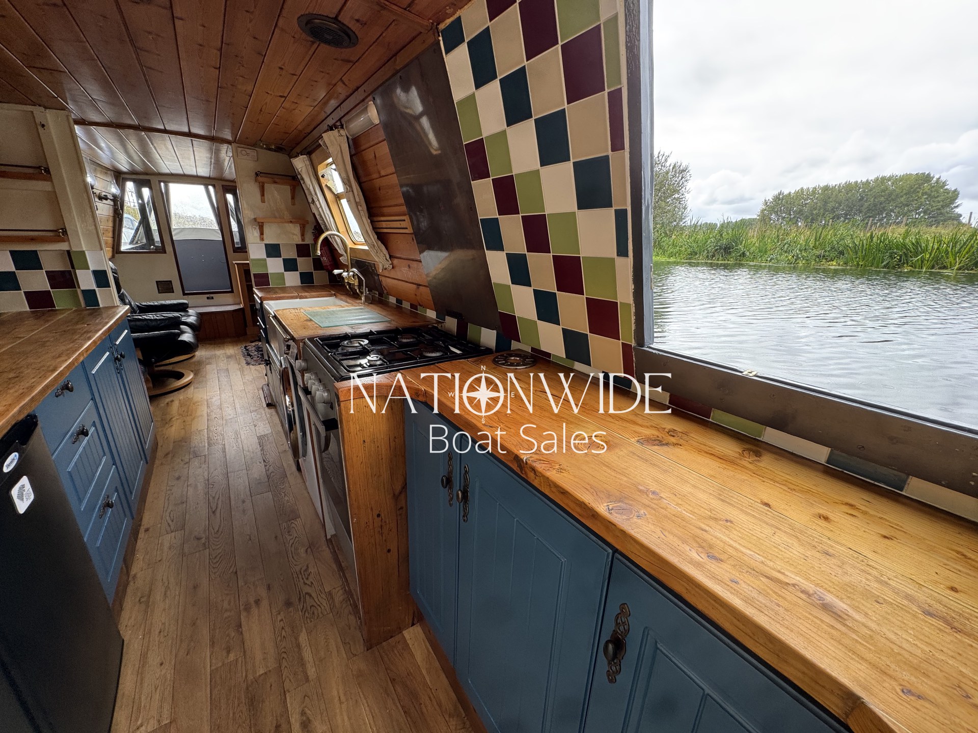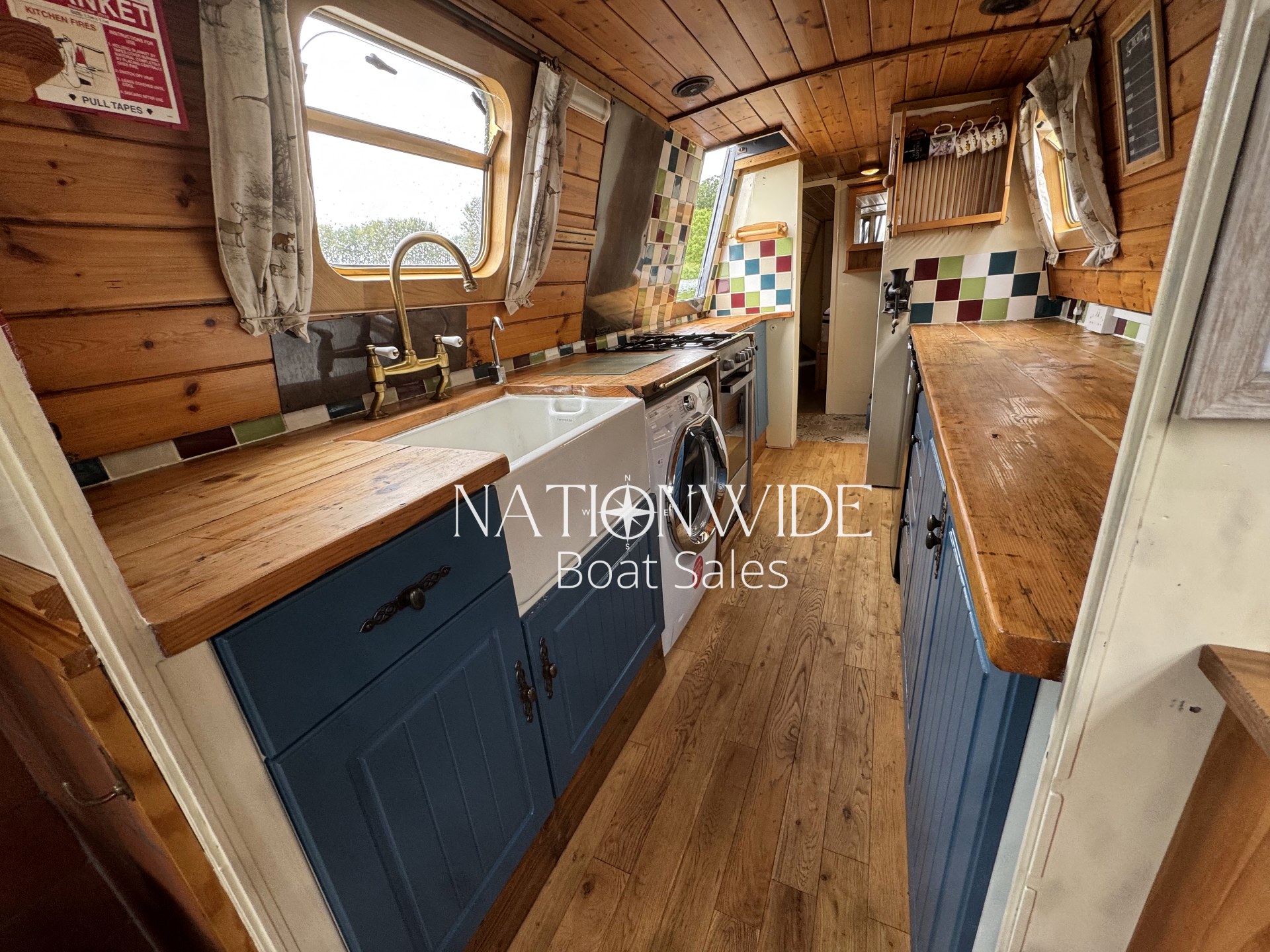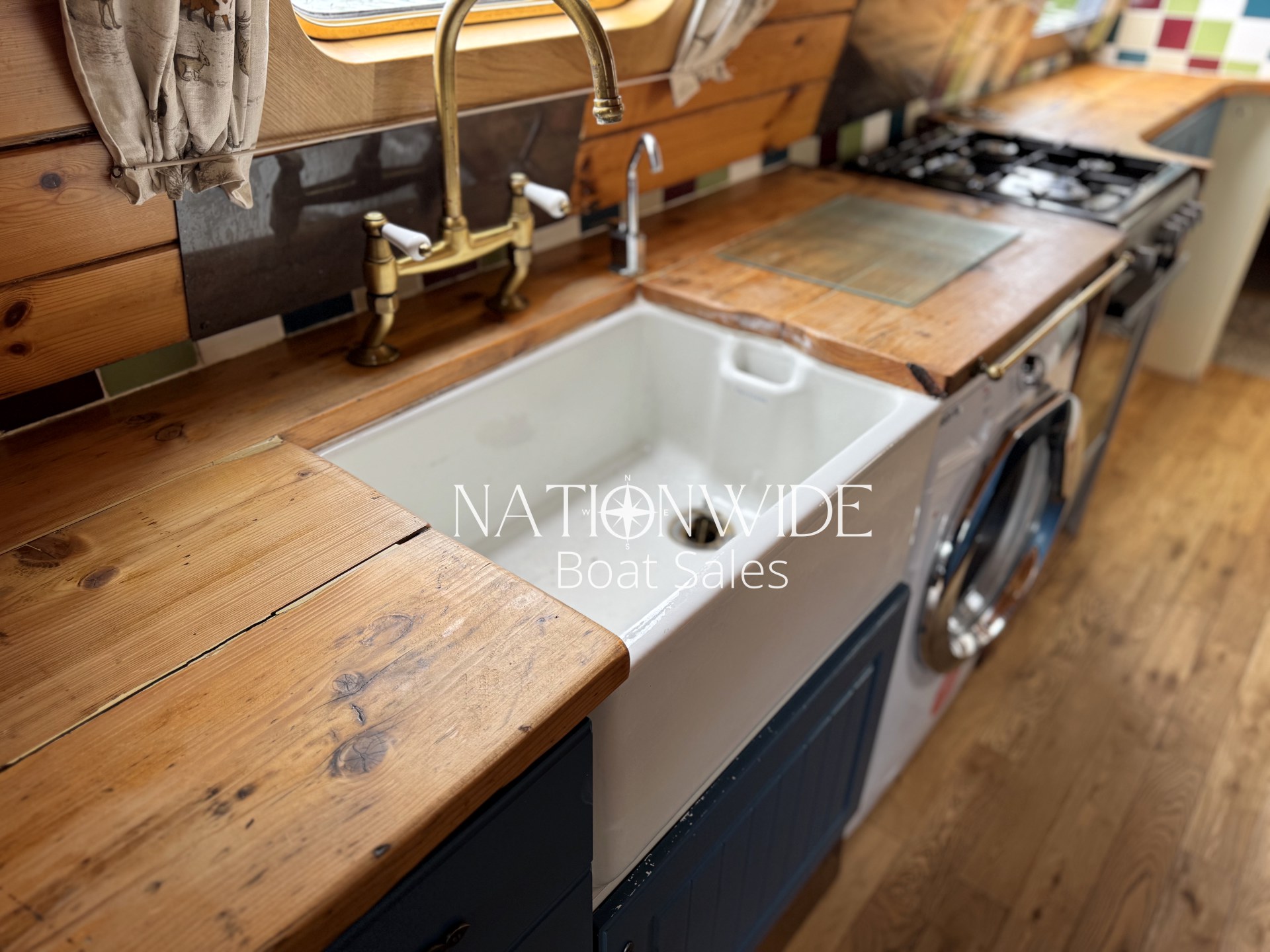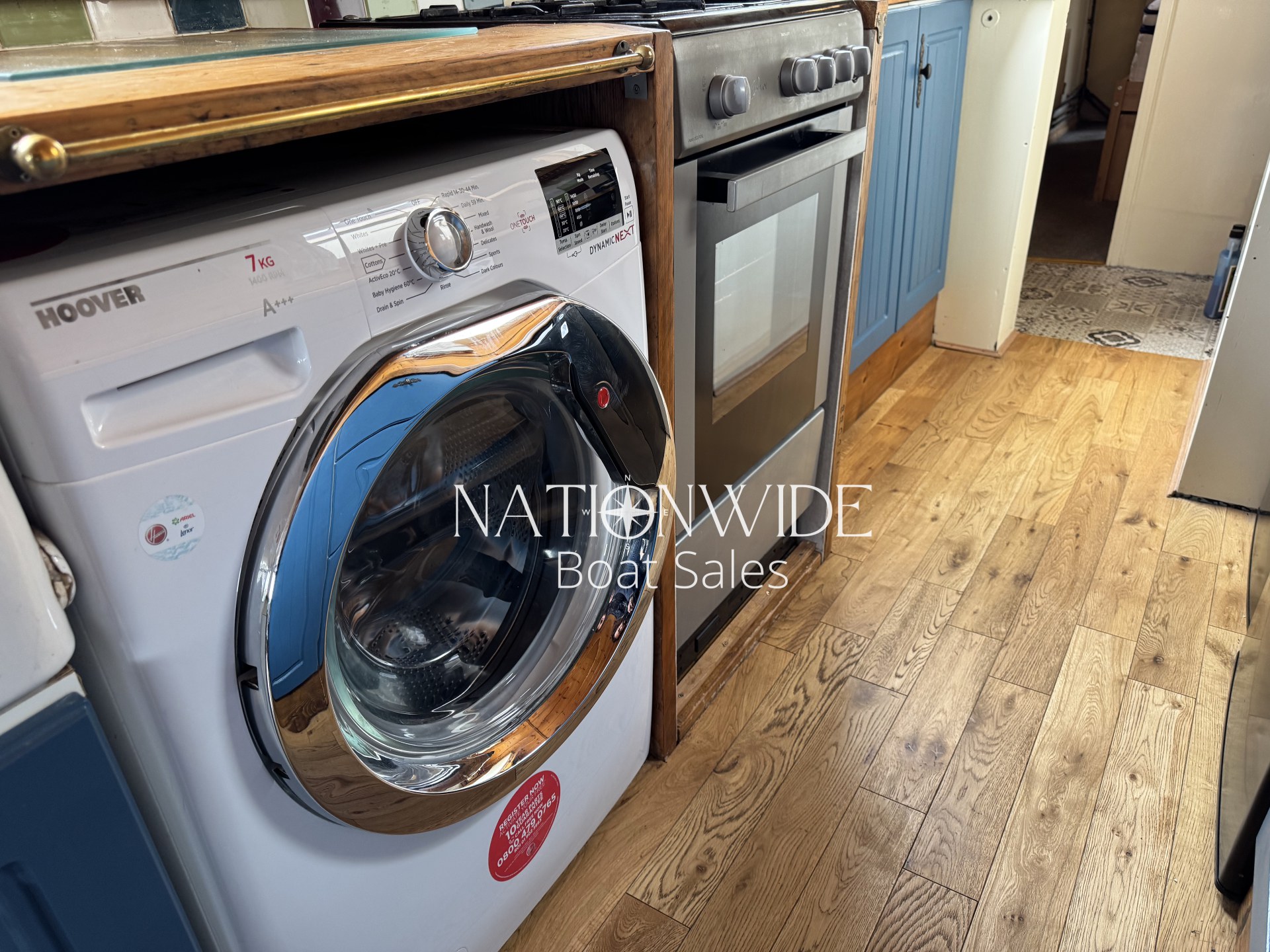 Inside, the galley is well-equipped with a 12v Shoreline fridge, Statesman cooker, Hoover washing machine, and solid oak worktops, adding warmth and character to this stunning boat. The walkthrough bathroom features a Thetford cassette toilet and a vanity basin.