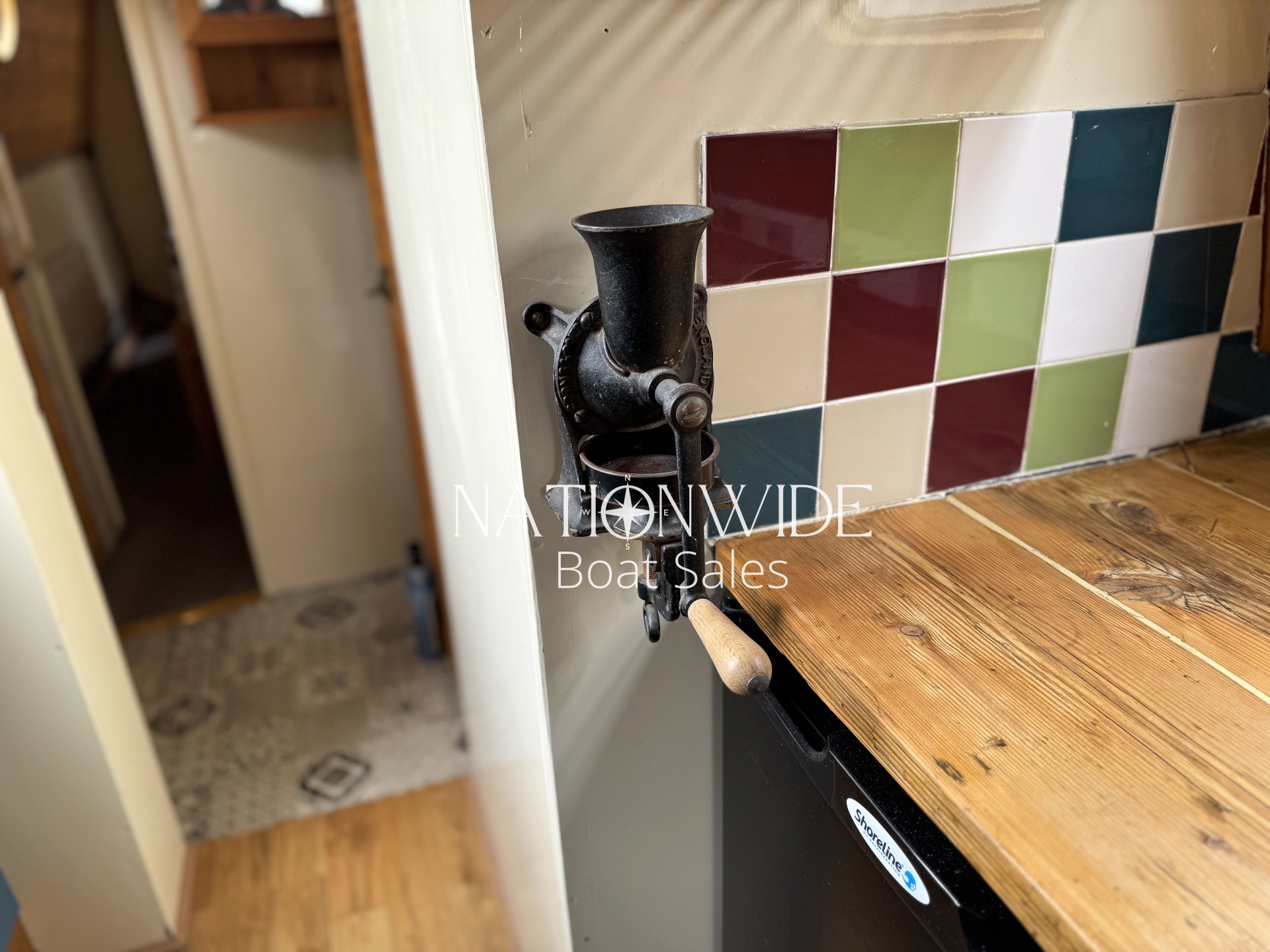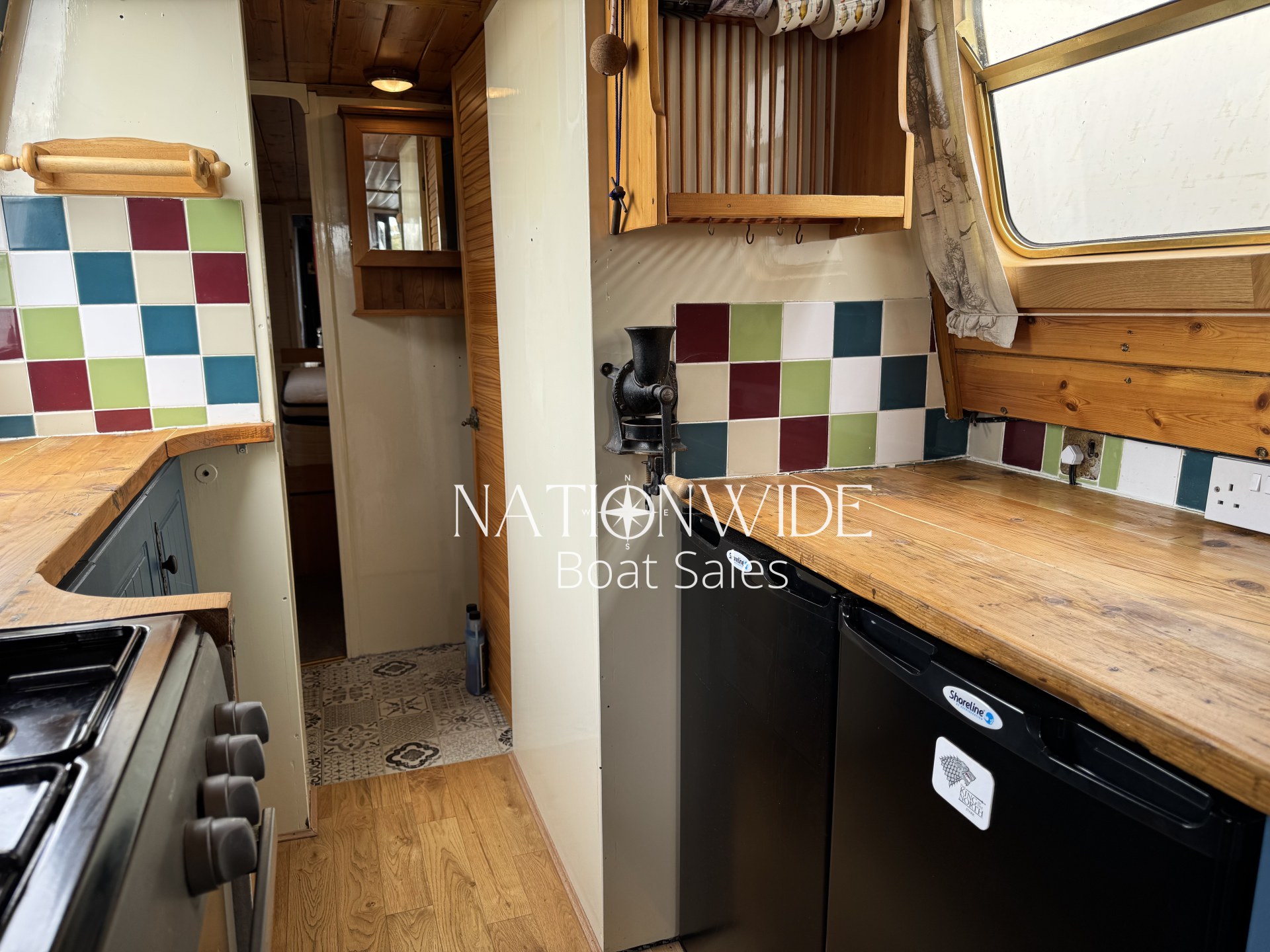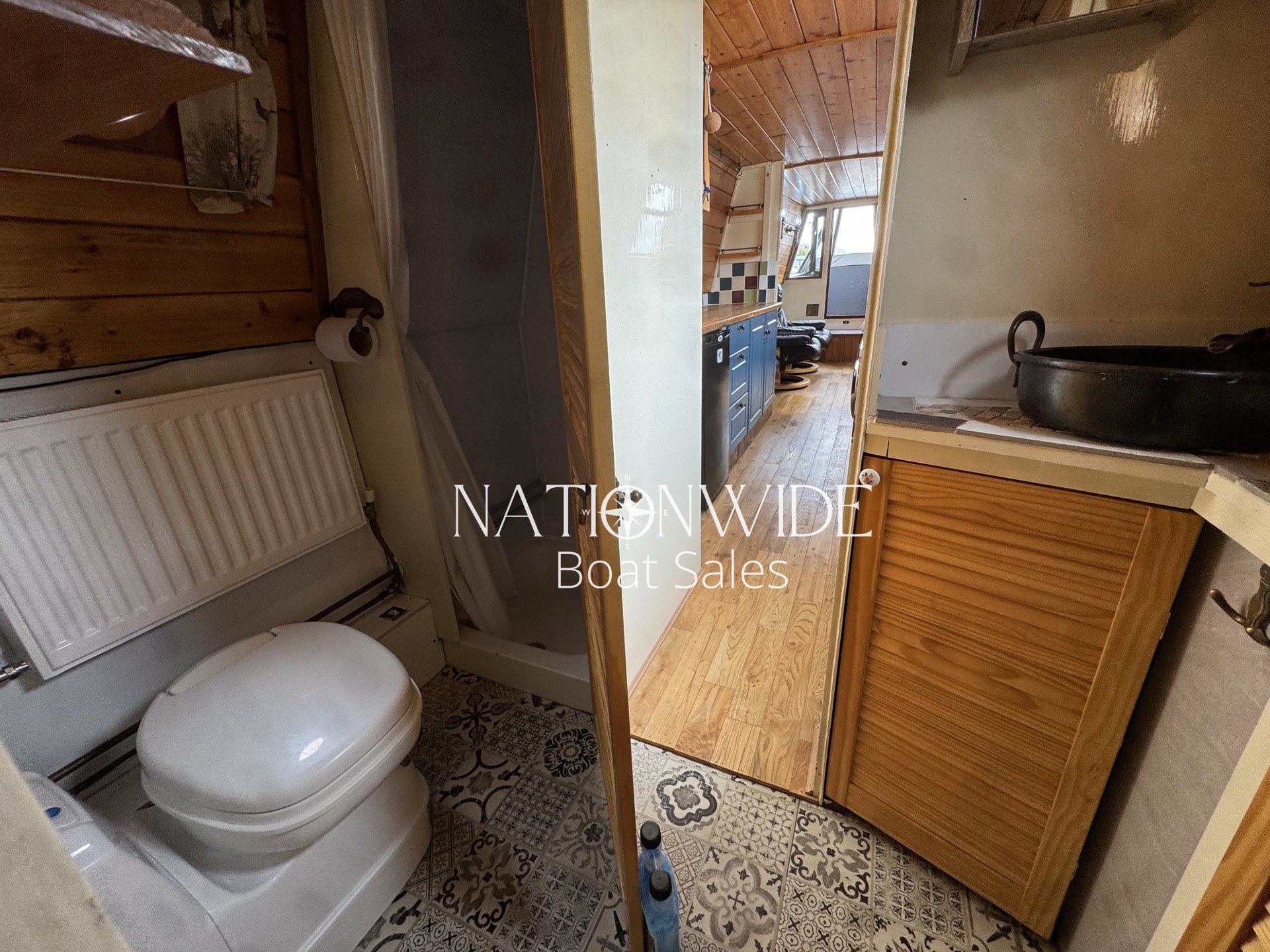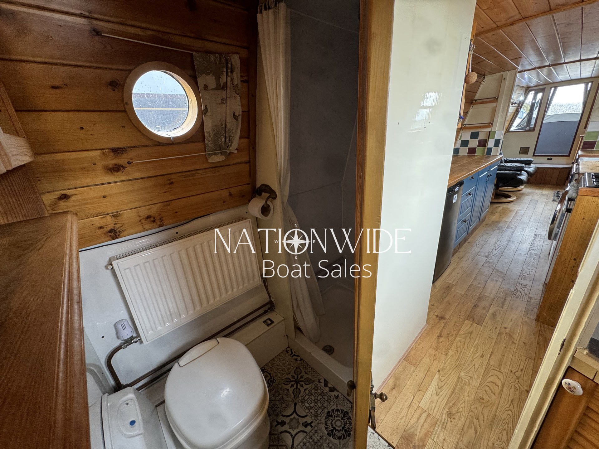 Inside, the galley is well-equipped with a 12v Shoreline fridge, Statesman cooker, Hoover washing machine, and solid oak worktops, adding warmth and character to this stunning boat. The walkthrough bathroom features a Thetford cassette toilet and a vanity basin.