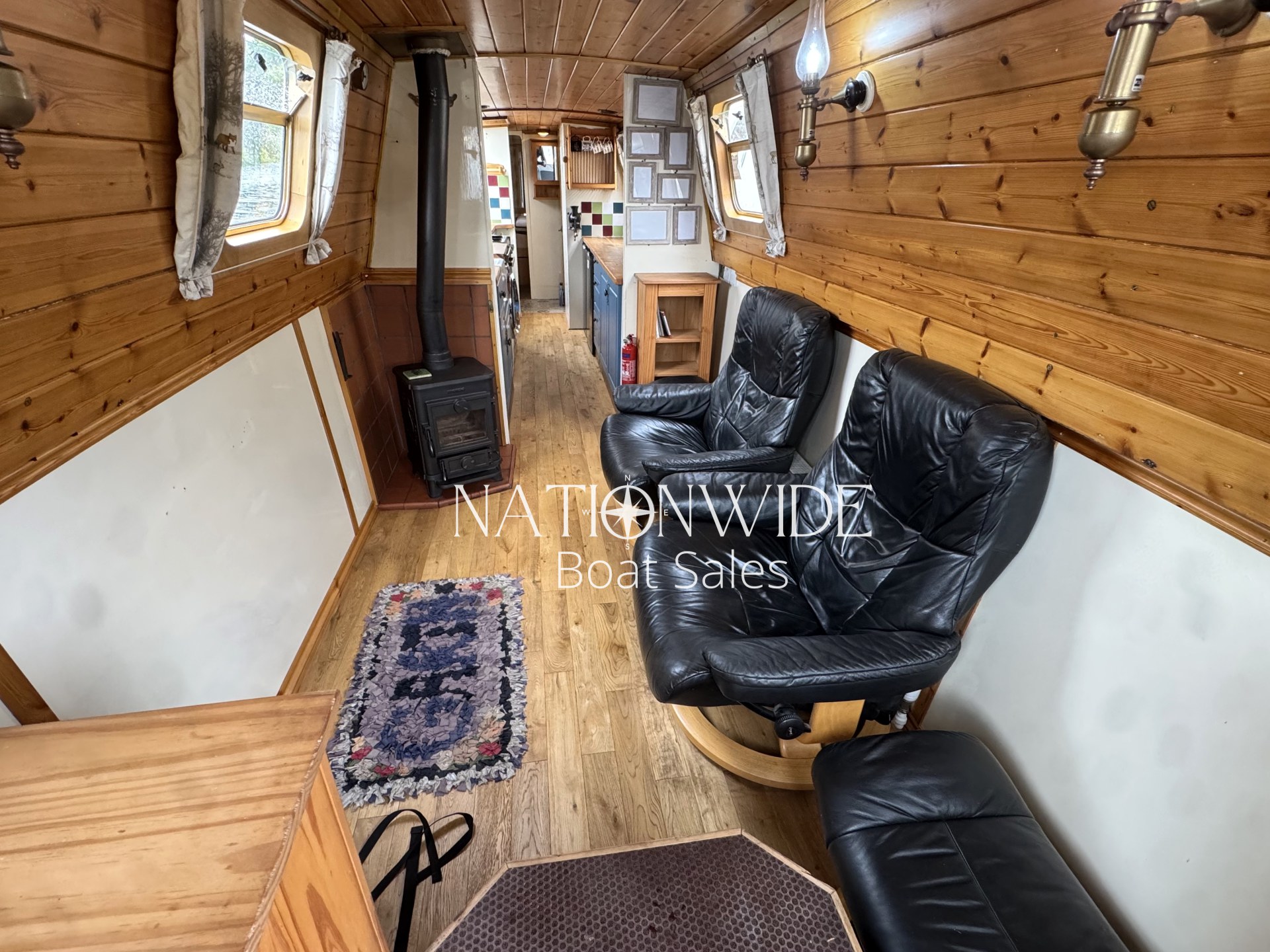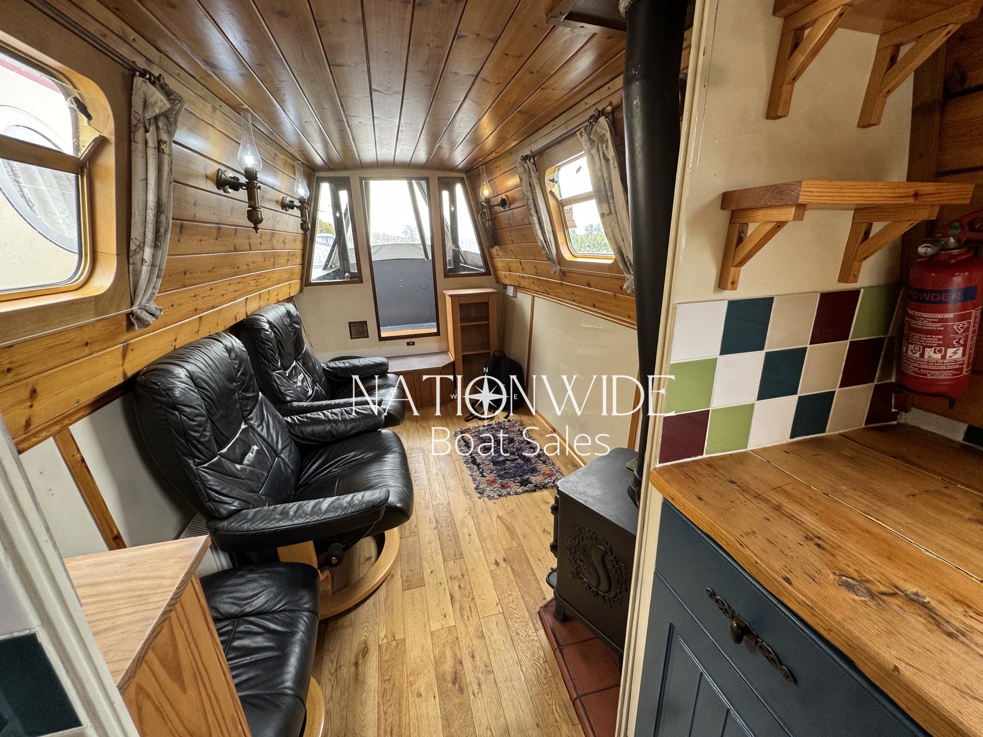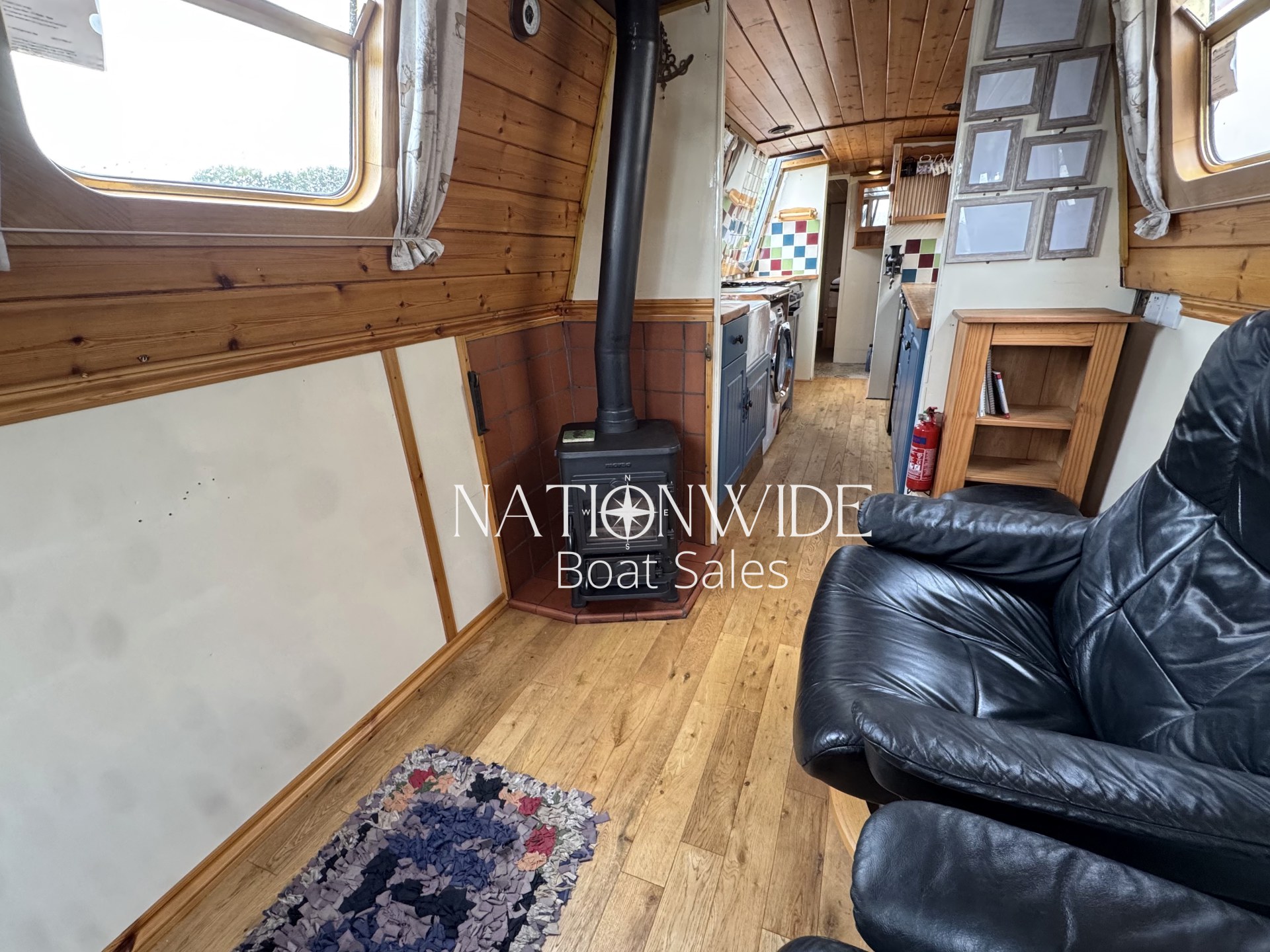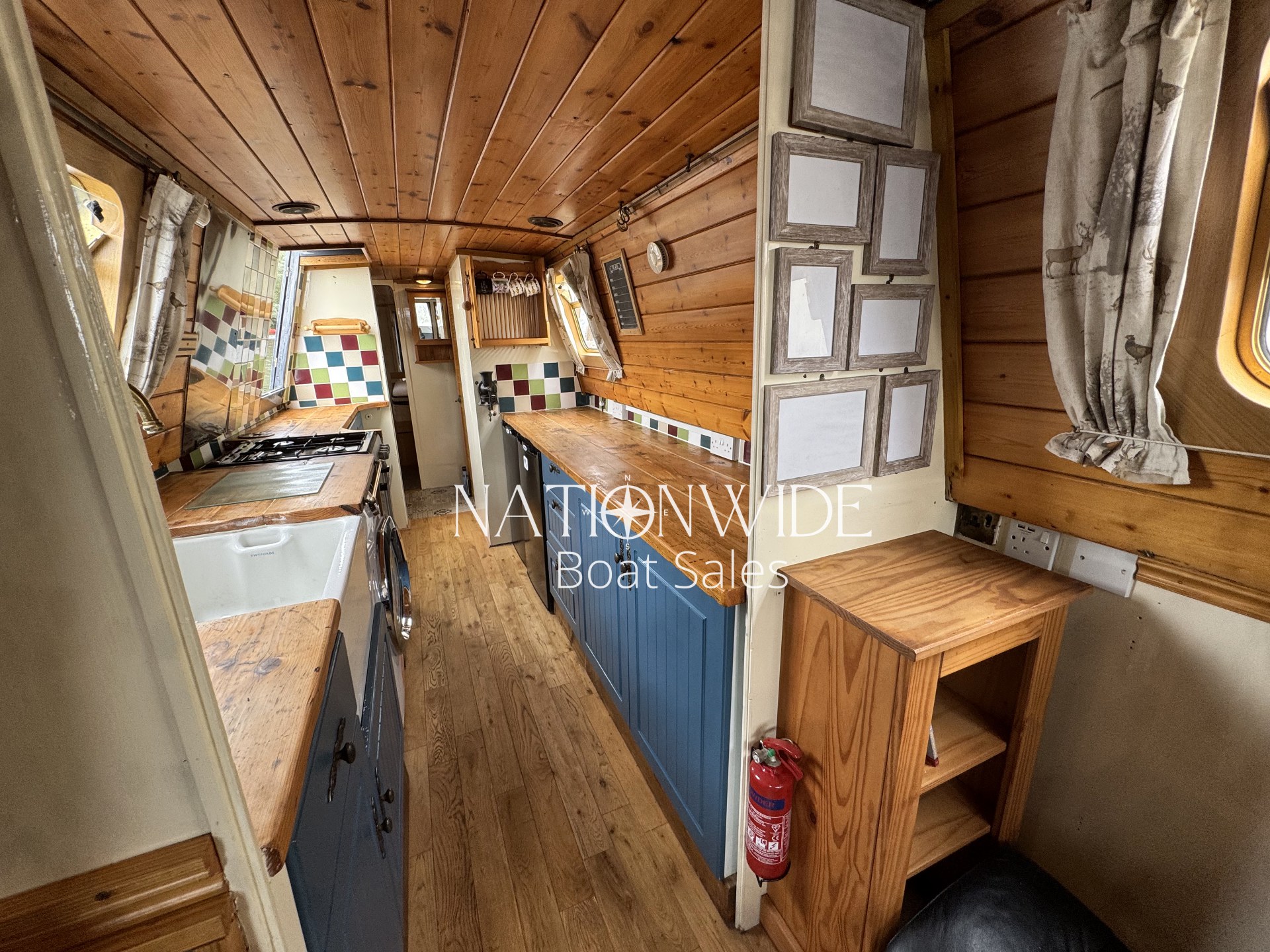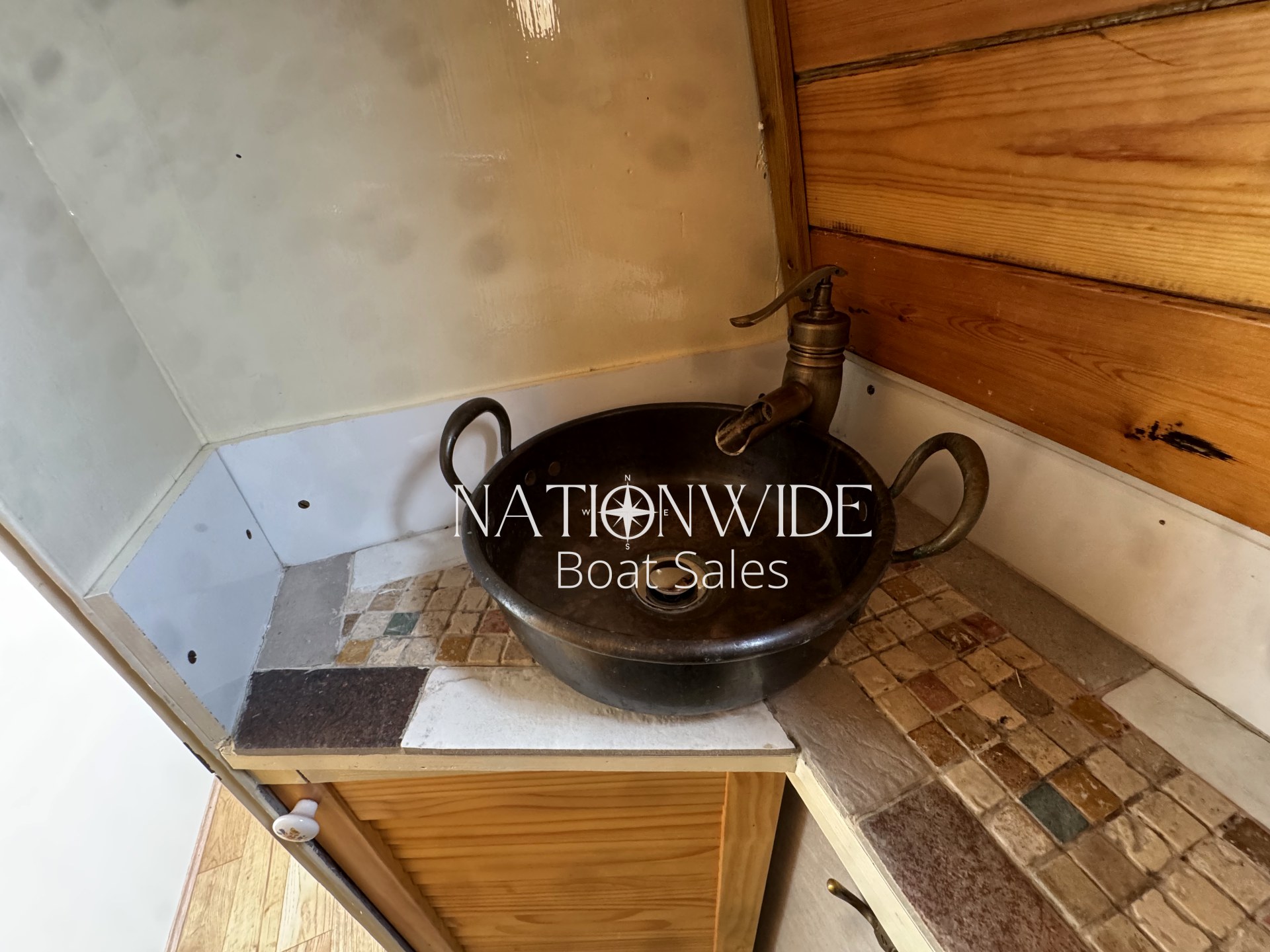 Inside, the galley is well-equipped with a 12v Shoreline fridge, Statesman cooker, Hoover washing machine, and solid oak worktops, adding warmth and character to this stunning boat. The walkthrough bathroom features a Thetford cassette toilet and a vanity basin.