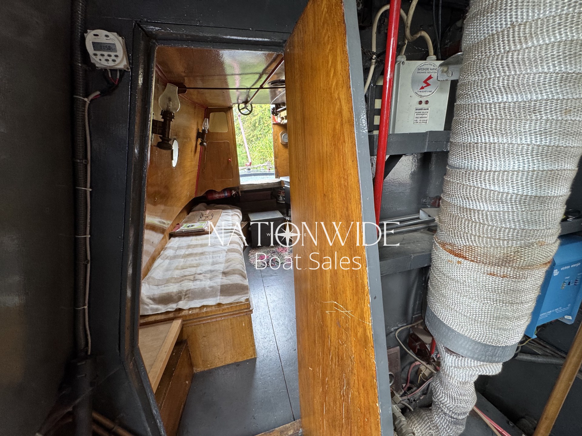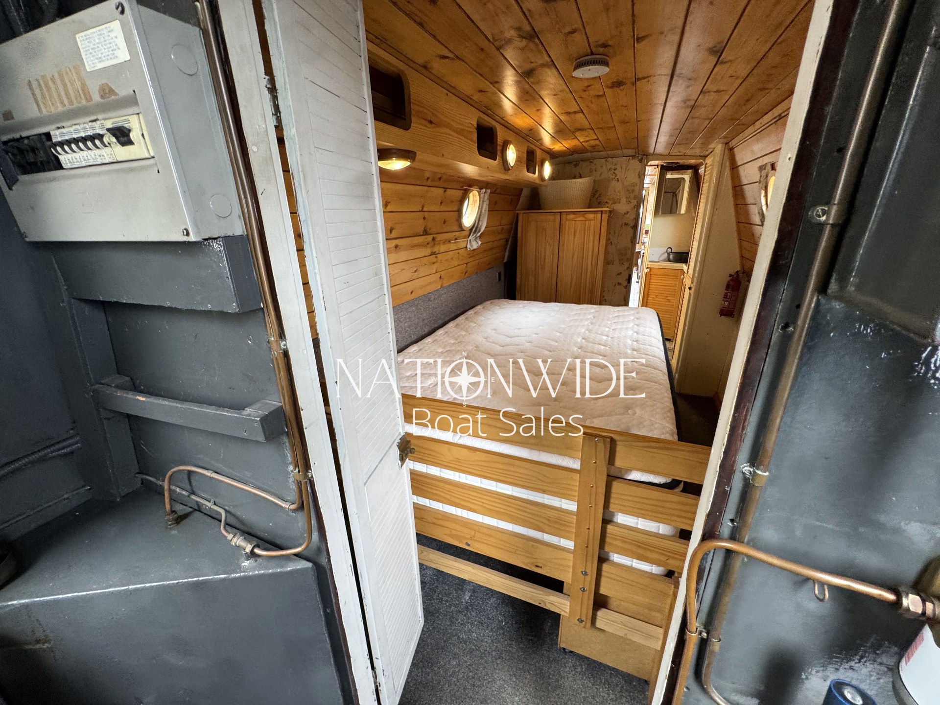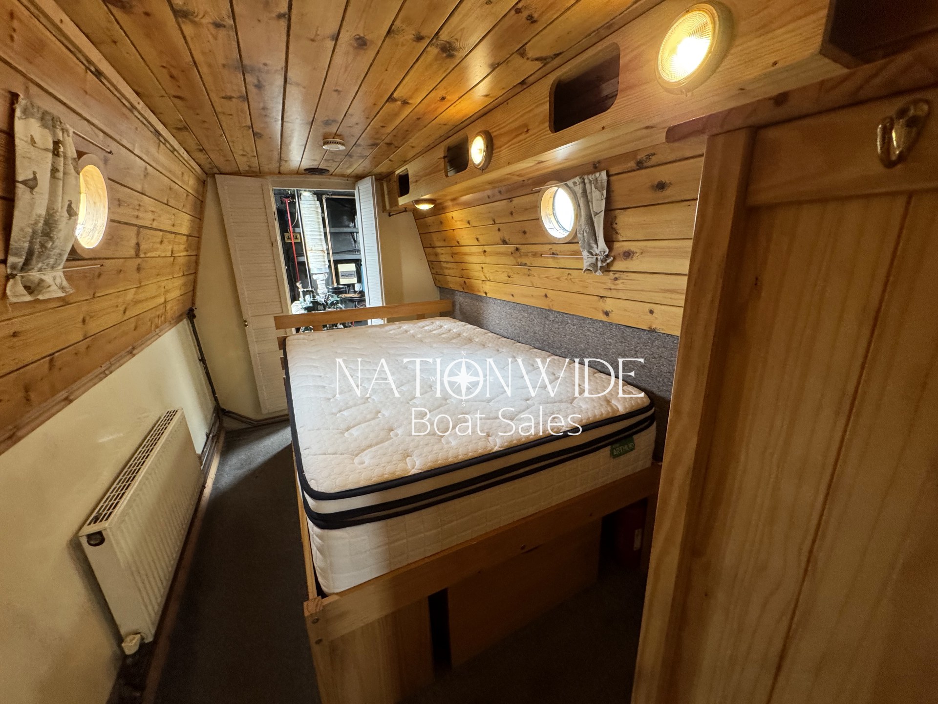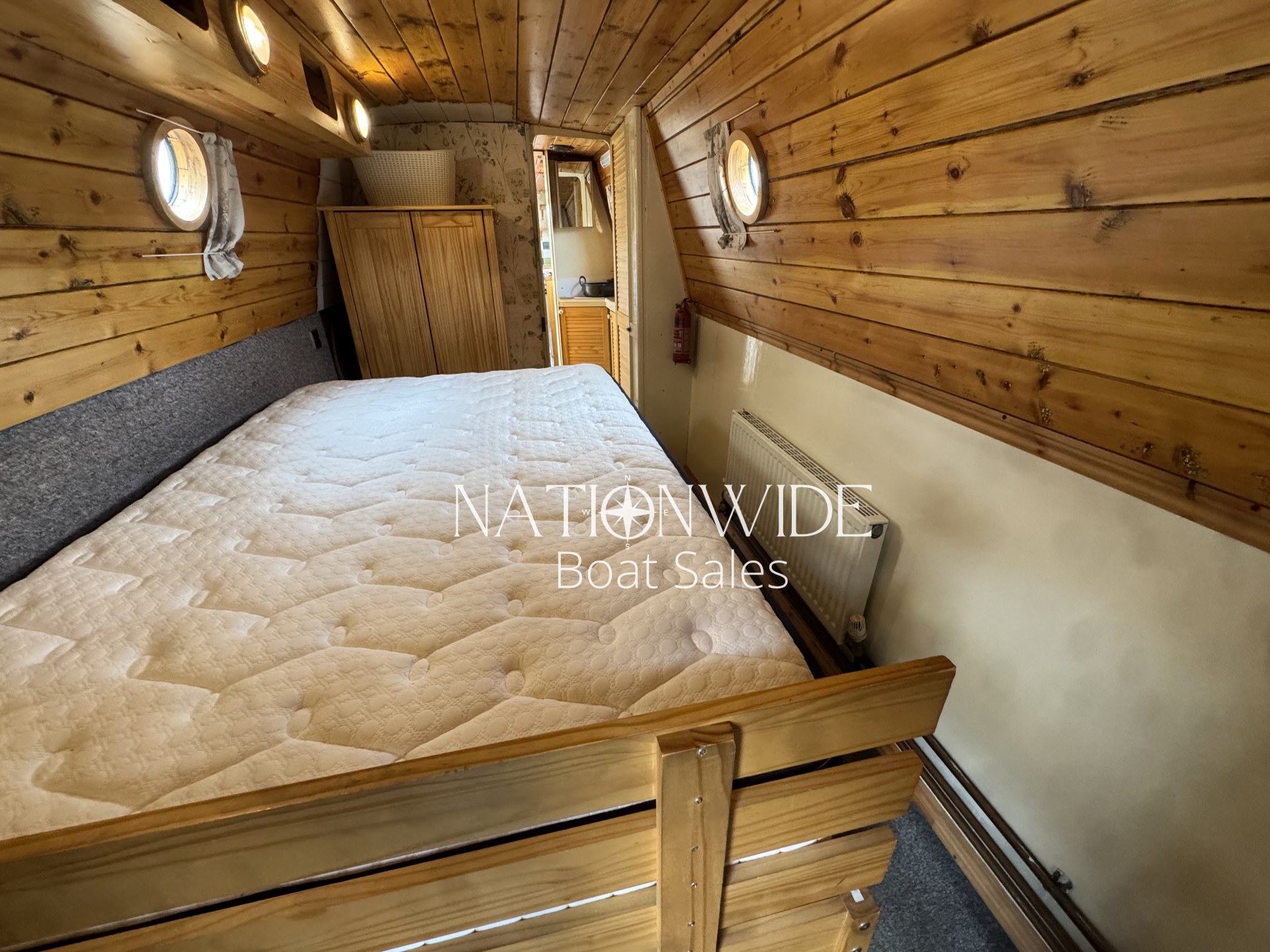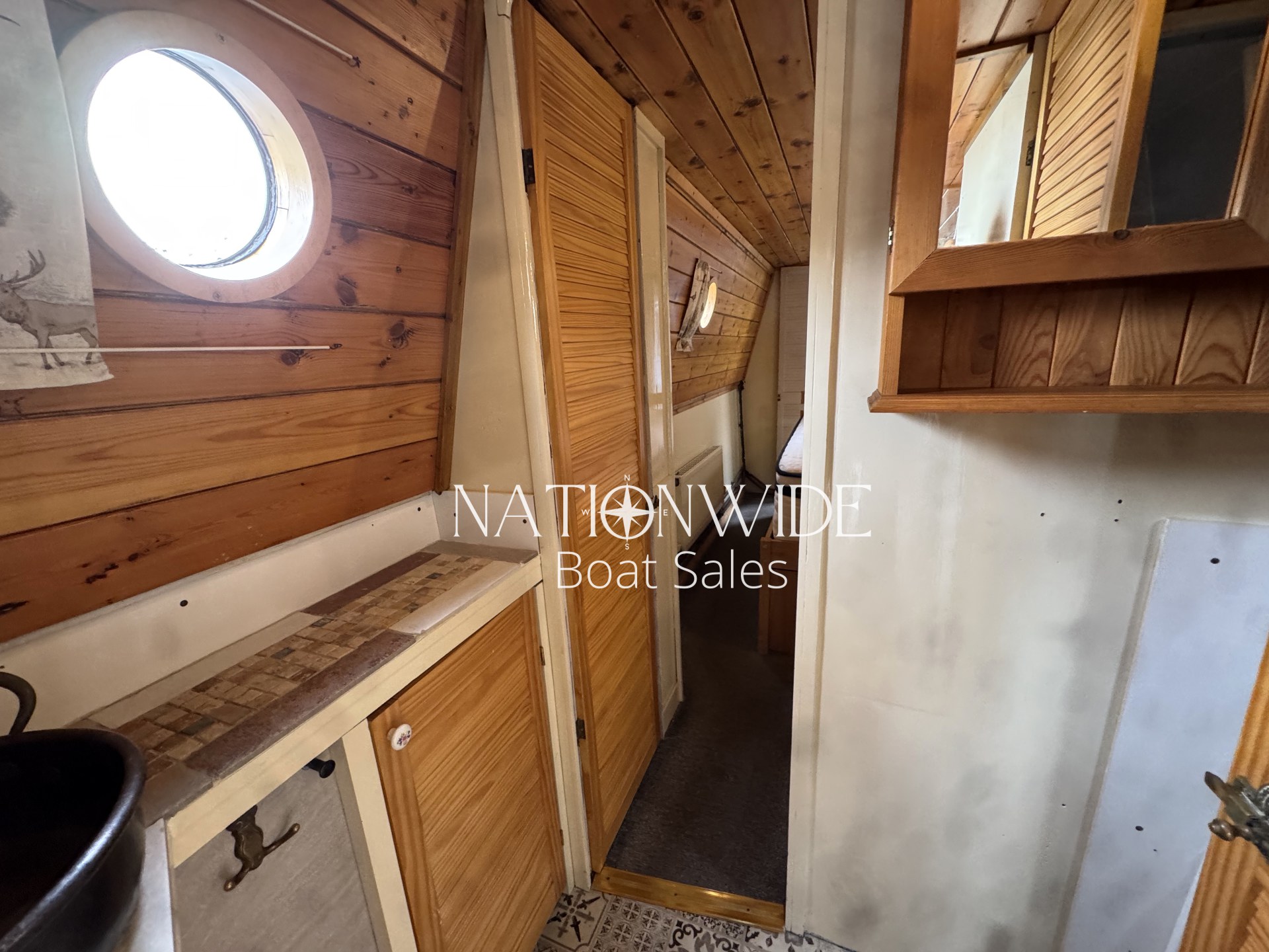 Inside, the galley is well-equipped with a 12v Shoreline fridge, Statesman cooker, Hoover washing machine, and solid oak worktops, adding warmth and character to this stunning boat. The walkthrough bathroom features a Thetford cassette toilet and a vanity basin.