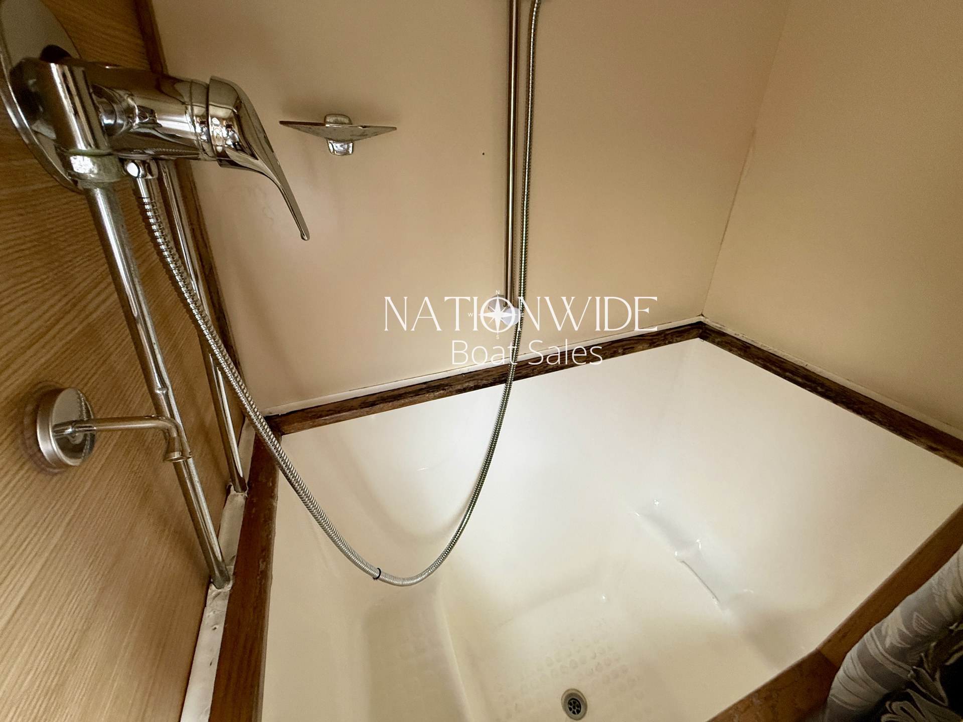 The bathroom includes a pump-out toilet, vanity basin and a hip bath with shower, providing all the essentials for extended cruising or liveaboard life. Heating and hot water are supplied via a calorifier, immersion and Eberspacher system, complemented by a Morso Squirrel stove for cosy evenings aboard.