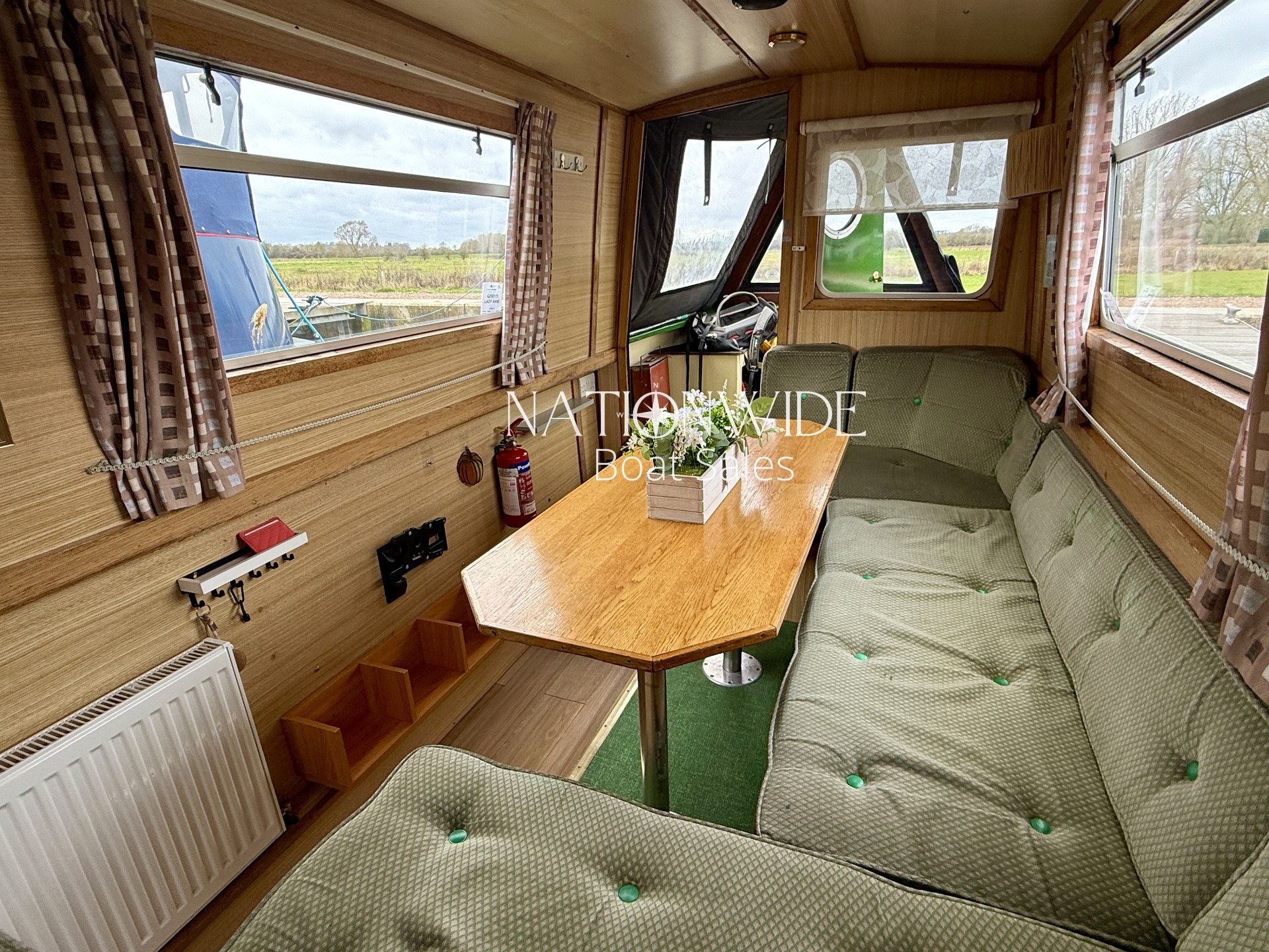 Inside, the boat offers comfortable accommodation for up to six berths, including two doubles that can be configured as singles, along with an L-shaped dinette providing additional sleeping space. The galley features laminate worktops, a Calor cooker and a 12v SIA fridge, creating a practical and well-equipped cooking area.