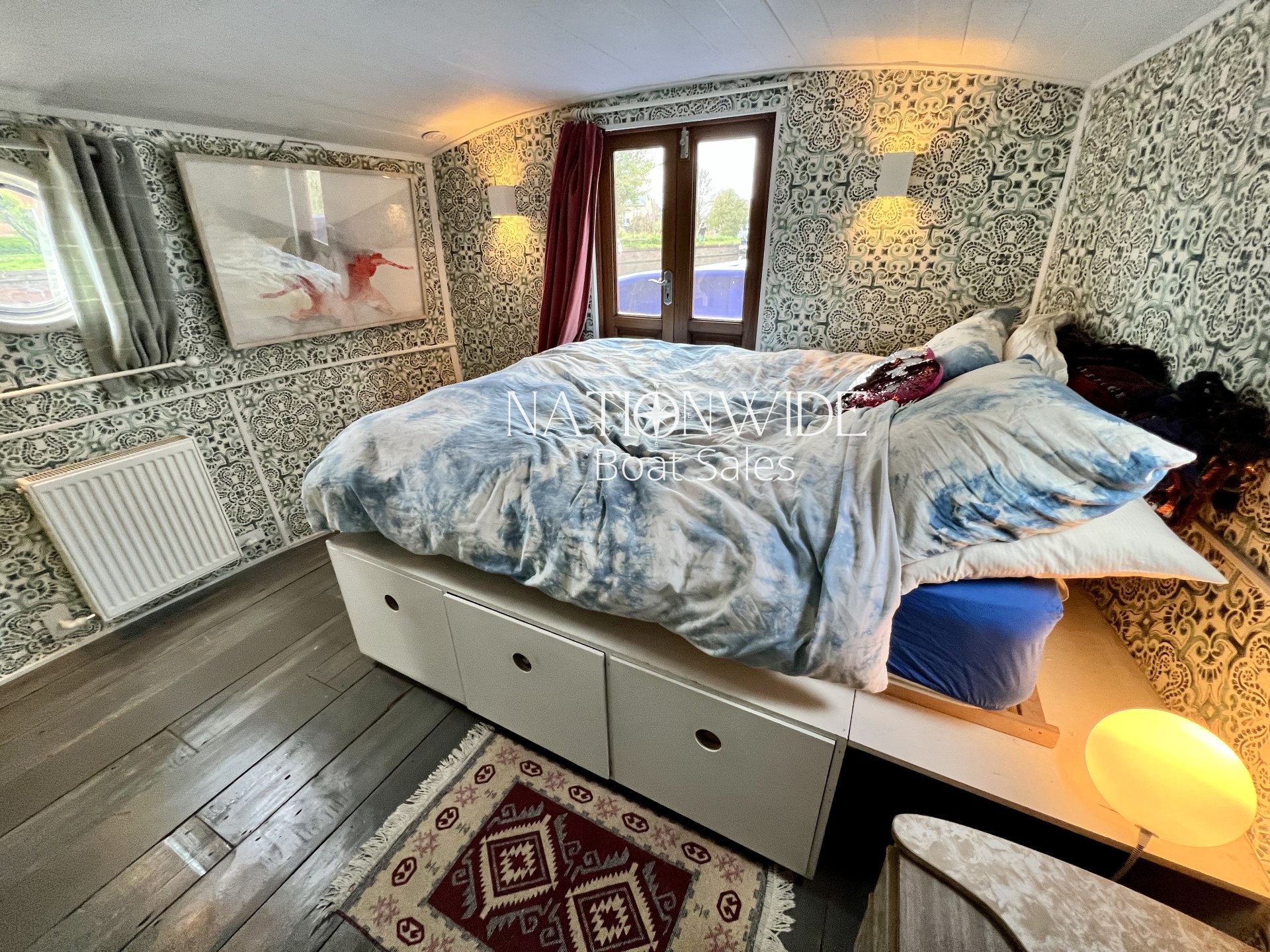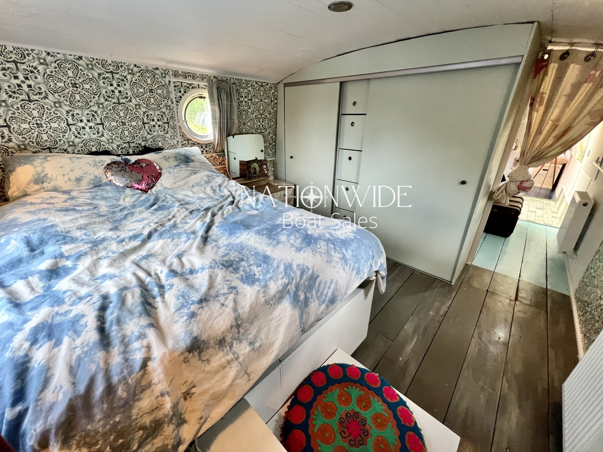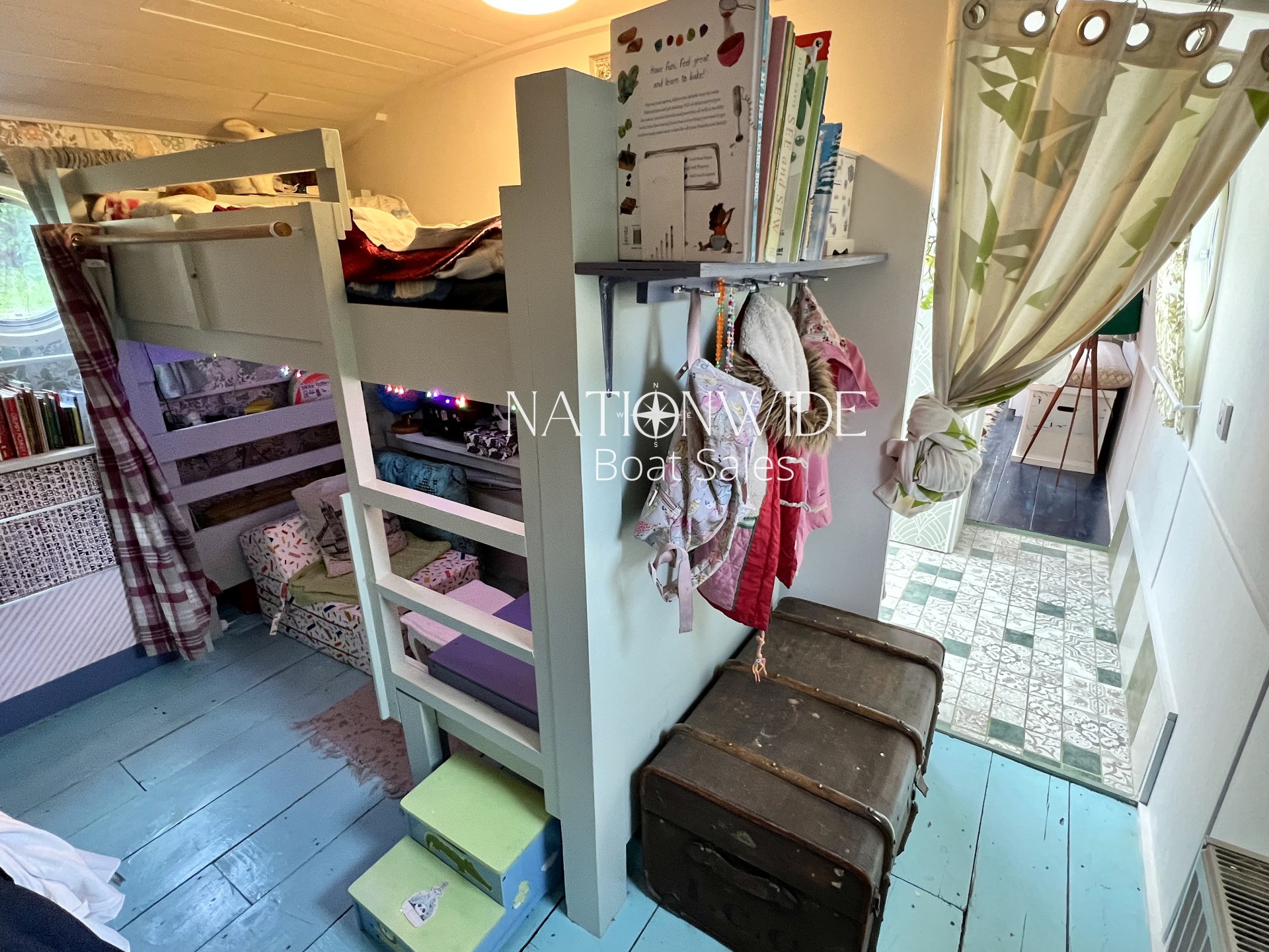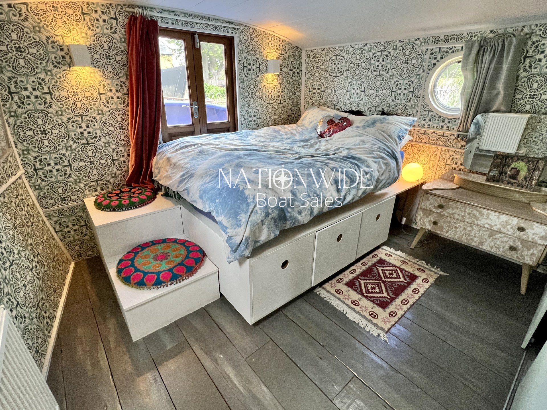 Upon entering we first find the open and spacious galley area offering a cooker, Shoreline fridge with freezer compartment and a double Belfast sink. Following through the saloon onto the bathroom where we find a compost toilet, bath with shower over, vanity basin and Hoover washing machine. We then come to the bedrooms, firstly we come to the second bedroom with a custom-built single bunk. Next, we have the master. Bedroom which offers a custom king size bed with underbed storage.