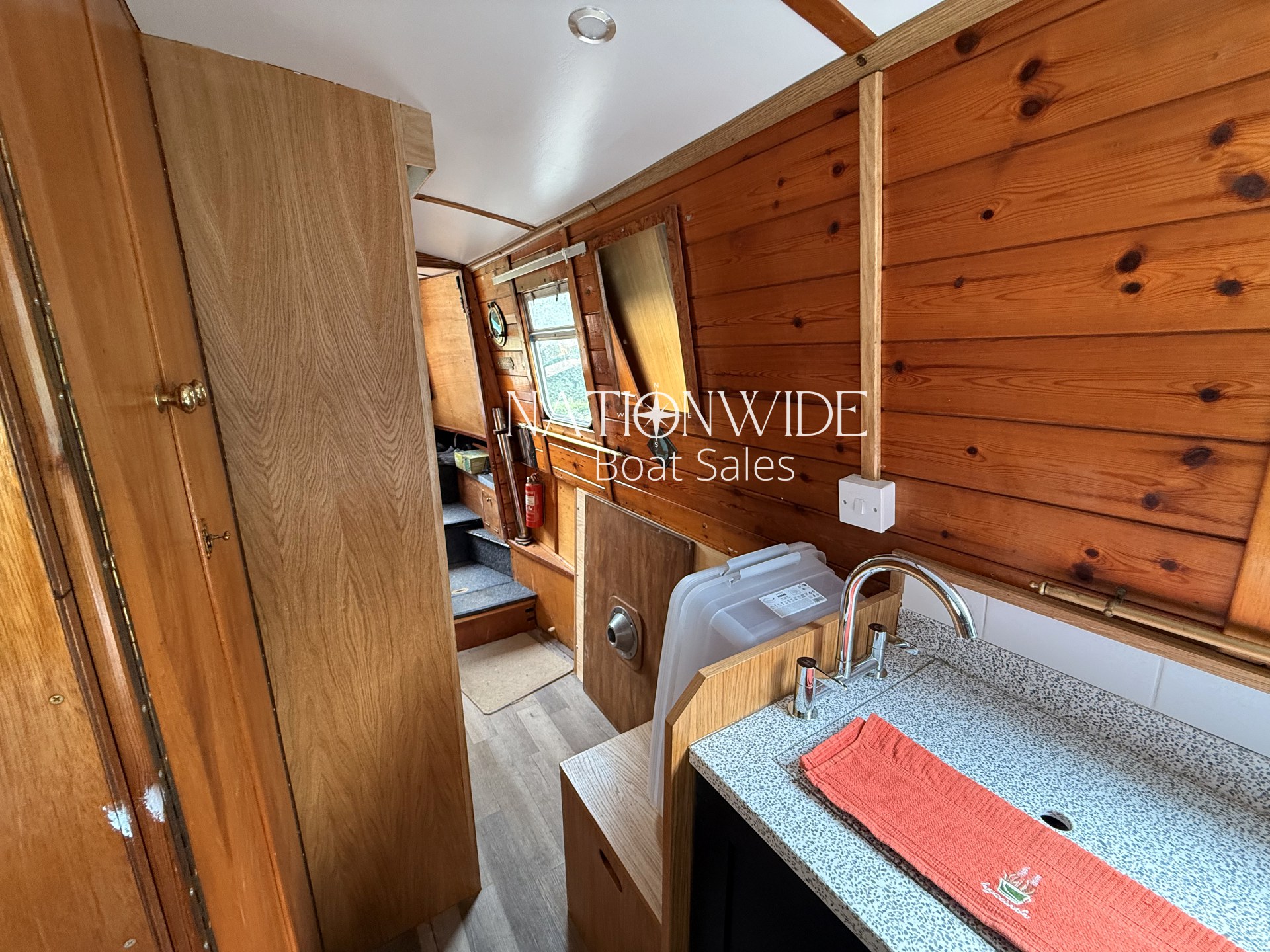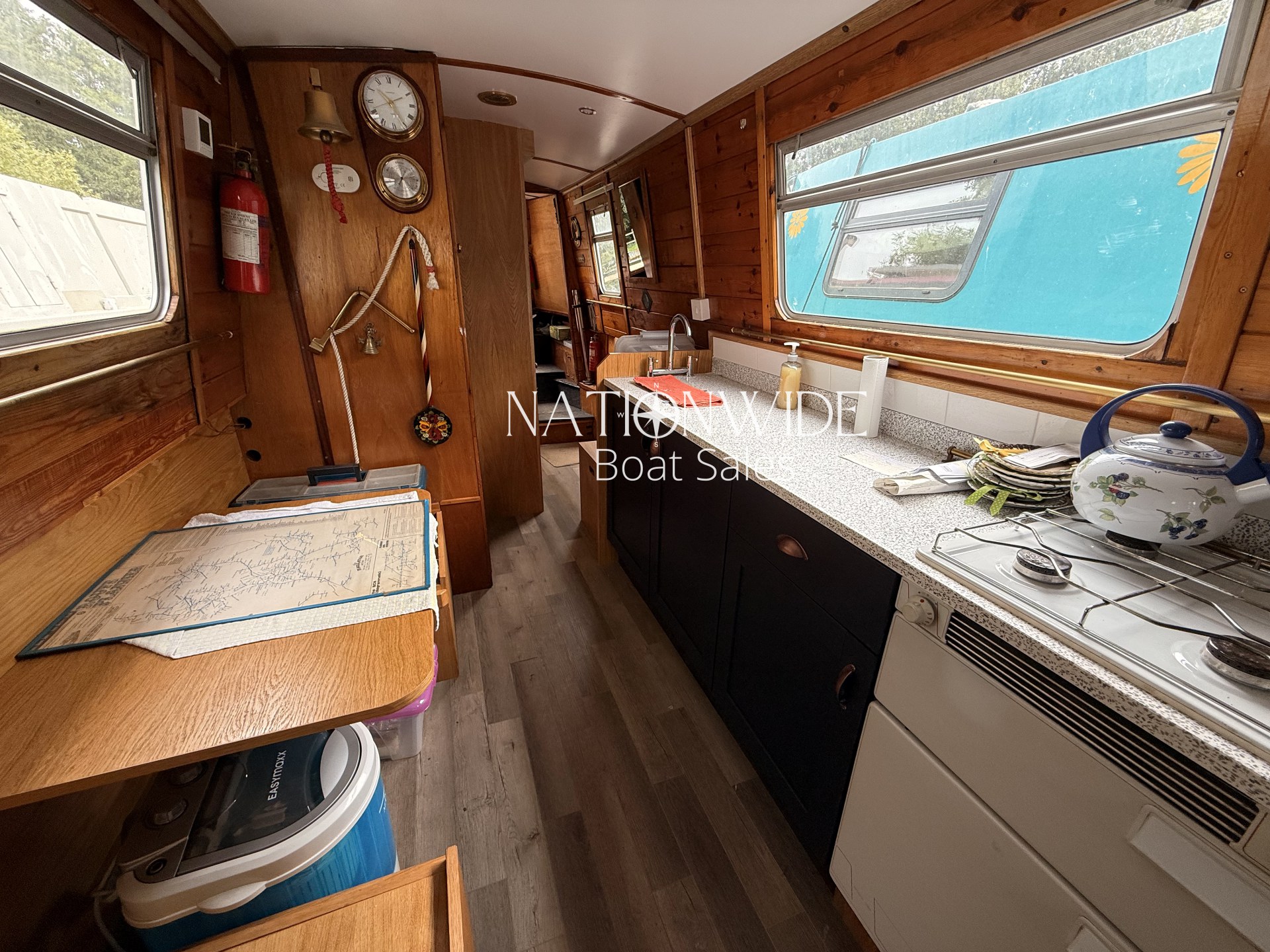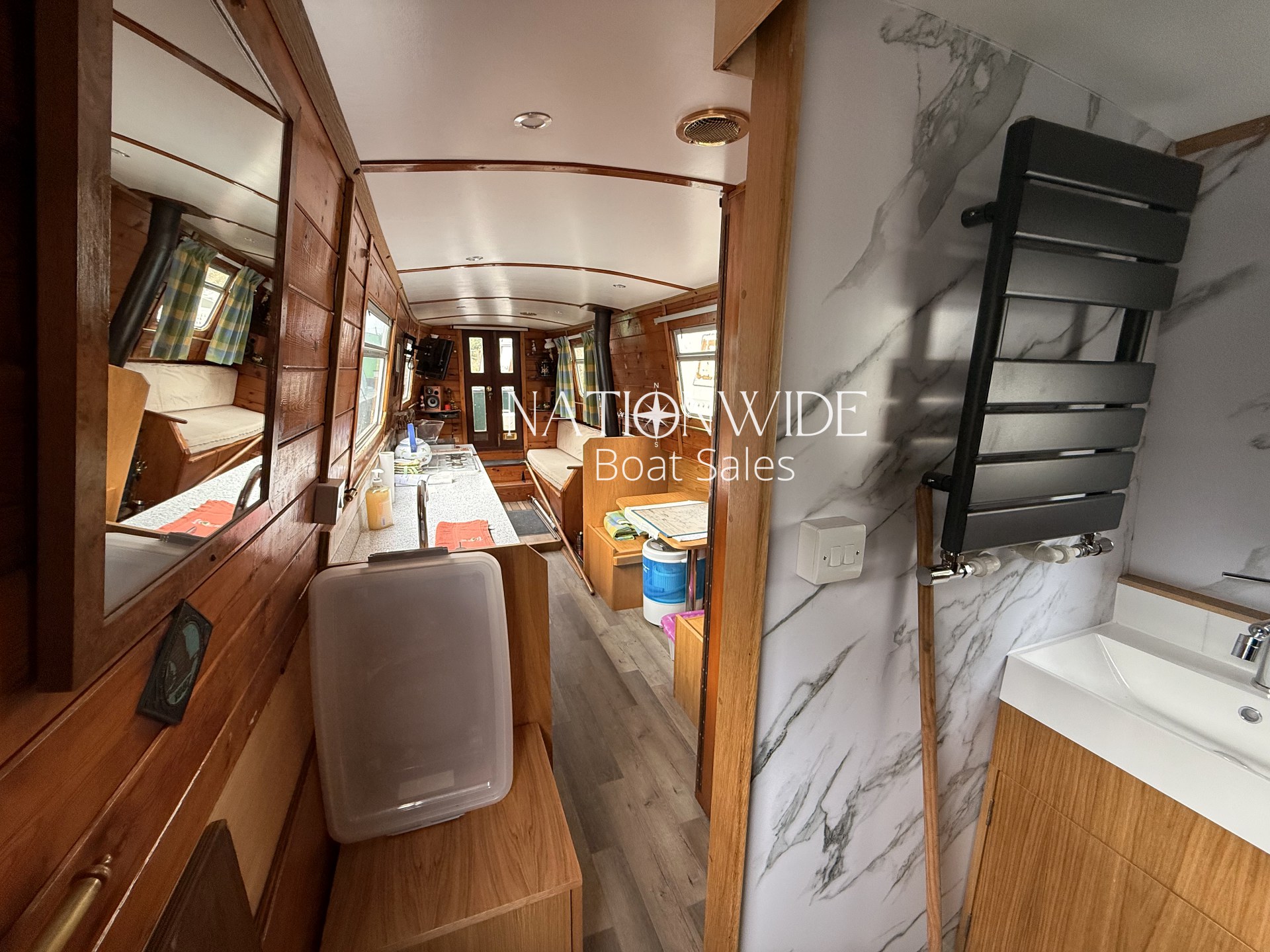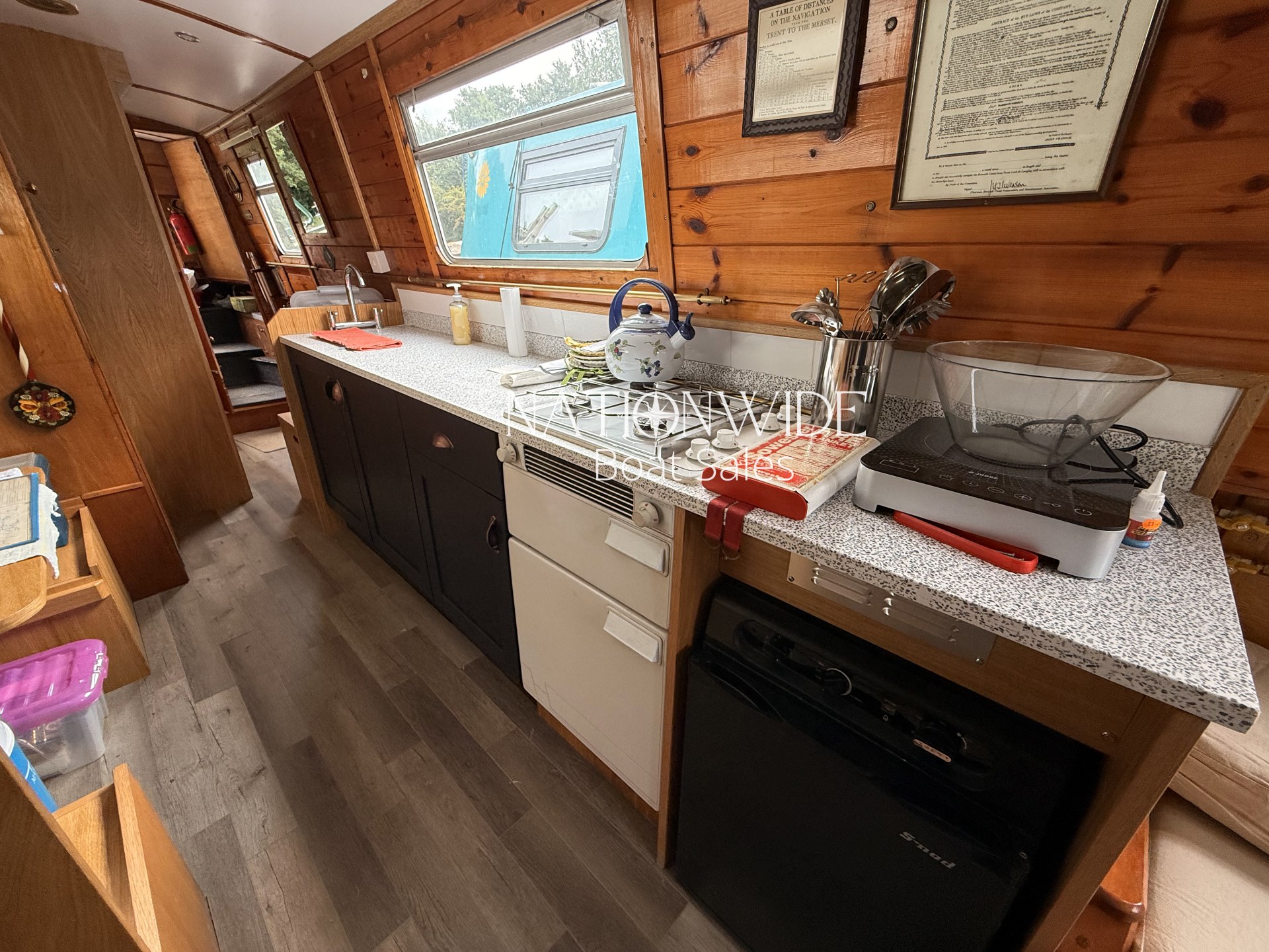 On board, the interior is finished with tongue and groove cabin sides and laminate flooring, complemented by polystyrene insulation. The galley is equipped with a Vanette cooker and Snod fridge, making meal preparation simple and efficient. A newly fitted bathroom provides a shower and vanity basin, ensuring modern convenience on the cut.