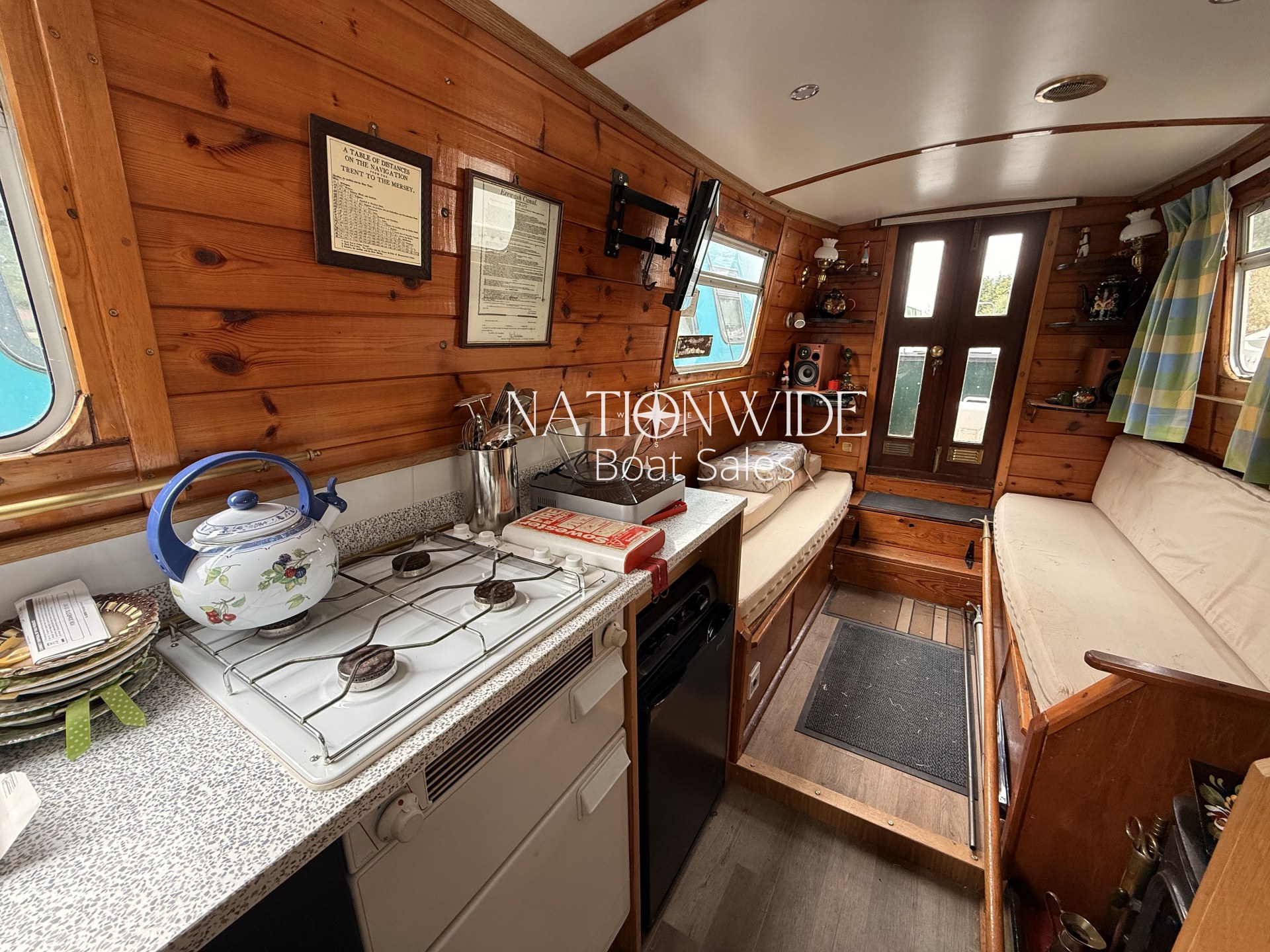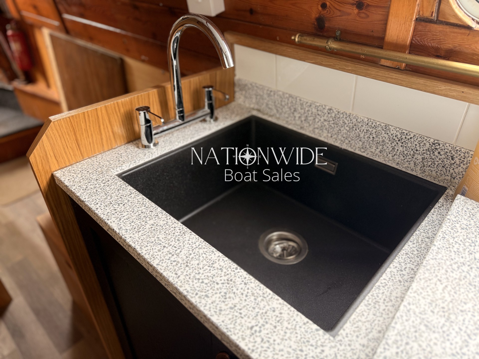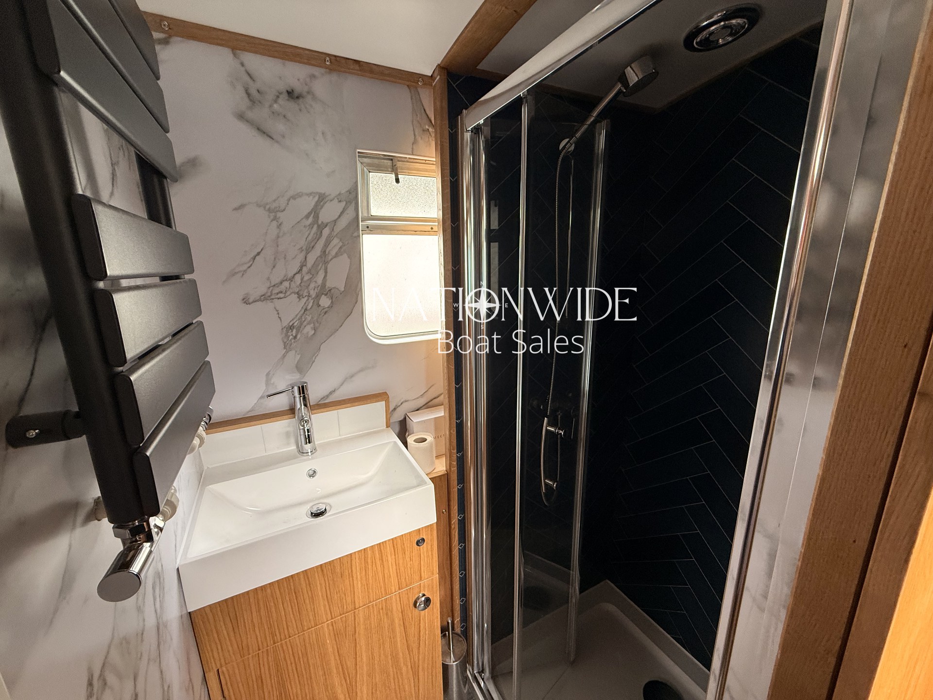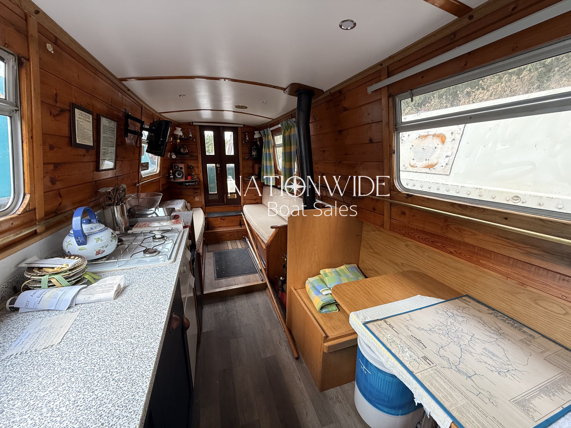 On board, the interior is finished with tongue and groove cabin sides and laminate flooring, complemented by polystyrene insulation. The galley is equipped with a Vanette cooker and Snod fridge, making meal preparation simple and efficient. A newly fitted bathroom provides a shower and vanity basin, ensuring modern convenience on the cut.