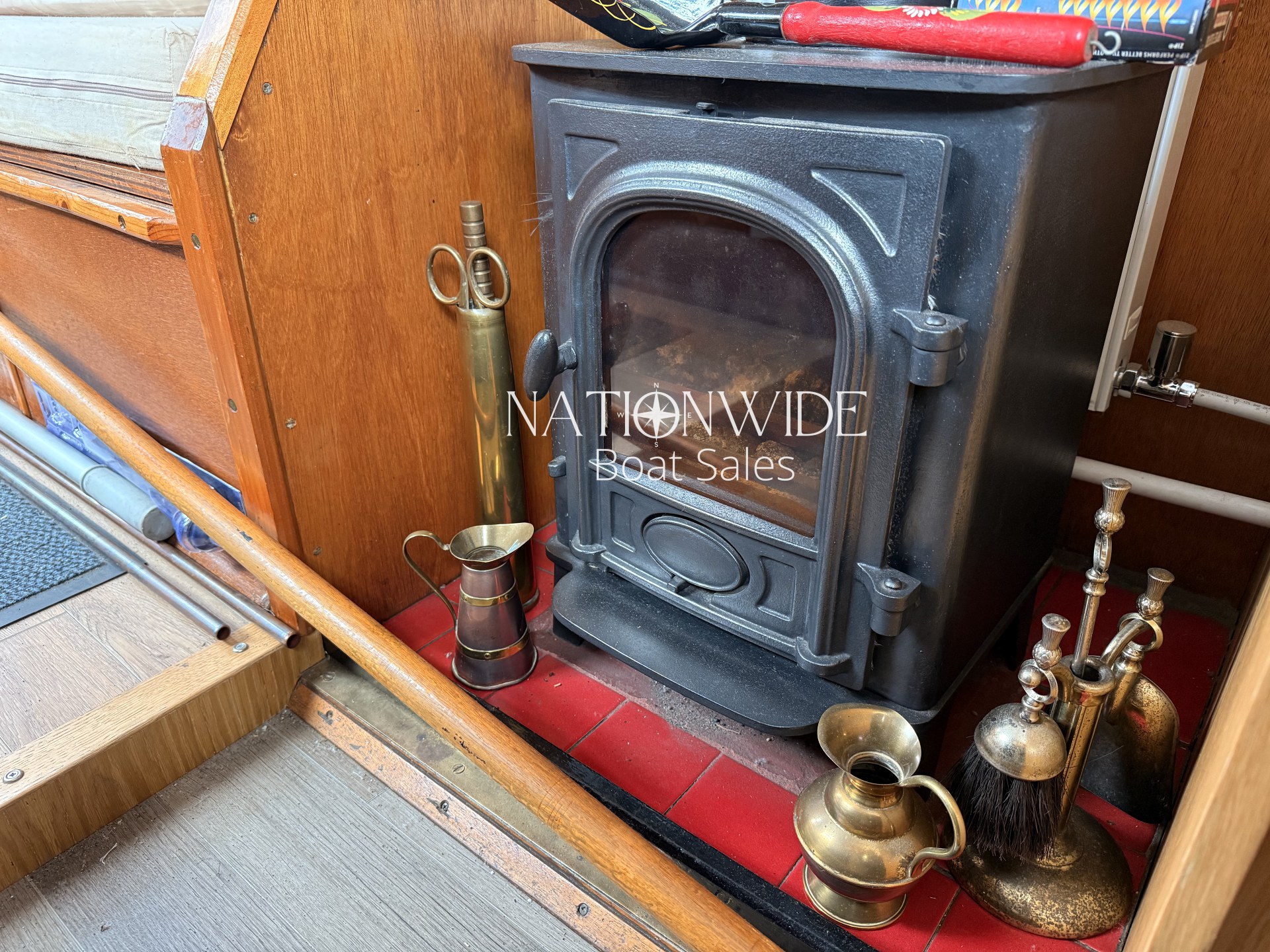 Comfort is enhanced by a solid fuel stove alongside Webasto central heating and calorifier-fed hot water, keeping the boat warm year-round. Electrical systems include both 12v and 240v supplies, a 1700w inverter, and two solar panels supporting one starter and two leisure batteries, allowing for extended time away from shore power.