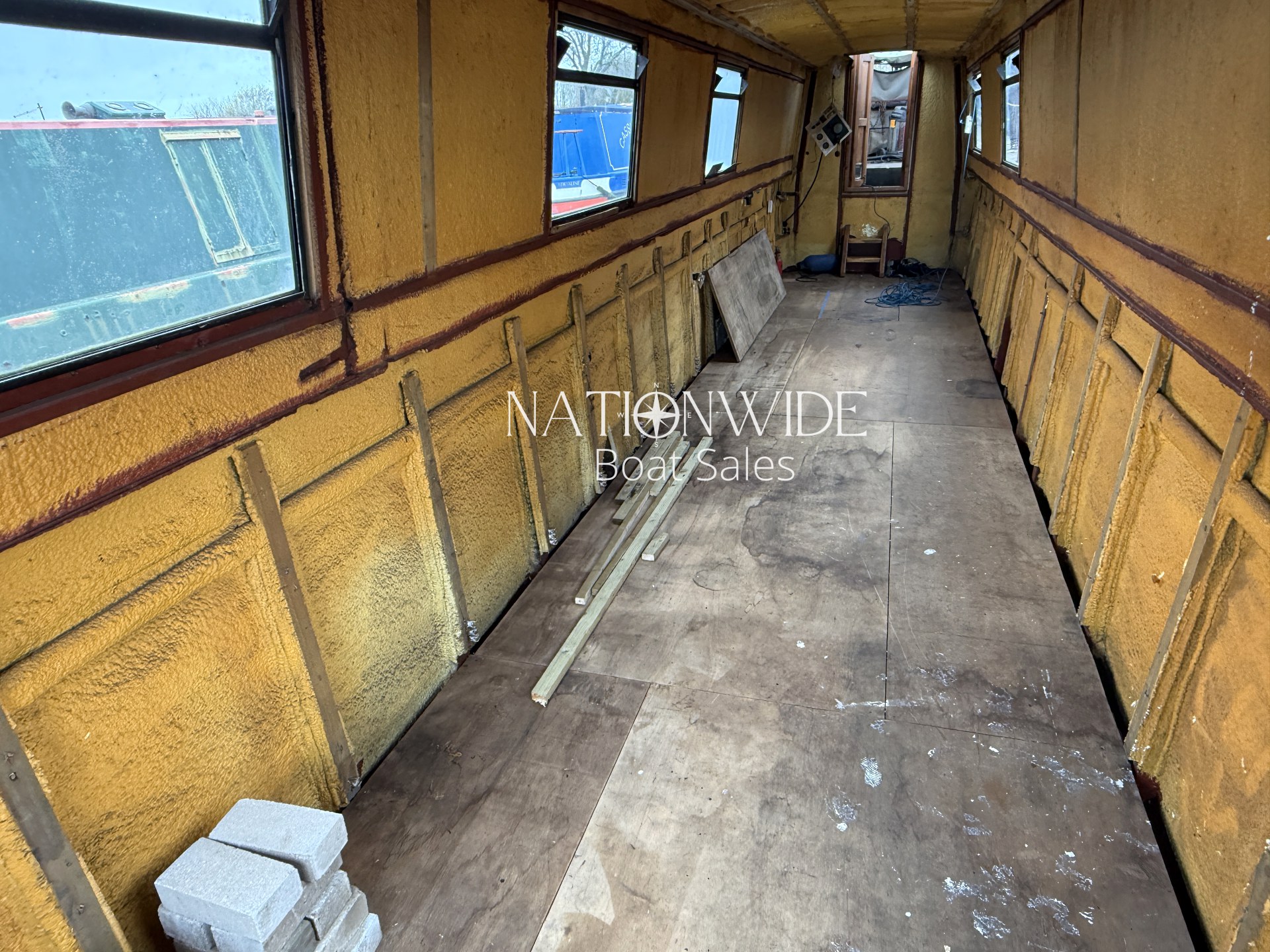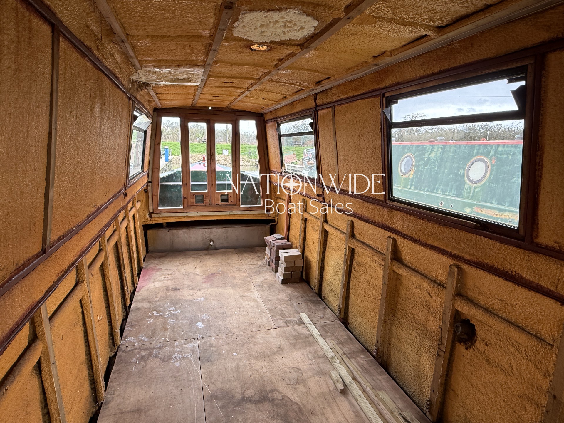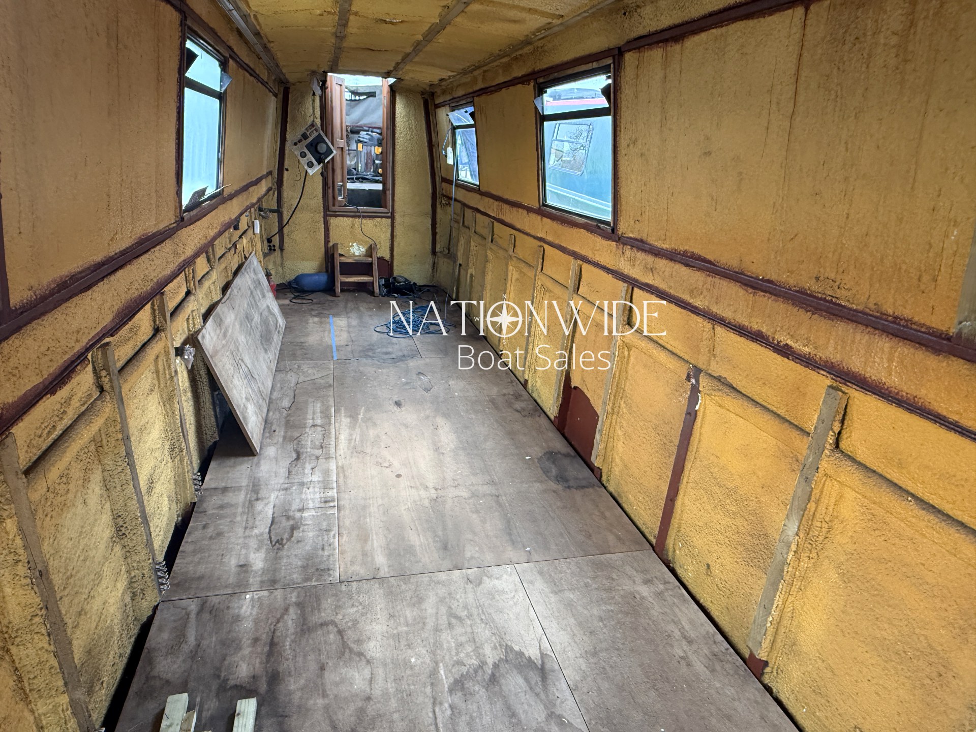 Internally, the boat has been taken back to insulation, allowing the next owner to plan and install their own layout from scratch. This makes her an ideal project for someone wanting to create their dream narrowboat without the need to remove an existing interior. With marine ply flooring already in place and top-opening windows fitted, the foundations are set for a full custom fit-out.