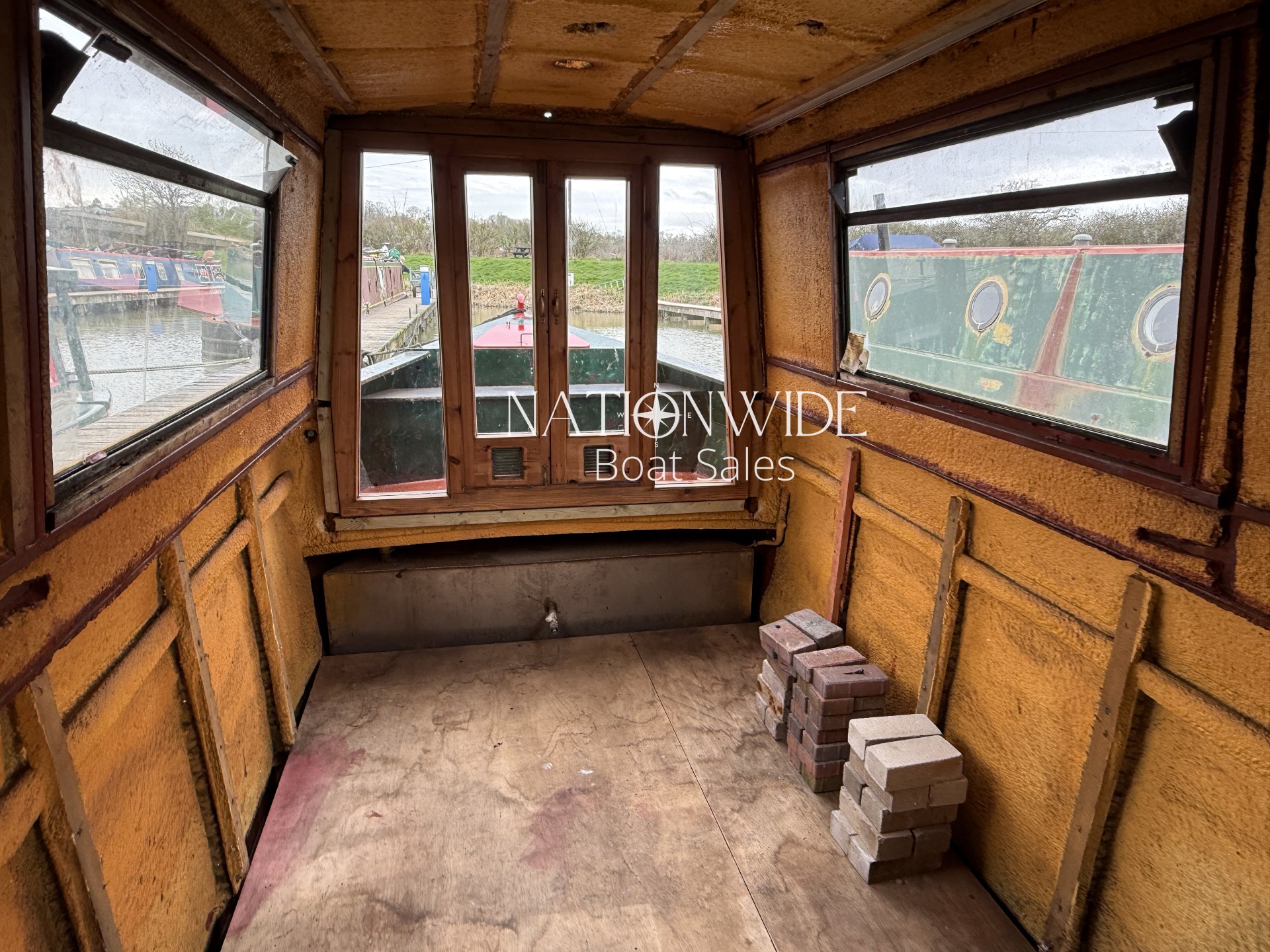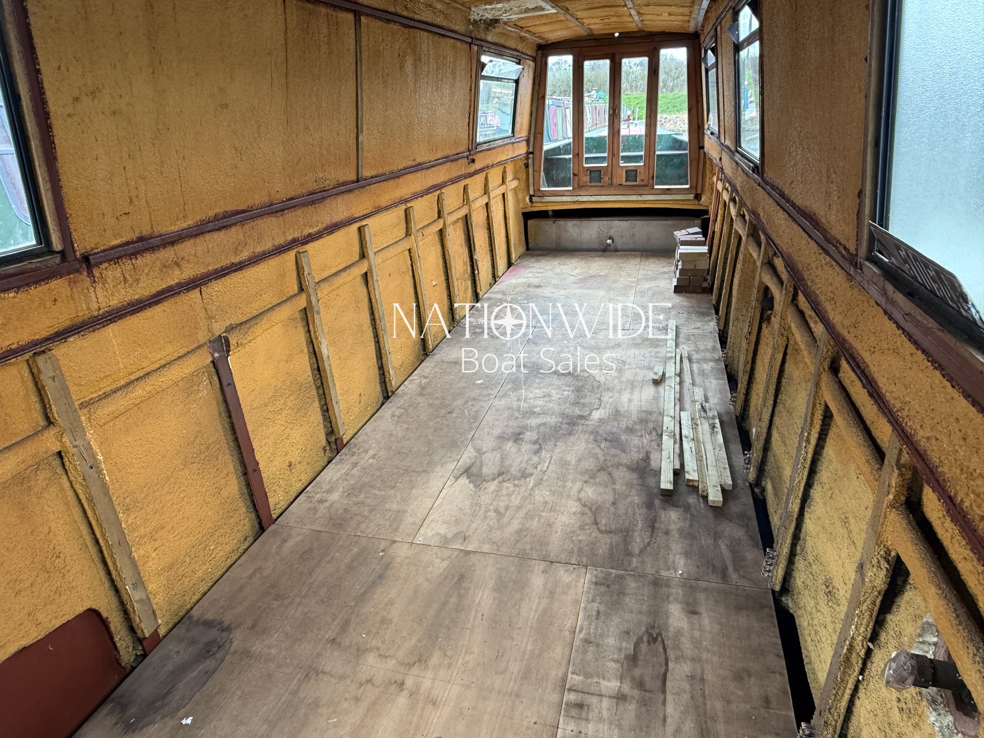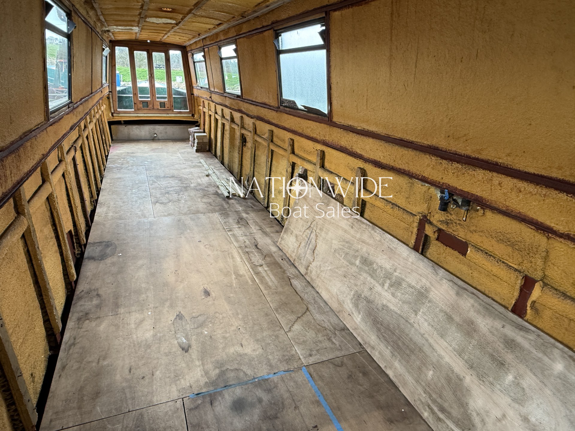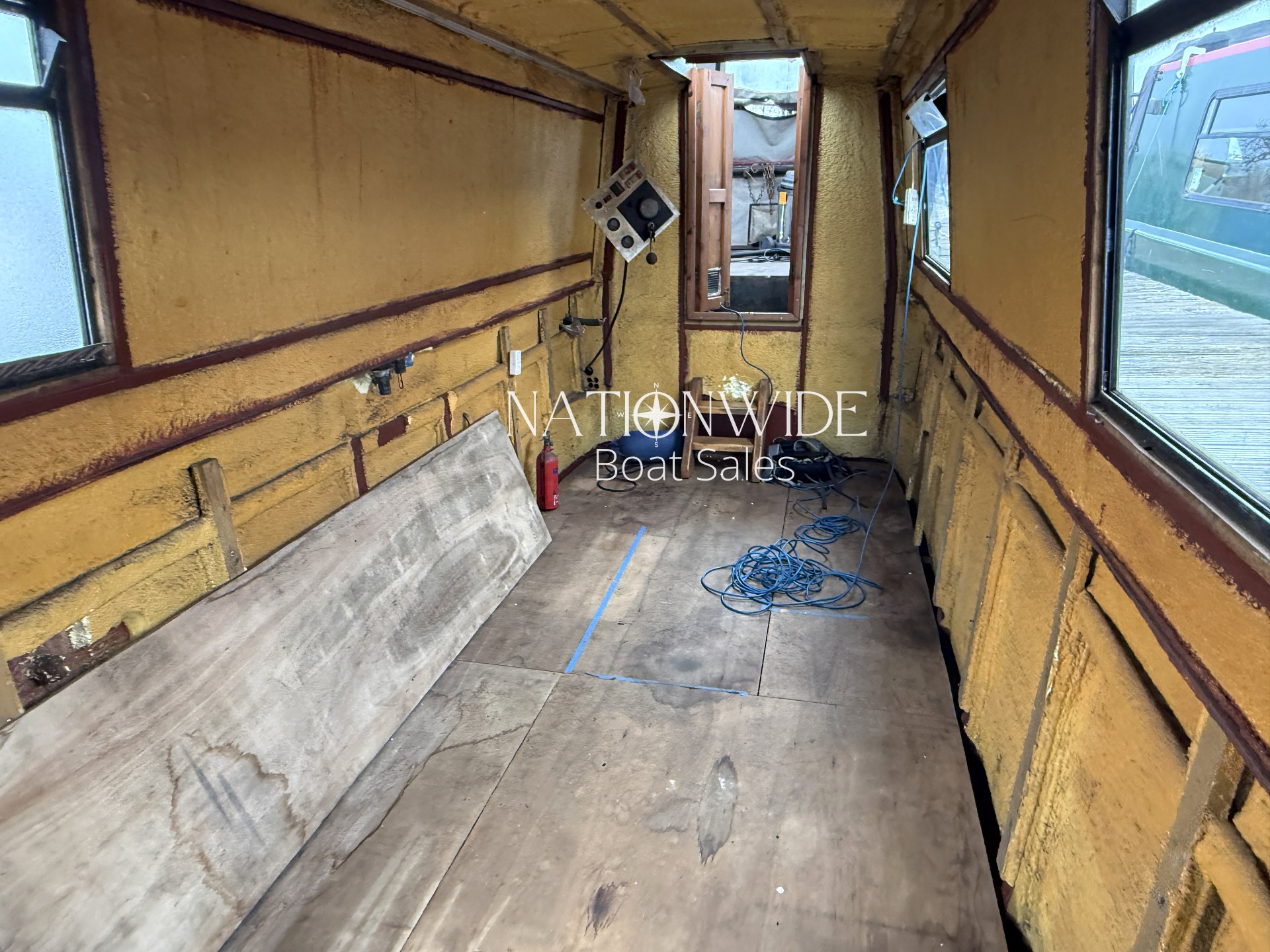 Internally, the boat has been taken back to insulation, allowing the next owner to plan and install their own layout from scratch. This makes her an ideal project for someone wanting to create their dream narrowboat without the need to remove an existing interior. With marine ply flooring already in place and top-opening windows fitted, the foundations are set for a full custom fit-out.