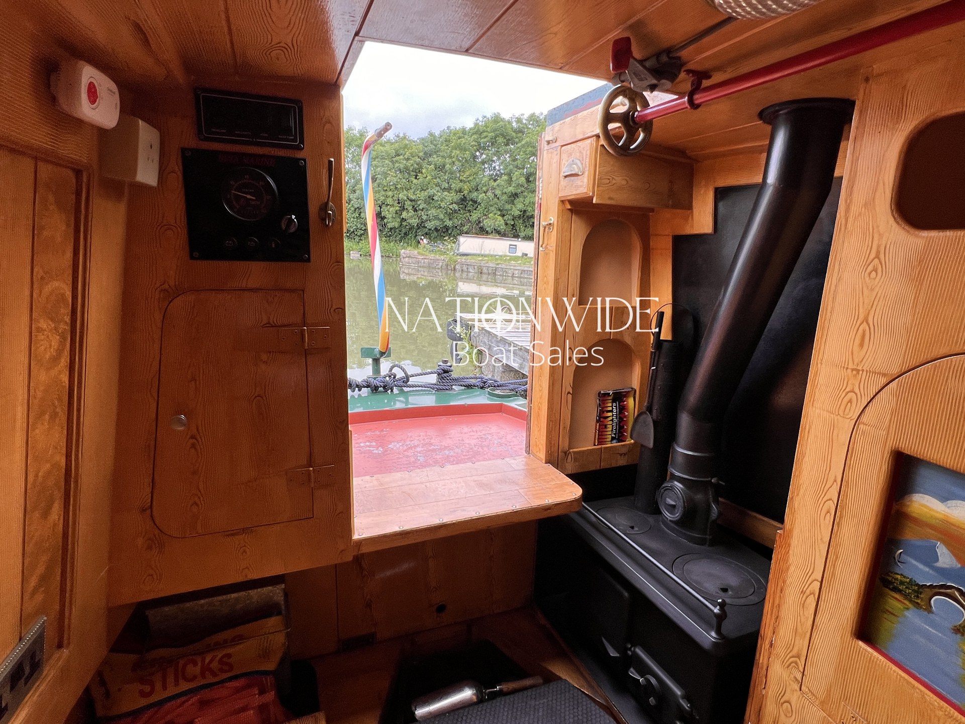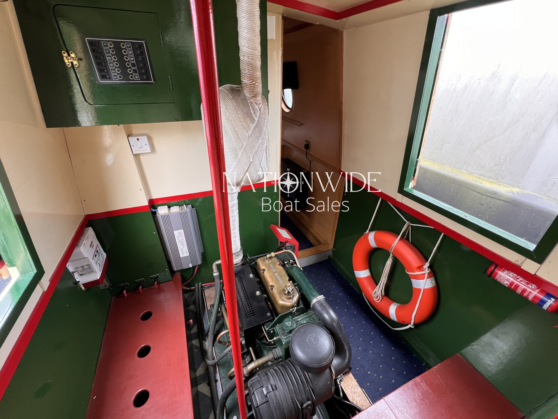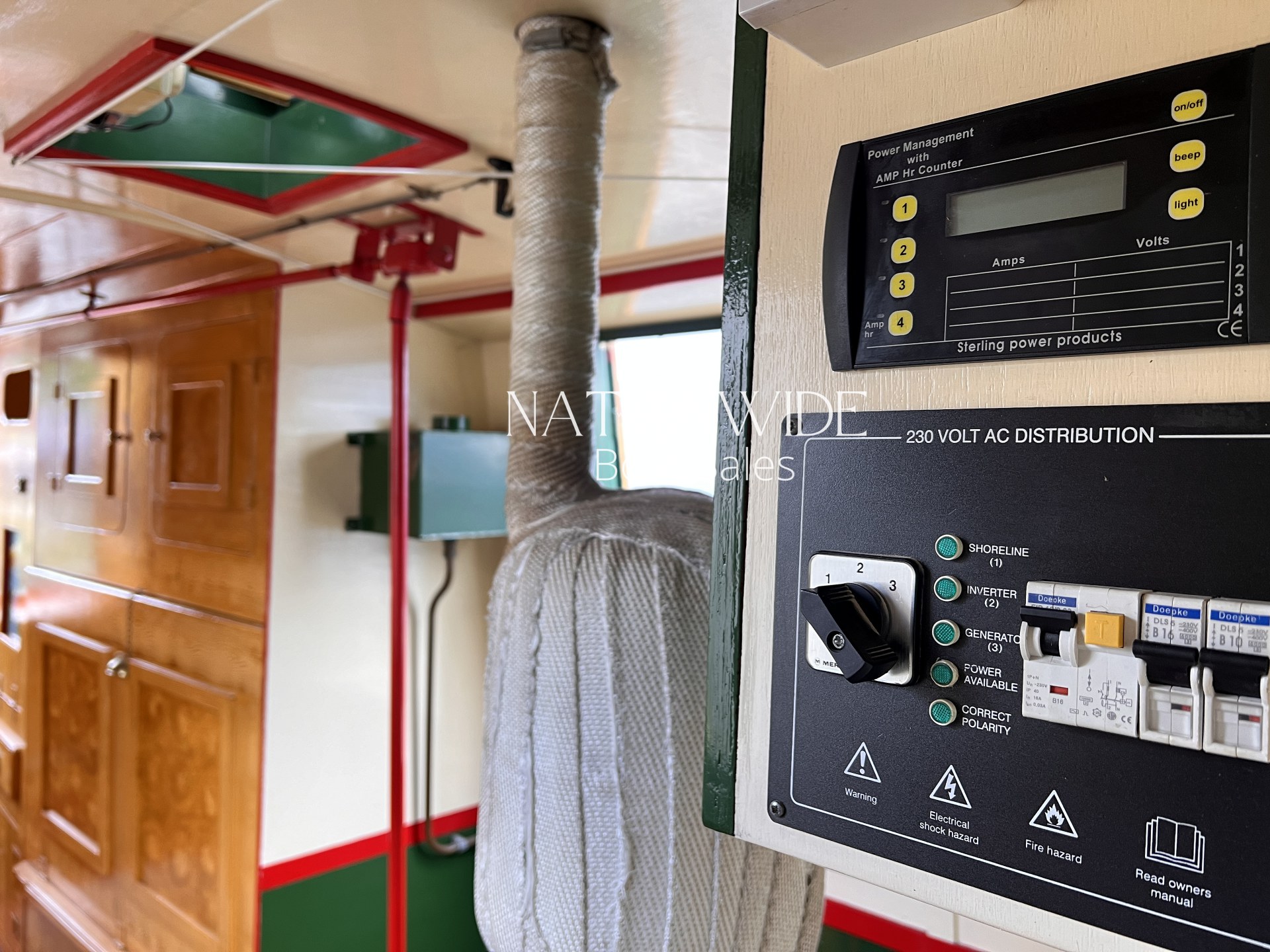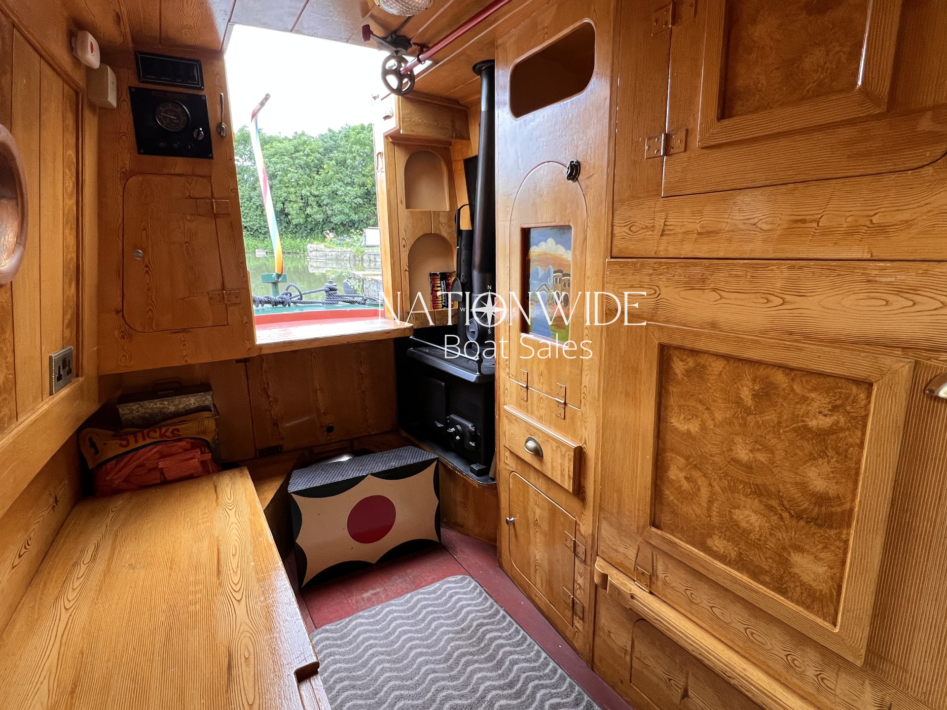 Heating and hot water are well catered for, with a calorifier, immersion, and back boiler feeding into two stoves – a Bubble diesel and a traditional Boatman – creating a cosy atmosphere for year-round cruising. Electrical systems include both 12v and 240v supplies, supported by a Sterling 1800w inverter and a bank of four leisure batteries (new in 2025), alongside a starter battery.