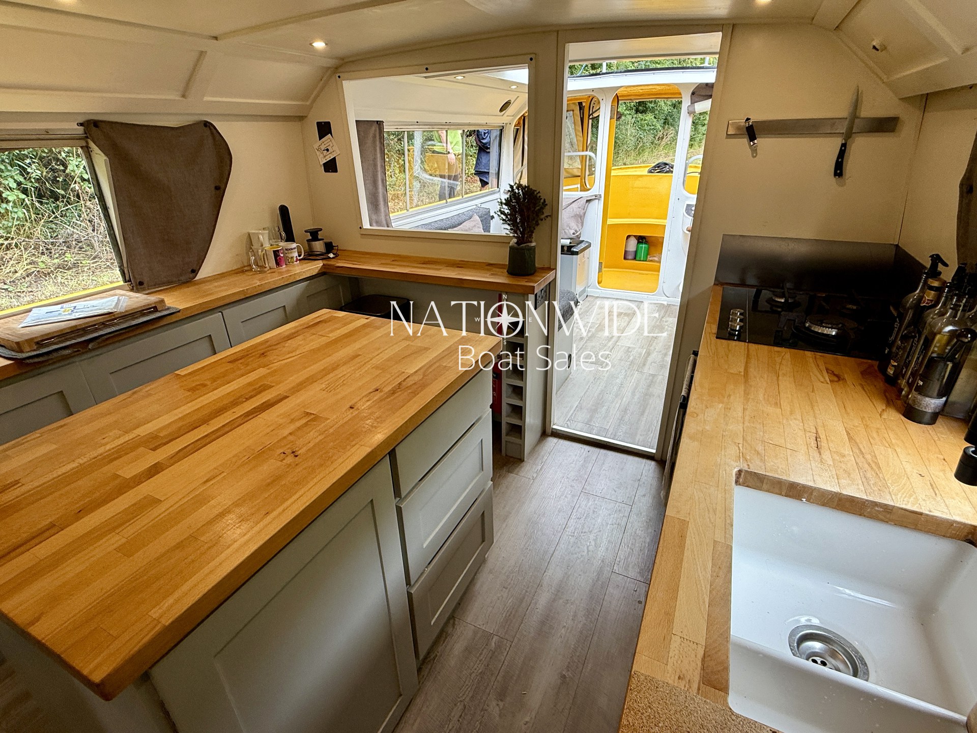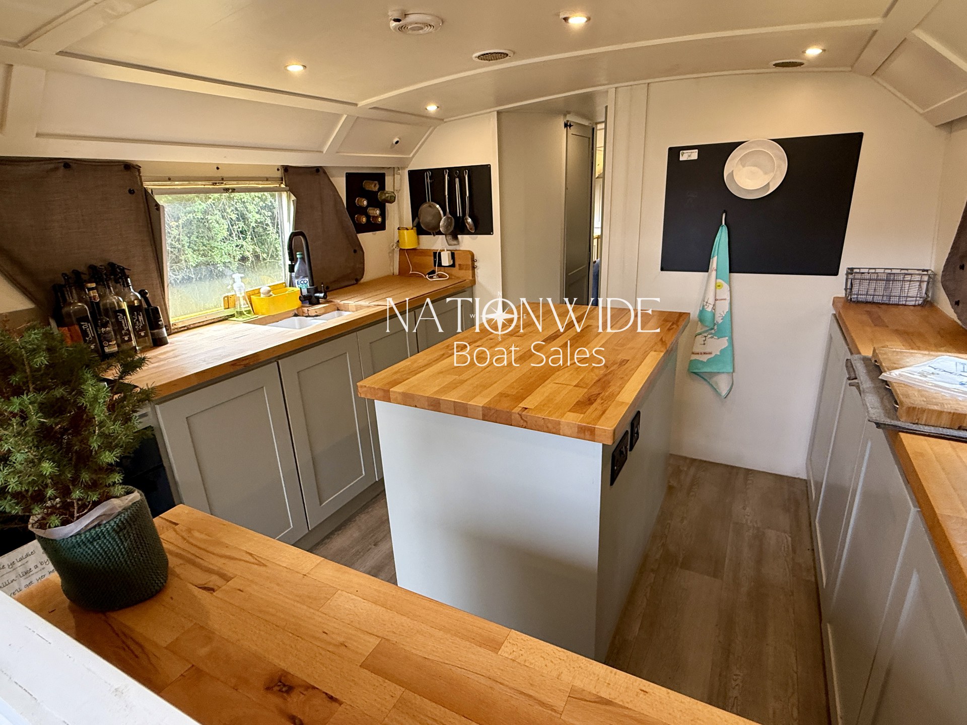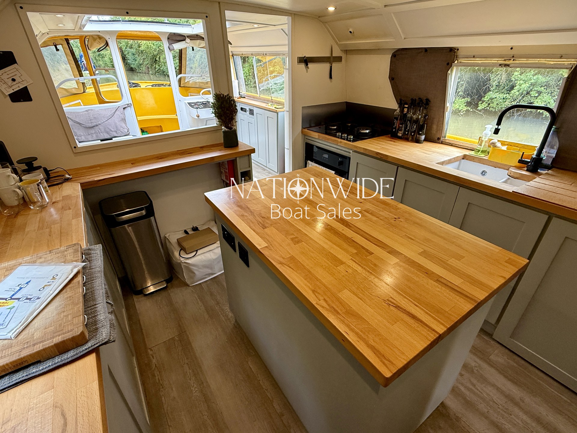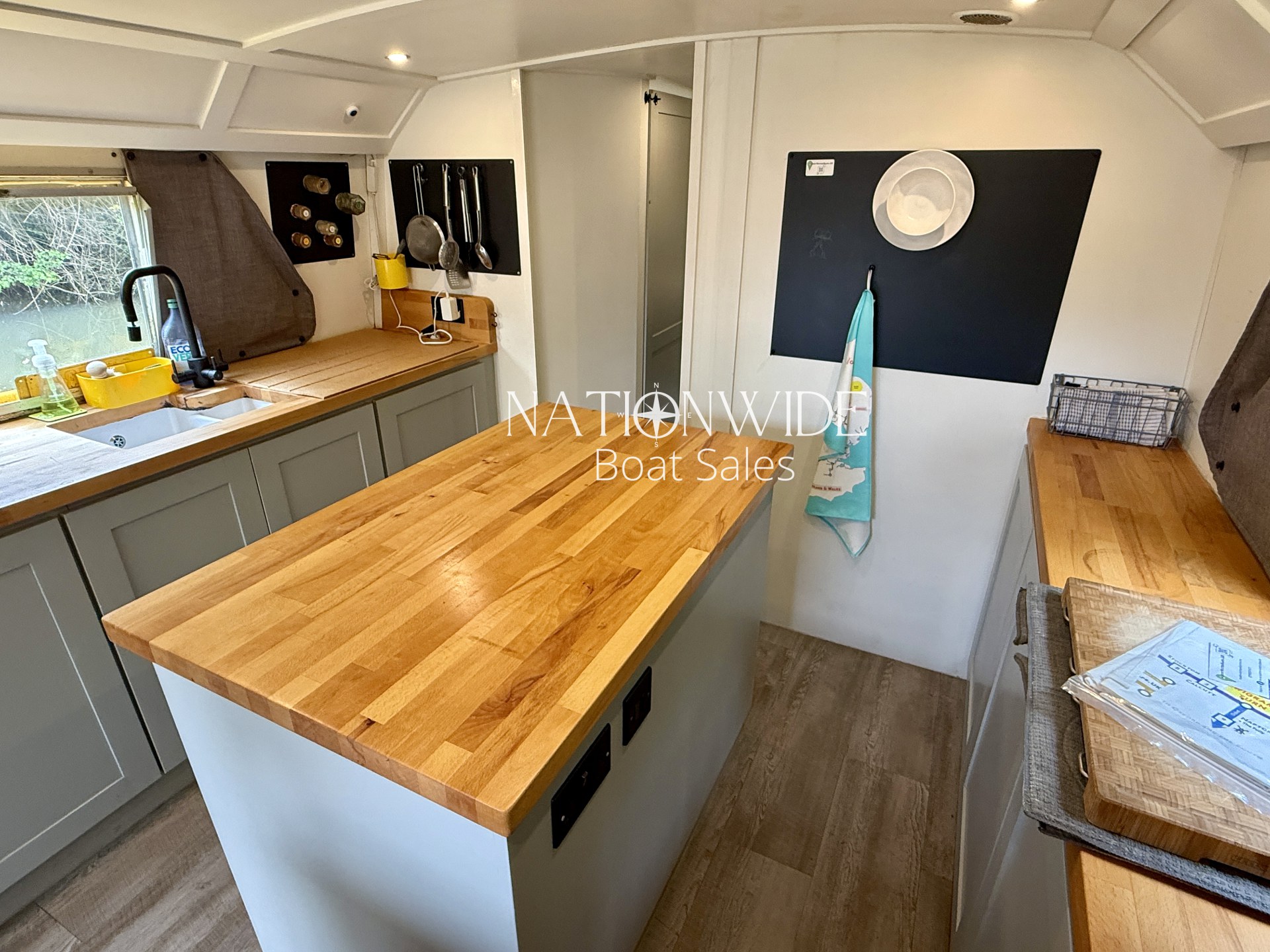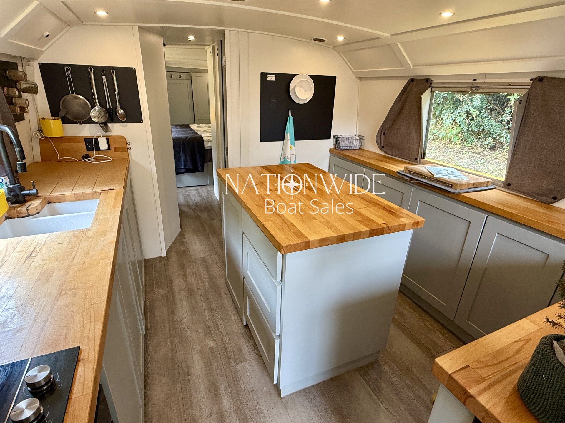 Constructed with a GRP hull, Roobarb offers generous light with an open feel throughout. Inside, you’ll find modern touches like Karndean flooring, foil-backed quilted insulation, and beech butcher’s block worktops in the galley. Sliding and top-opening windows, along with a large retractable sunroof, provide ample natural light and ventilation. The bow covers can also be split for wind protection, offering adaptable outdoor comfort.