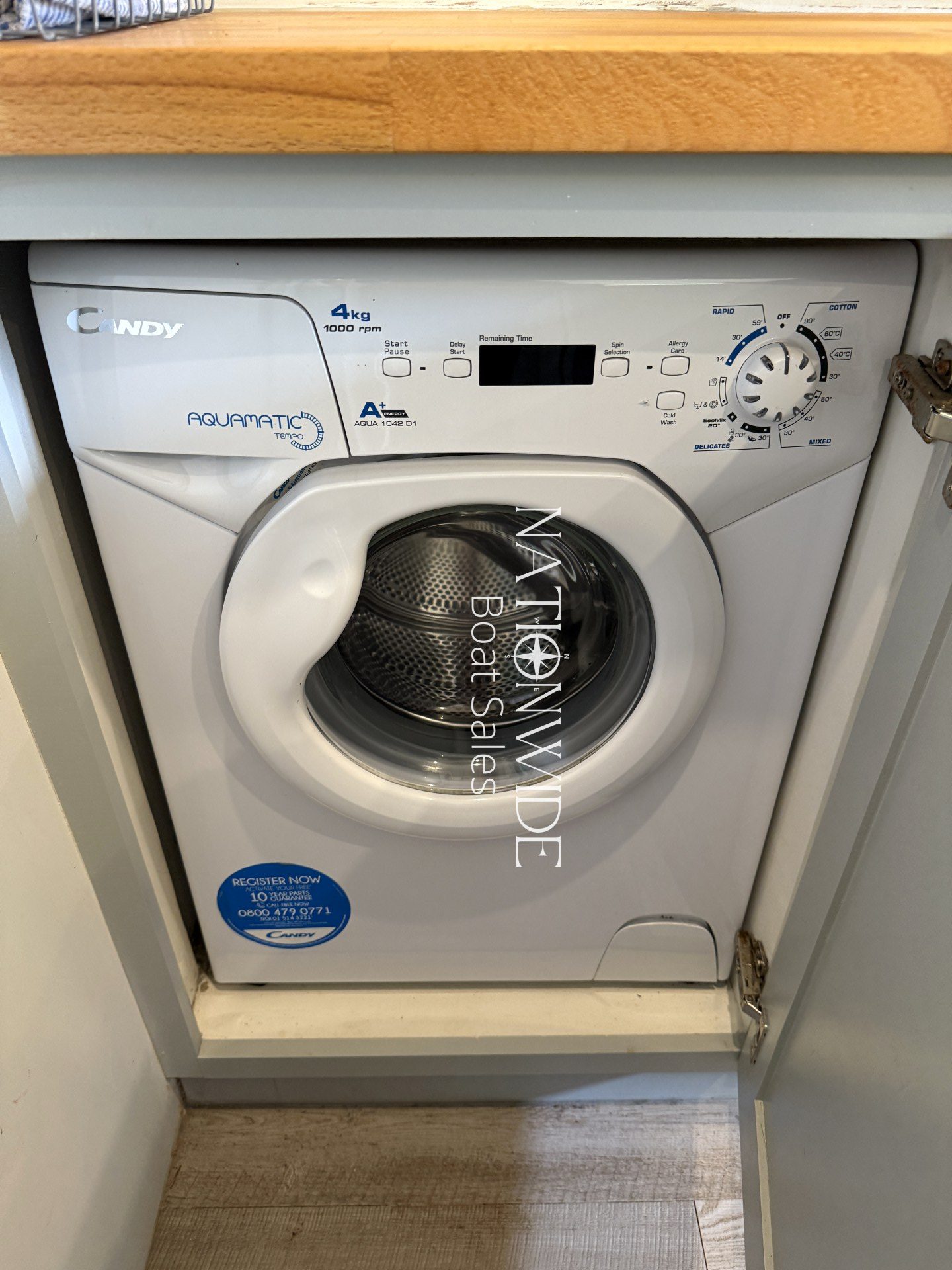 Accommodation is designed with comfort and practicality in mind. There are four berths: a fixed queen-size bed and a pull-out double in the saloon. The walkthrough bathroom features a Jabsco deluxe pump-out toilet, shower, and vanity basin. The galley includes a Stoves oven, Fisher Paykel three-ring hob featuring a 5kw burner, 240v fridge/freezer, and even a Candy washing machine — all the comforts of home, afloat.