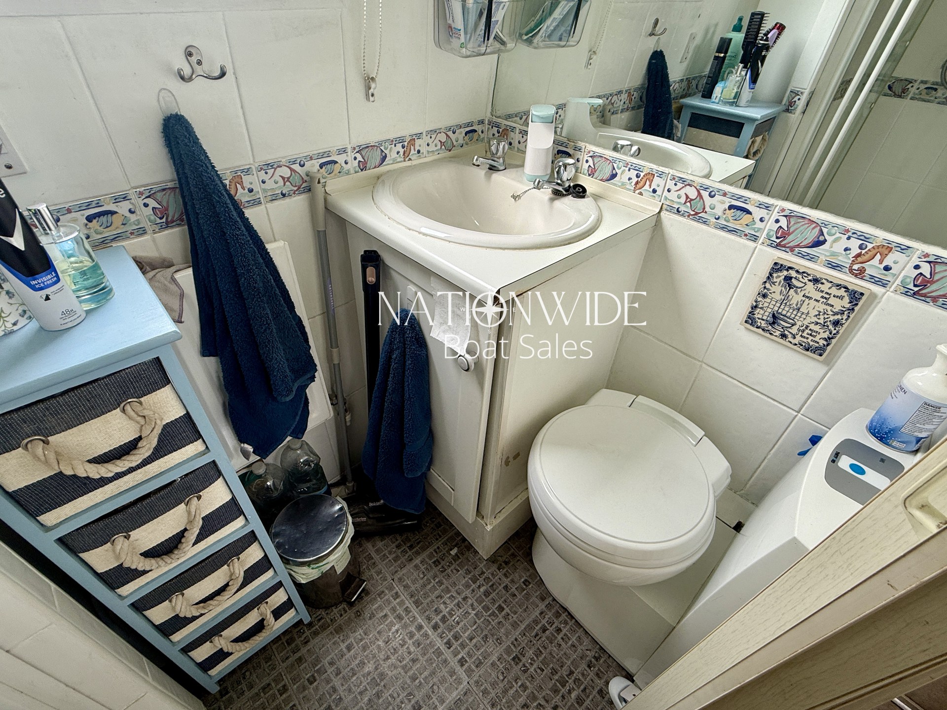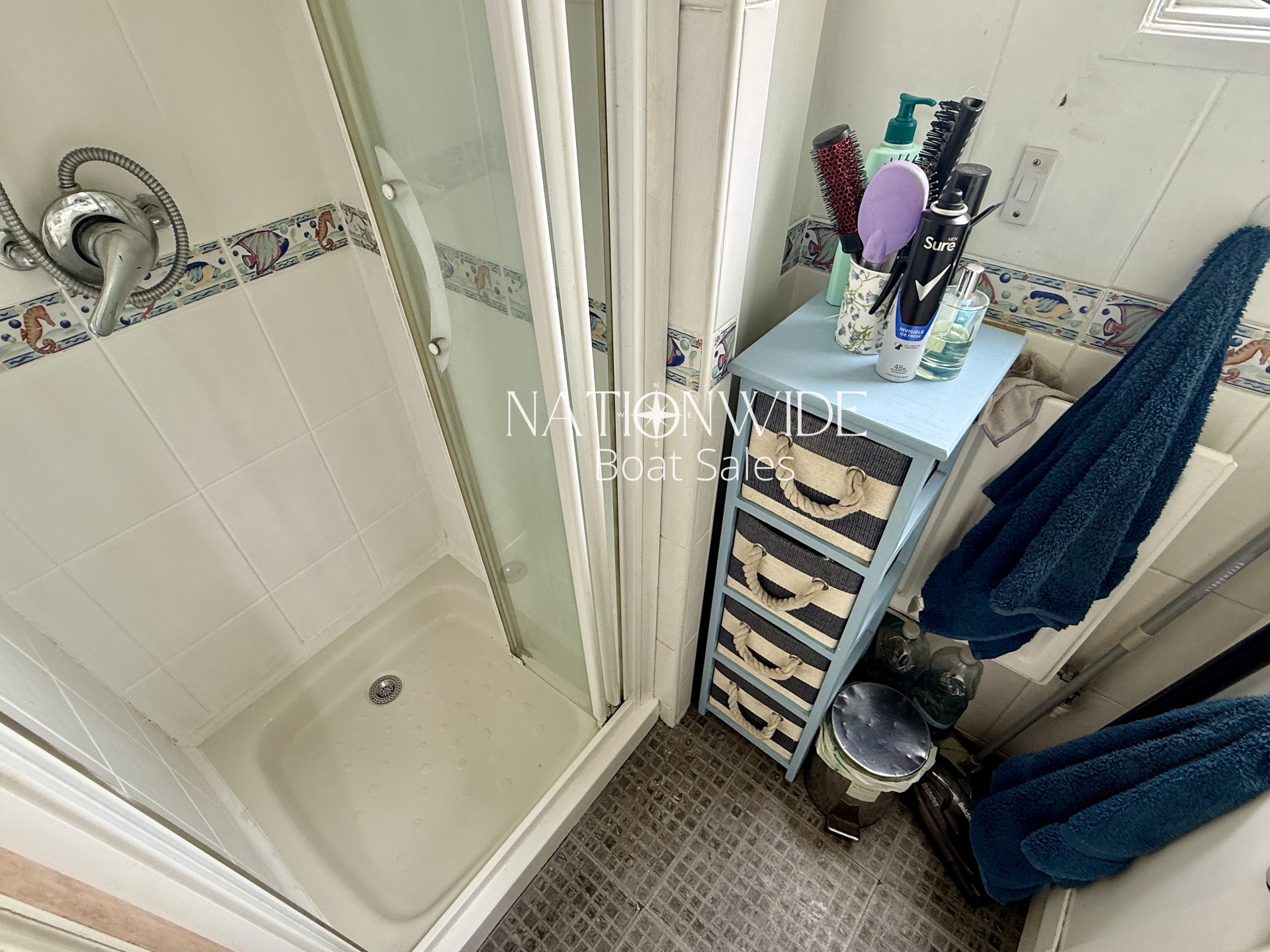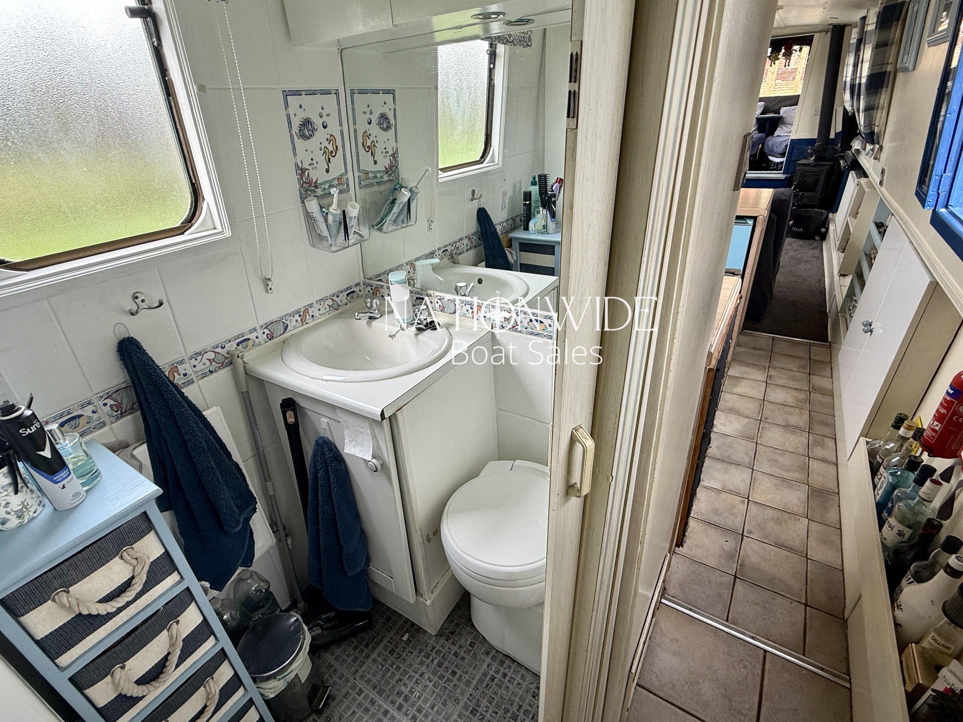 The bathroom includes a ceramic cassette toilet, shower, and vanity basin, offering convenient onboard facilities. Heating and hot water are well catered for with an Alde system, calorifier, immersion, and a solid fuel stove, ensuring the boat remains warm and cosy all year round. 🔥