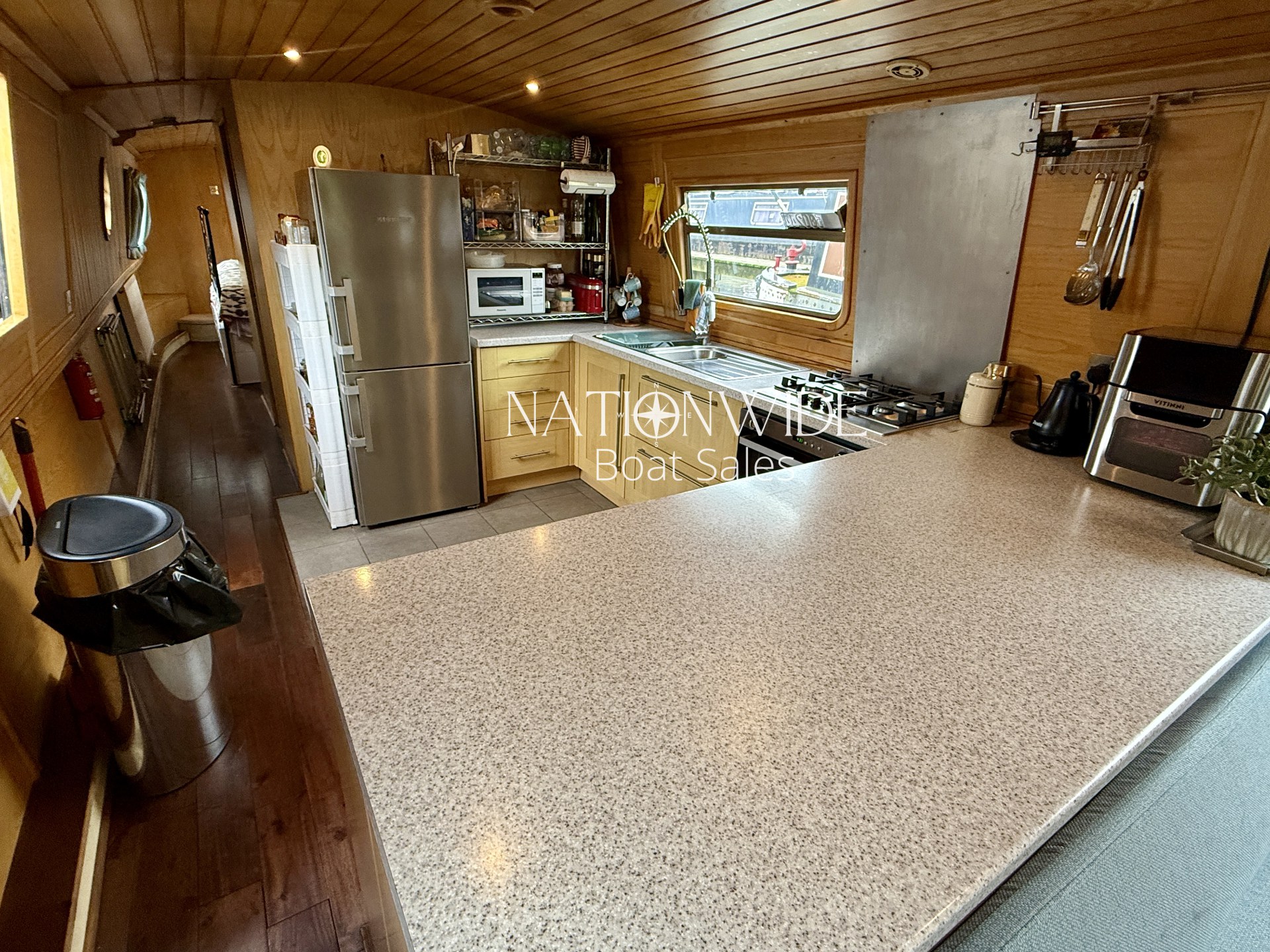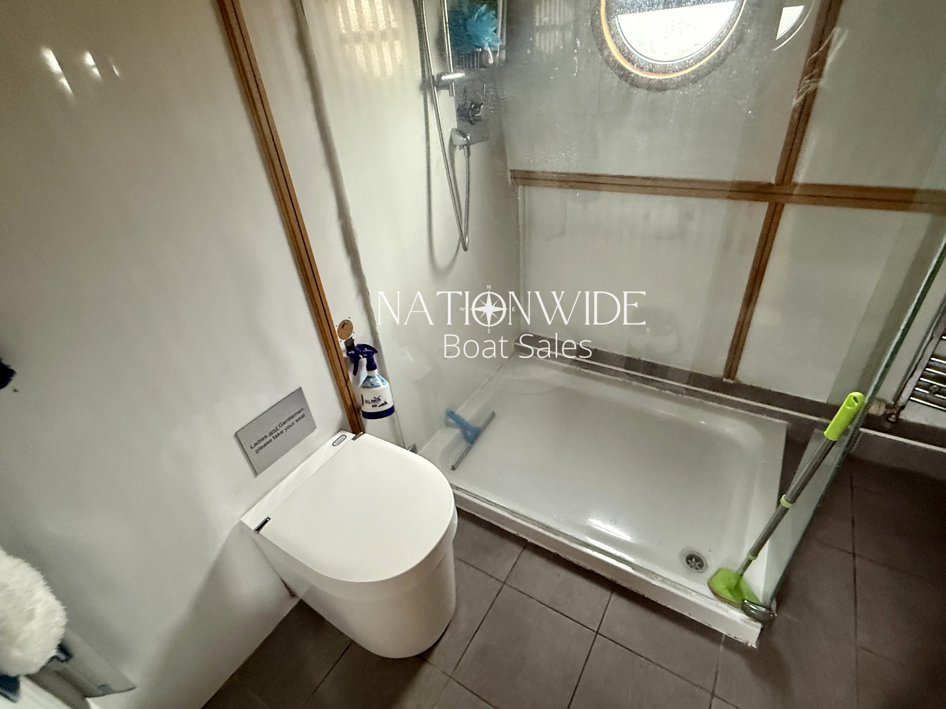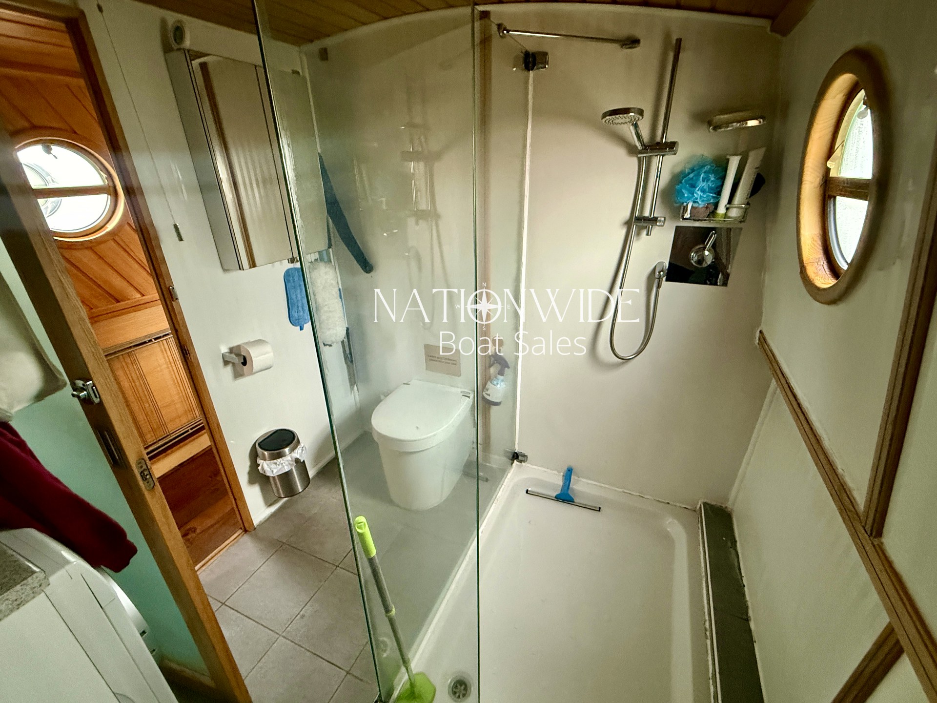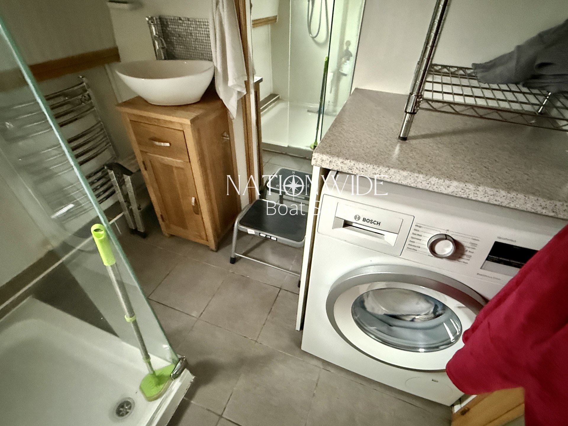 The galley is designed with everyday living in mind, featuring a Belling cooker, Liebherr fridge/freezer, and Avonite-style worktops. Accommodation includes a comfortable super king-size cast iron bed with ample storage beneath, while the bathroom offers a large walk-in shower, vanity basin, heated towel rail, along with a Bosch washing machine , and a Separett composting toilet, which can easily be replaced with a pump-out system if preferred.