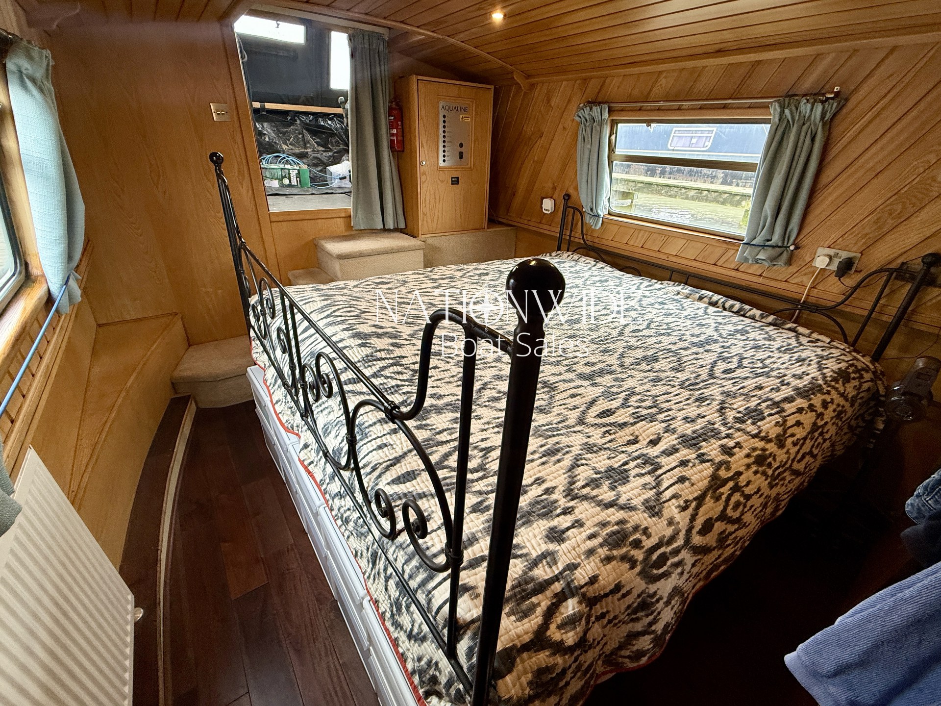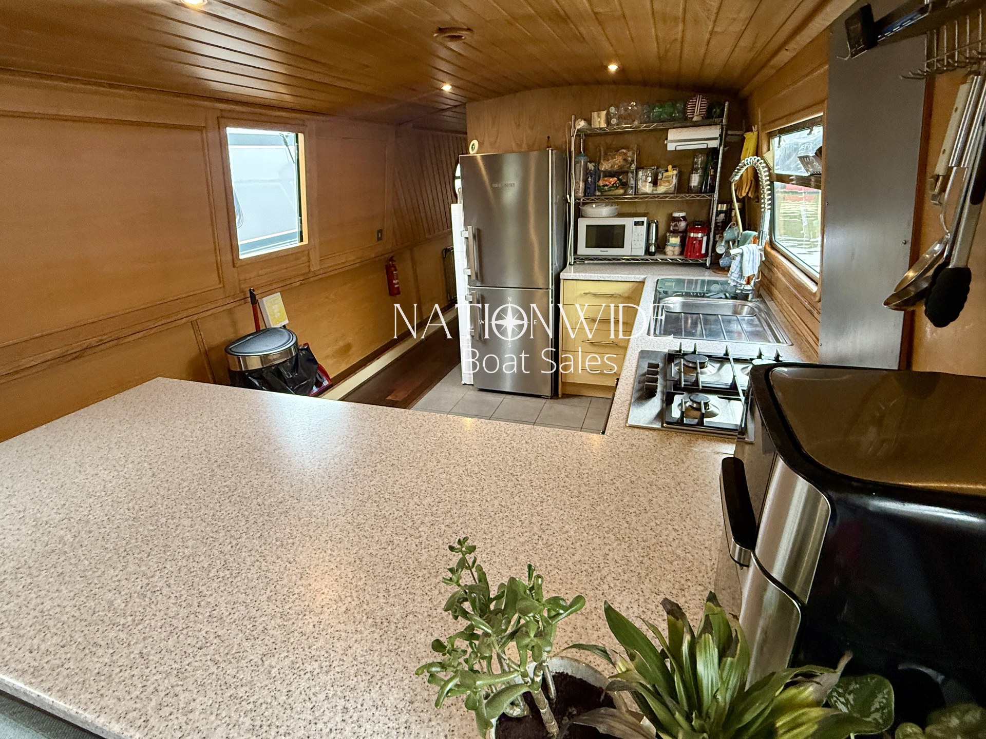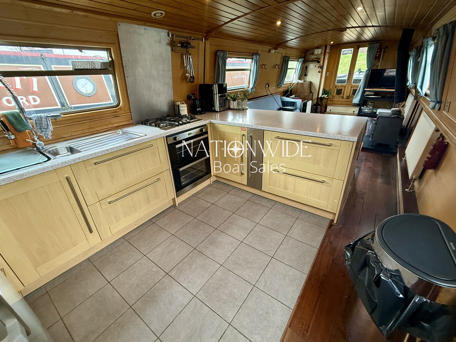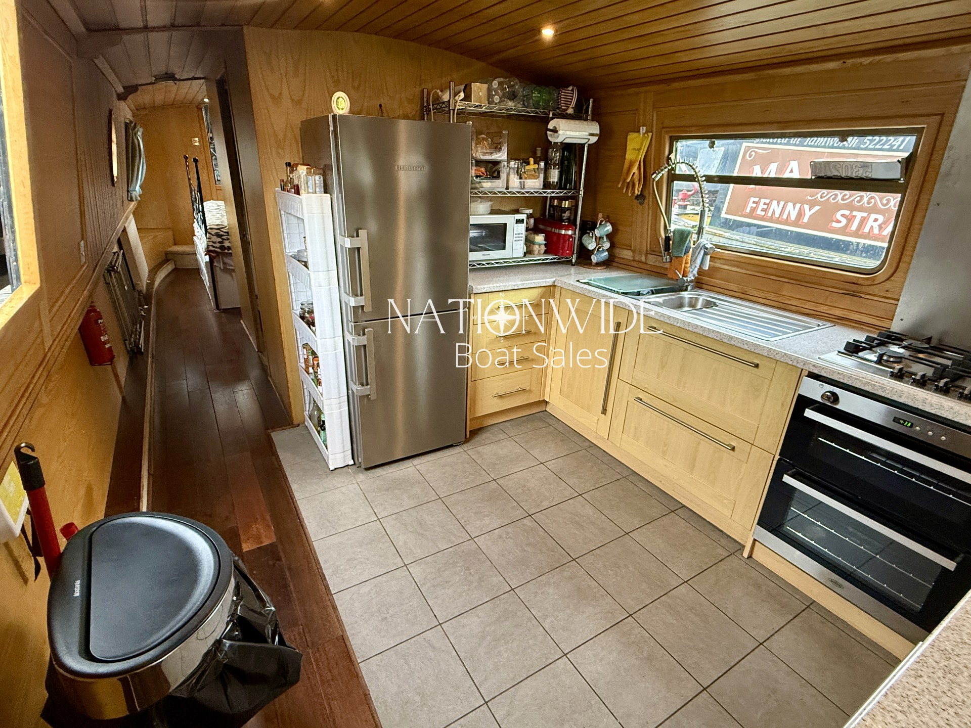 The galley is designed with everyday living in mind, featuring a Belling cooker, Liebherr fridge/freezer, and Avonite-style worktops. Accommodation includes a comfortable super king-size cast iron bed with ample storage beneath, while the bathroom offers a large walk-in shower, vanity basin, heated towel rail, along with a Bosch washing machine , and a Separett composting toilet, which can easily be replaced with a pump-out system if preferred.