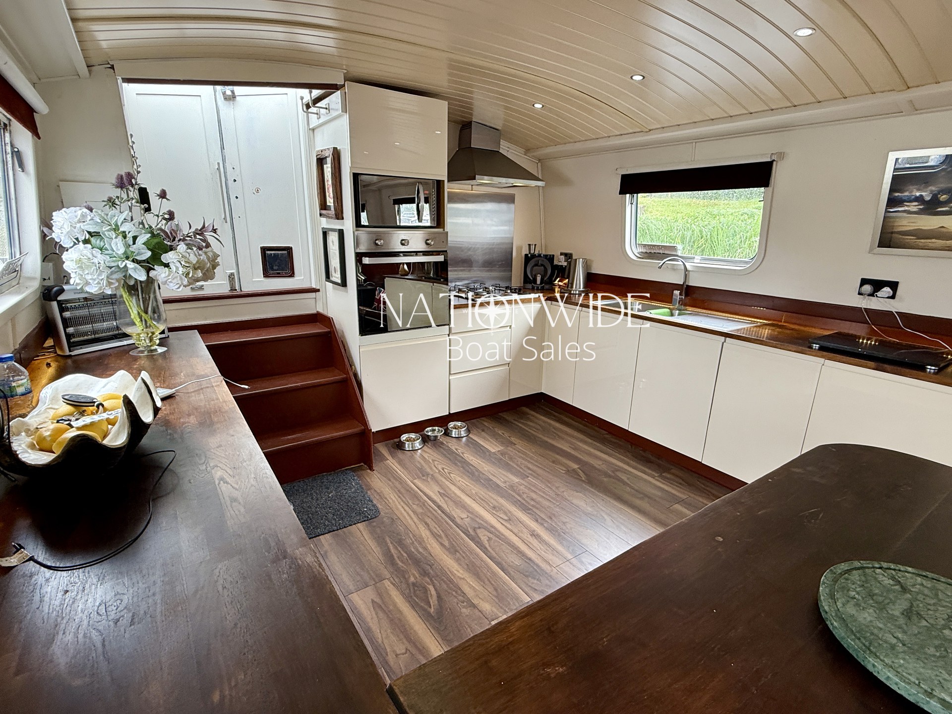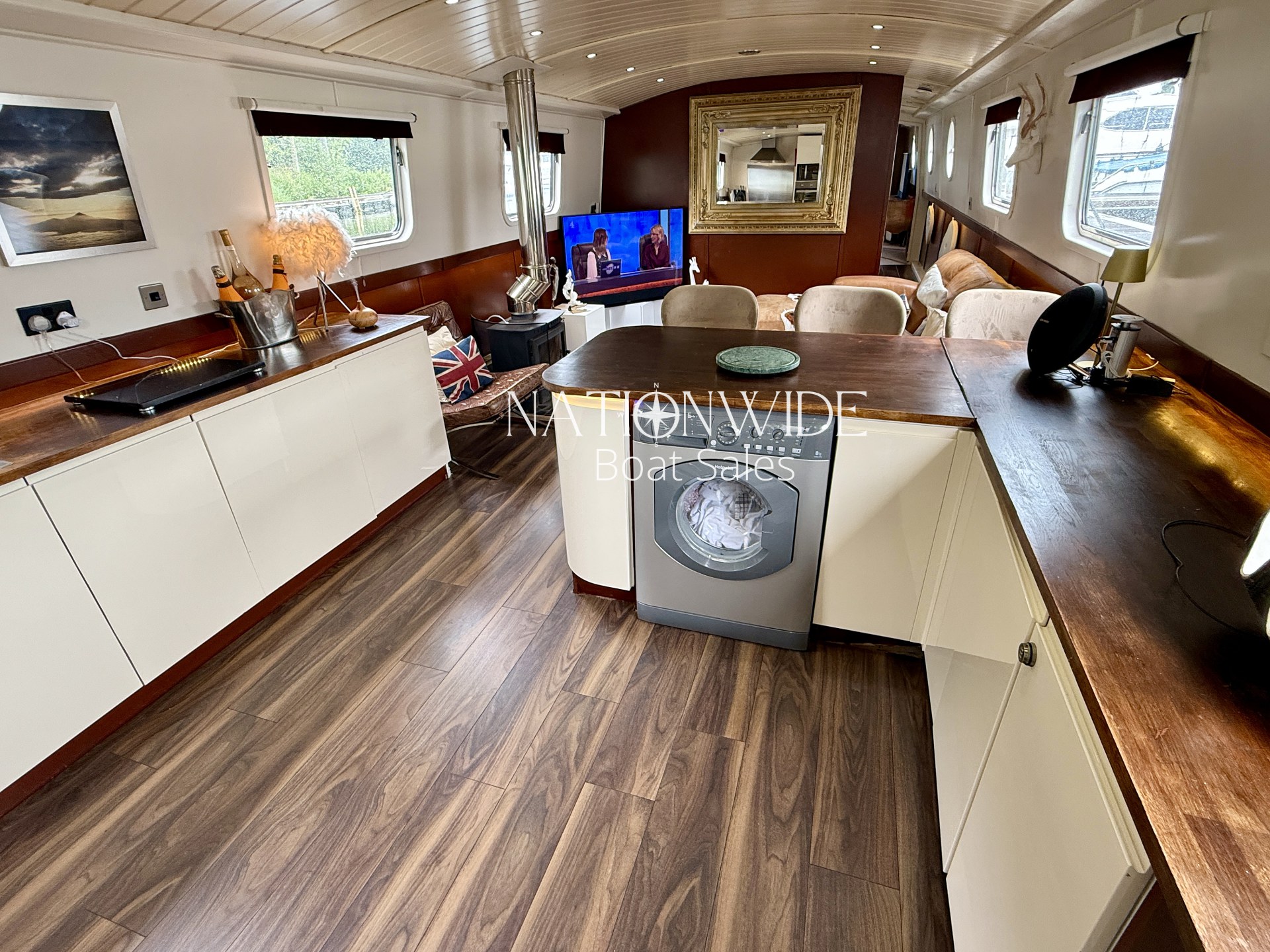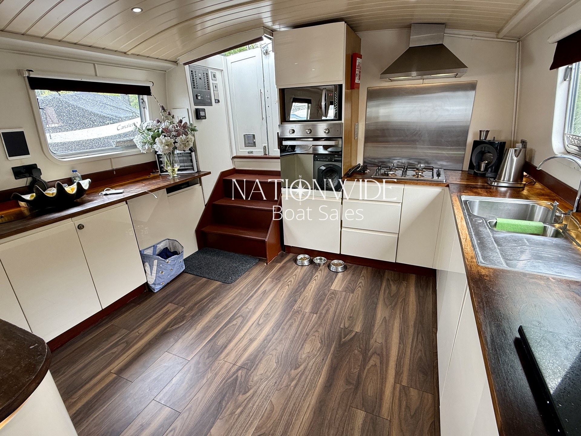 Her galley is fully equipped boasting a cooker with separate hob, separate fridge and freezer (12v), Zanussi washing machine, and even a dishwasher, all framed by gorgeous oak worktops.