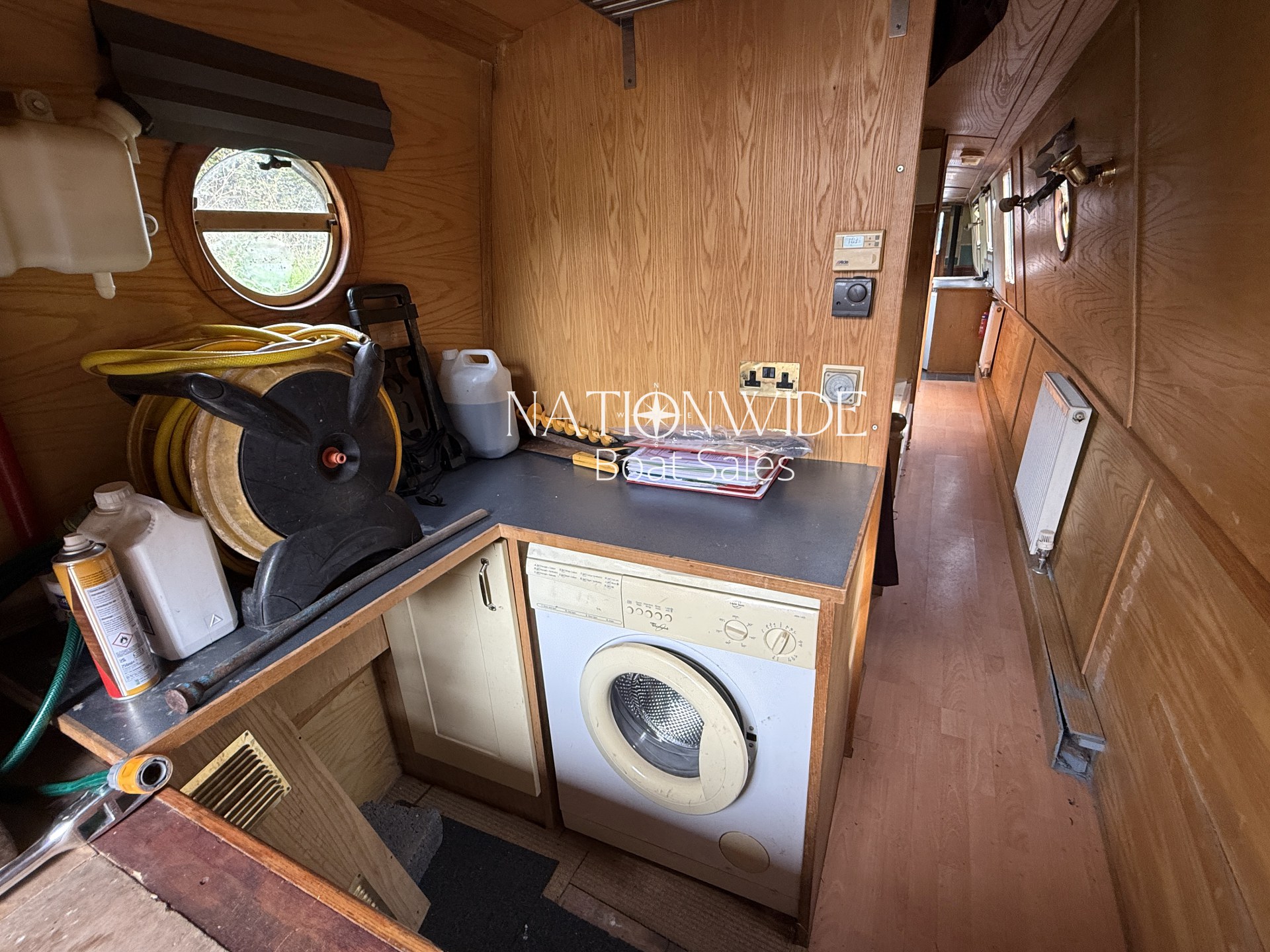 The galley includes a Country Leisure cooker, Beko fridge with freezer compartment, water filter, and Whirlpool washing machine. Heating and hot water are provided via Webasto central heating, a calorifier, and an Aarrow solid fuel stove, keeping her comfortable year-round.