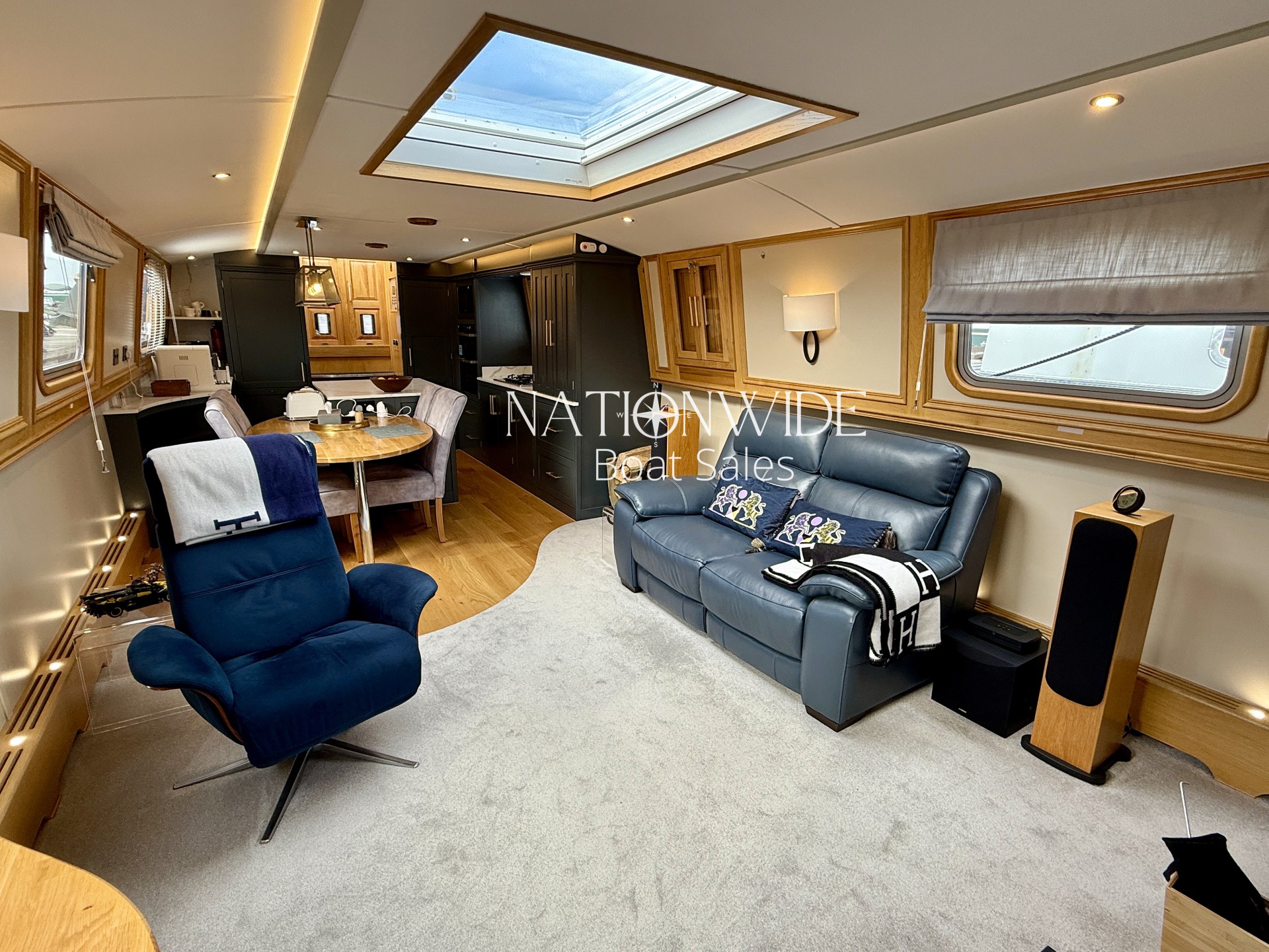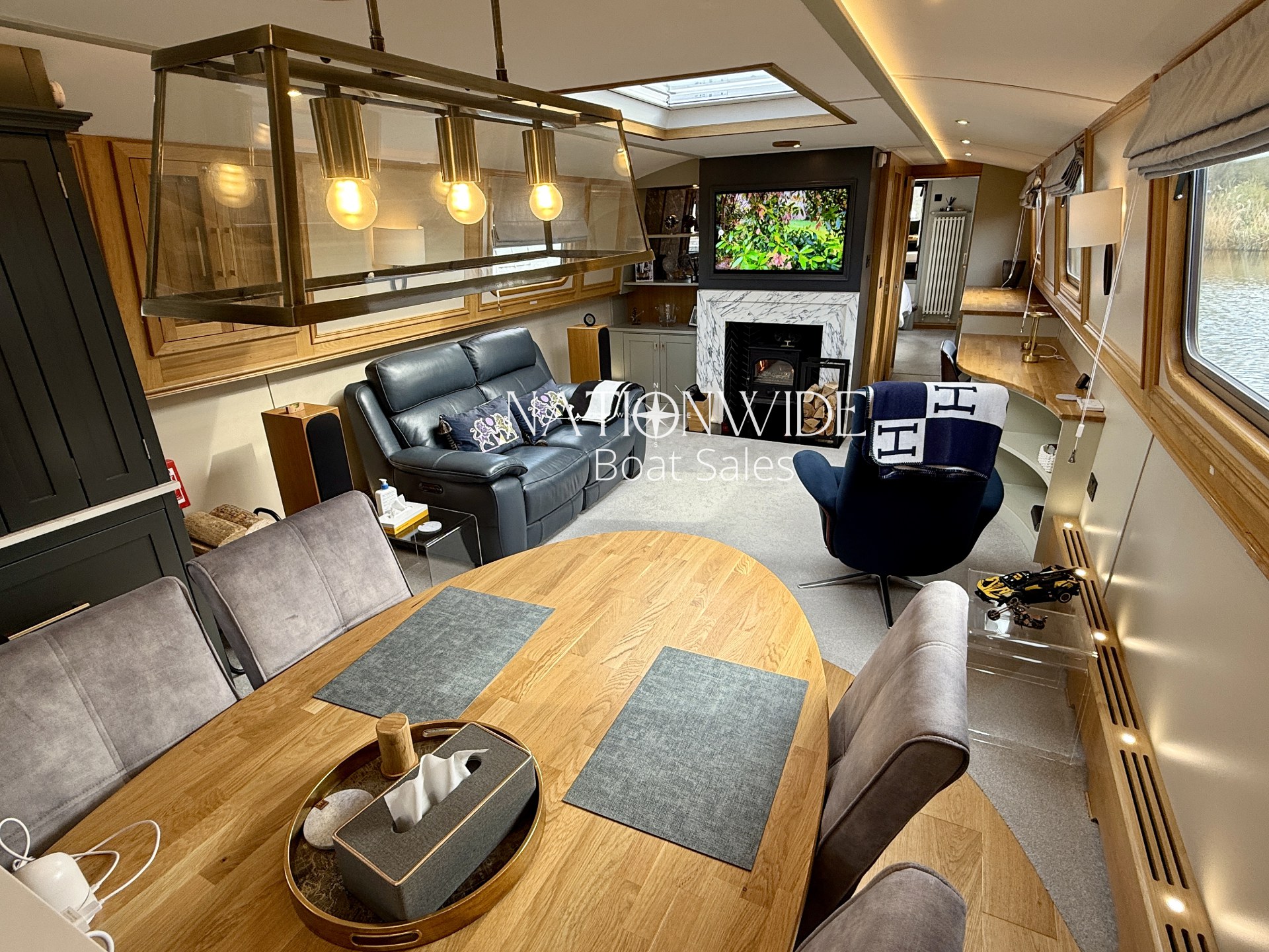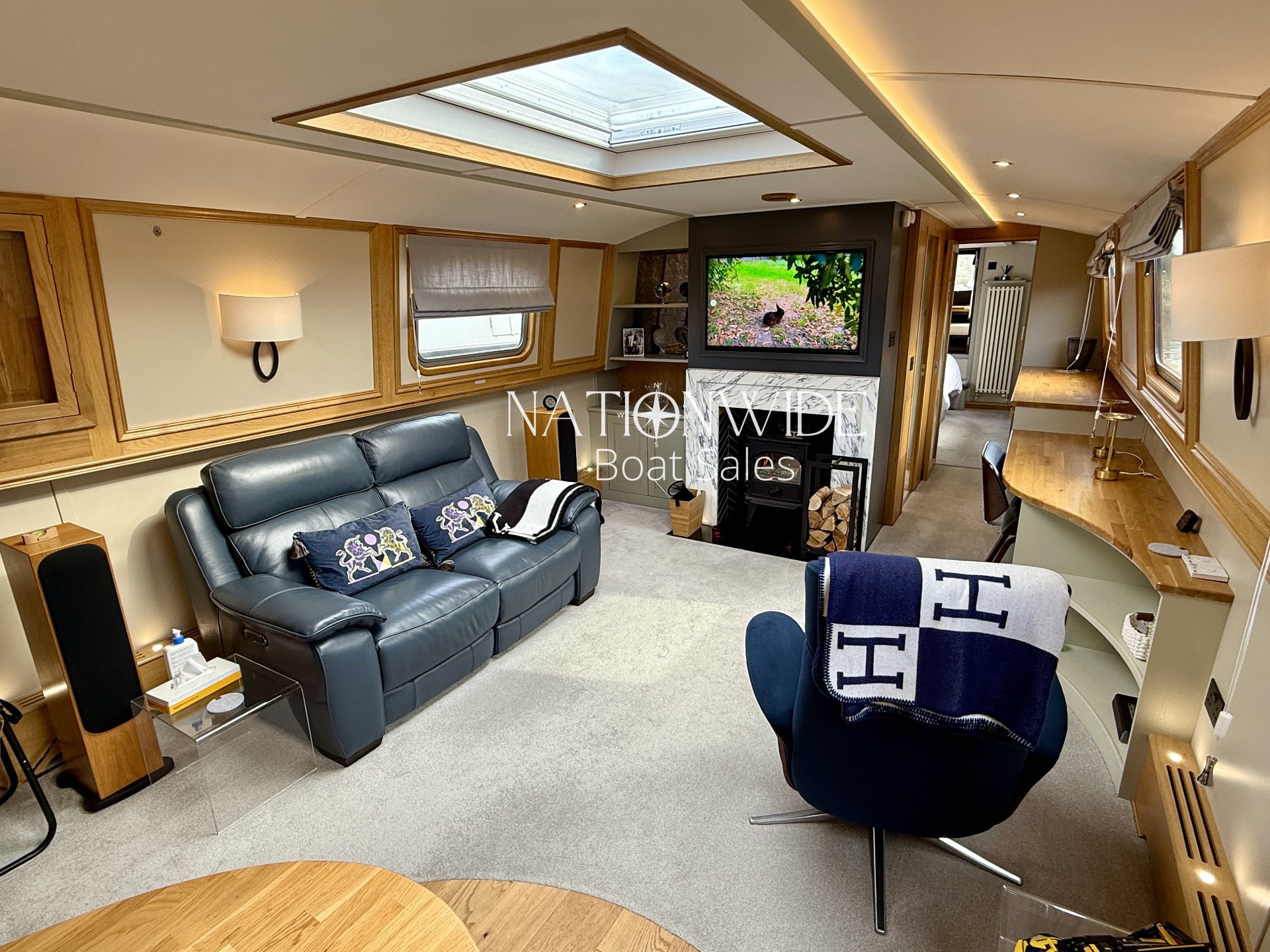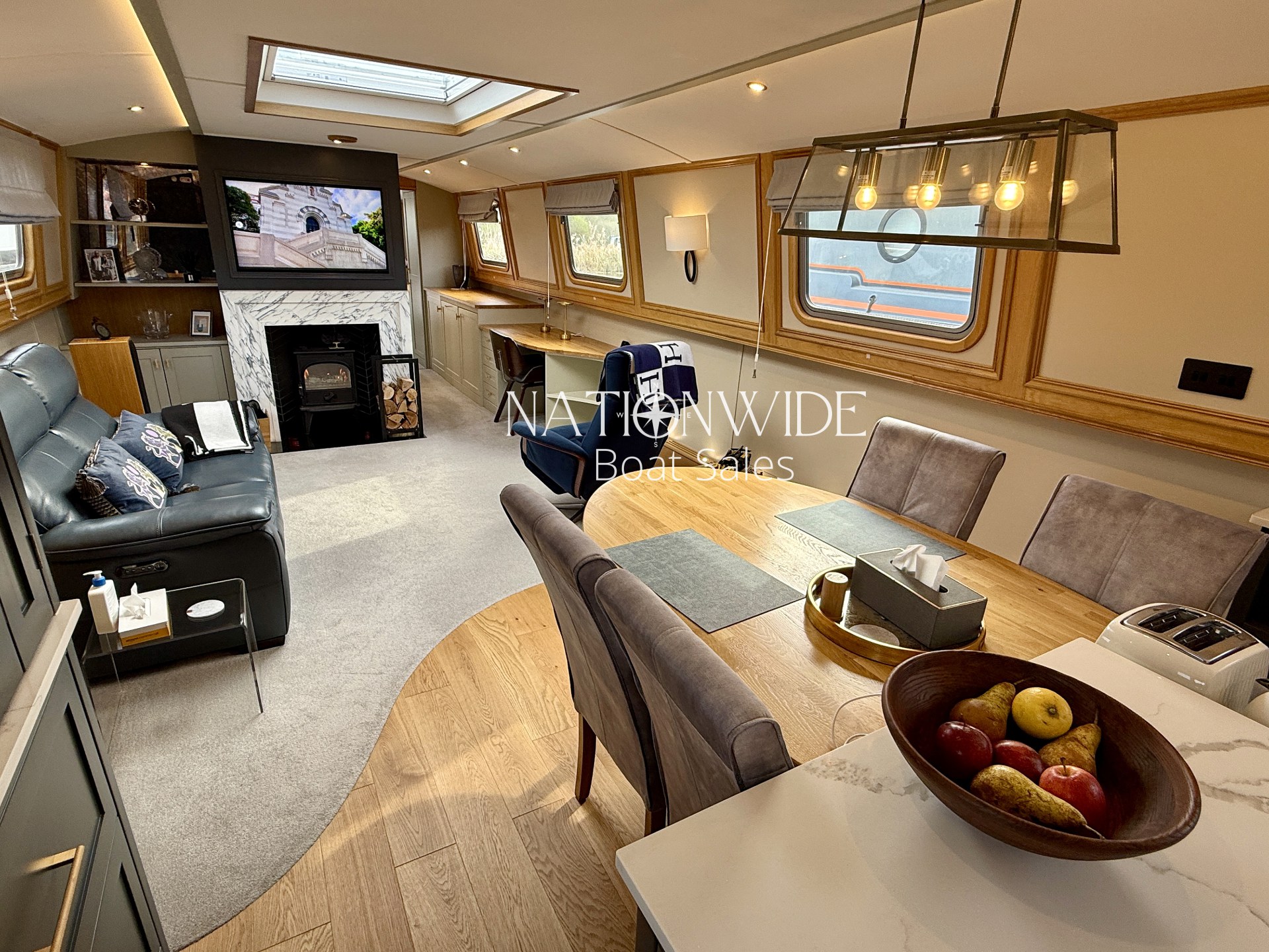 Introducing Serenity, an exquisite 62-foot by 12-foot Widebeam Cruiser crafted by Aqualine, with its popular reverse layout. This vessel is powered by a robust Canaline 70hp engine, complete with an upgraded control panel, and features a highly efficient Sleipner SE80/185T bow thruster. The onboard heating system, comprising a calorifier/immersion and Webasto, works in tandem with the Dovre multifuel woodburning stove in the saloon, ensuring warmth and comfort throughout. For those warmer days, a 12,000 BTU air conditioner with a custom external vent via the duck hatch offers refreshing coolness.