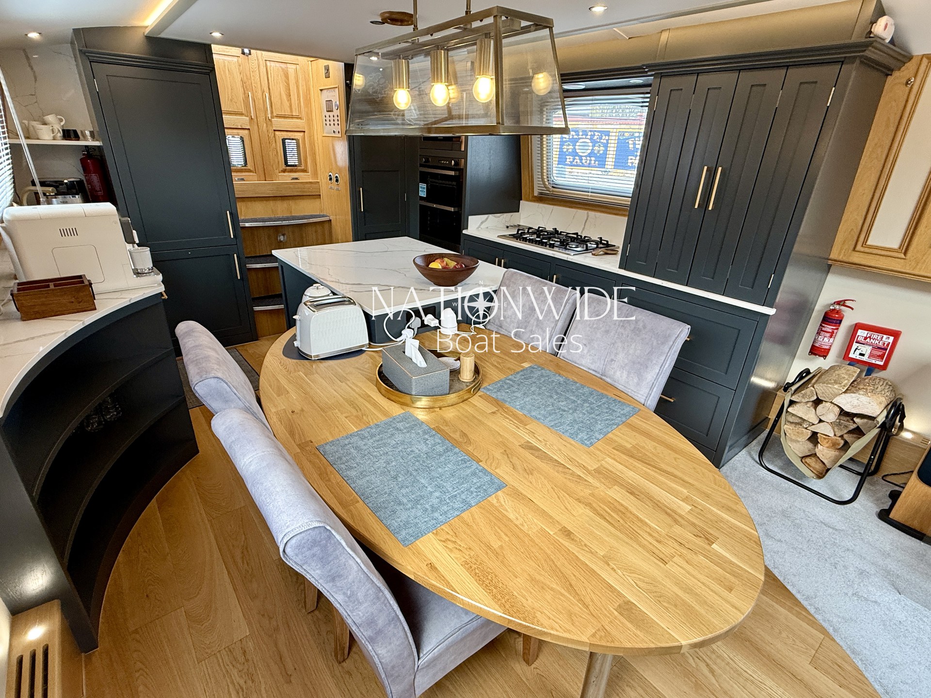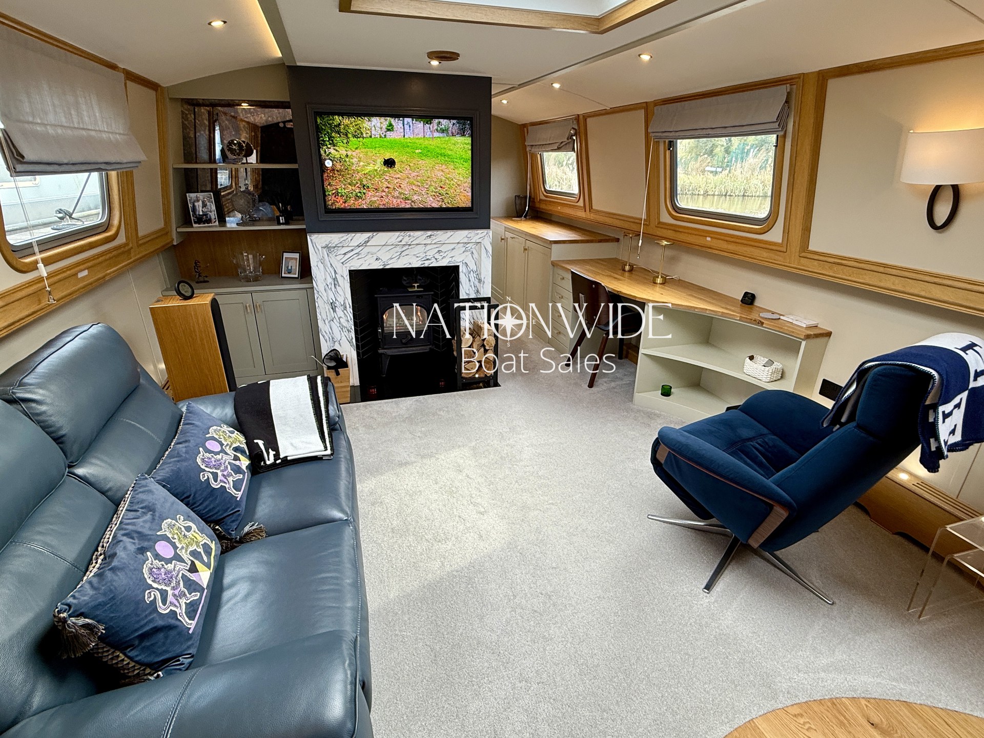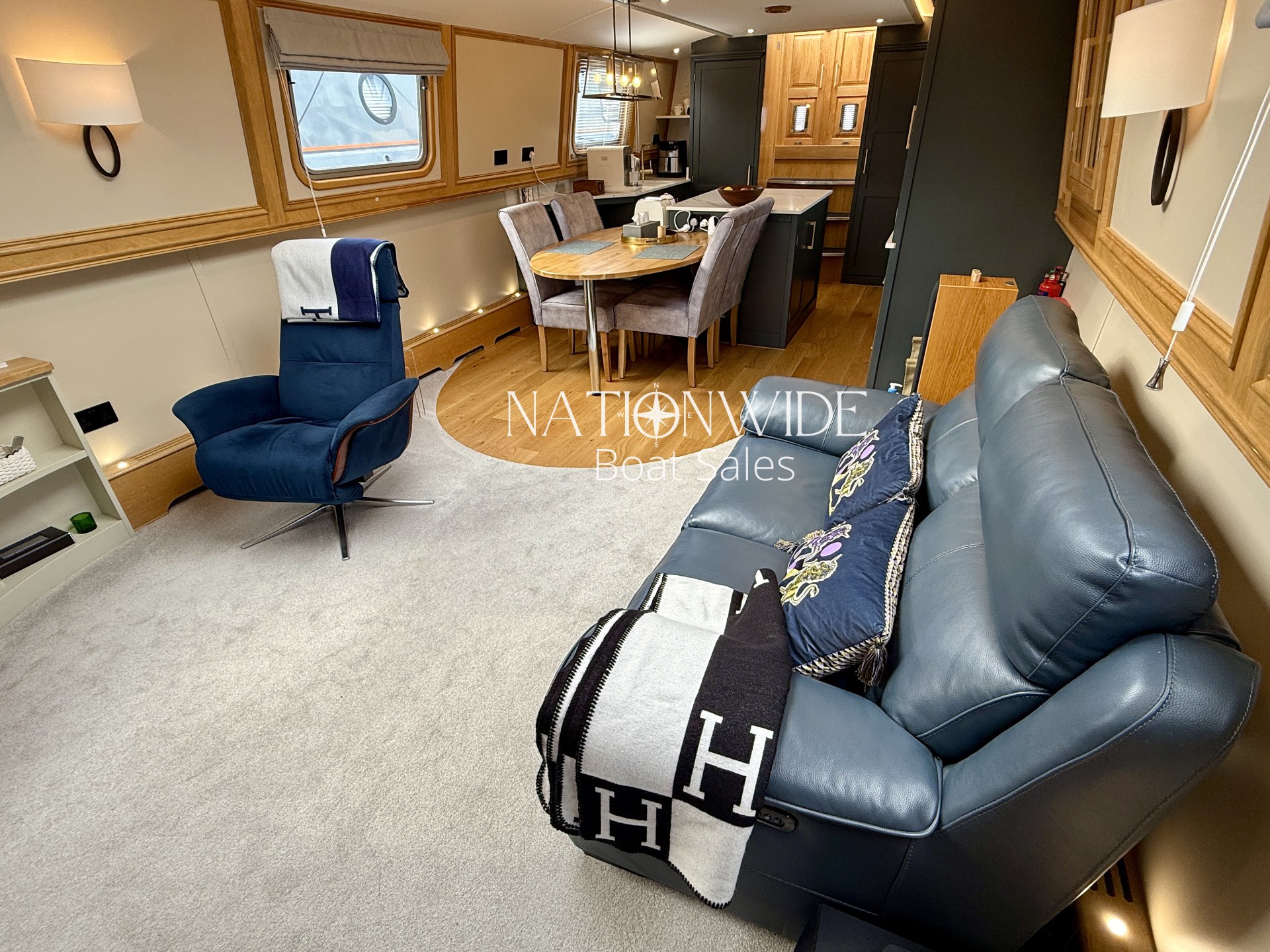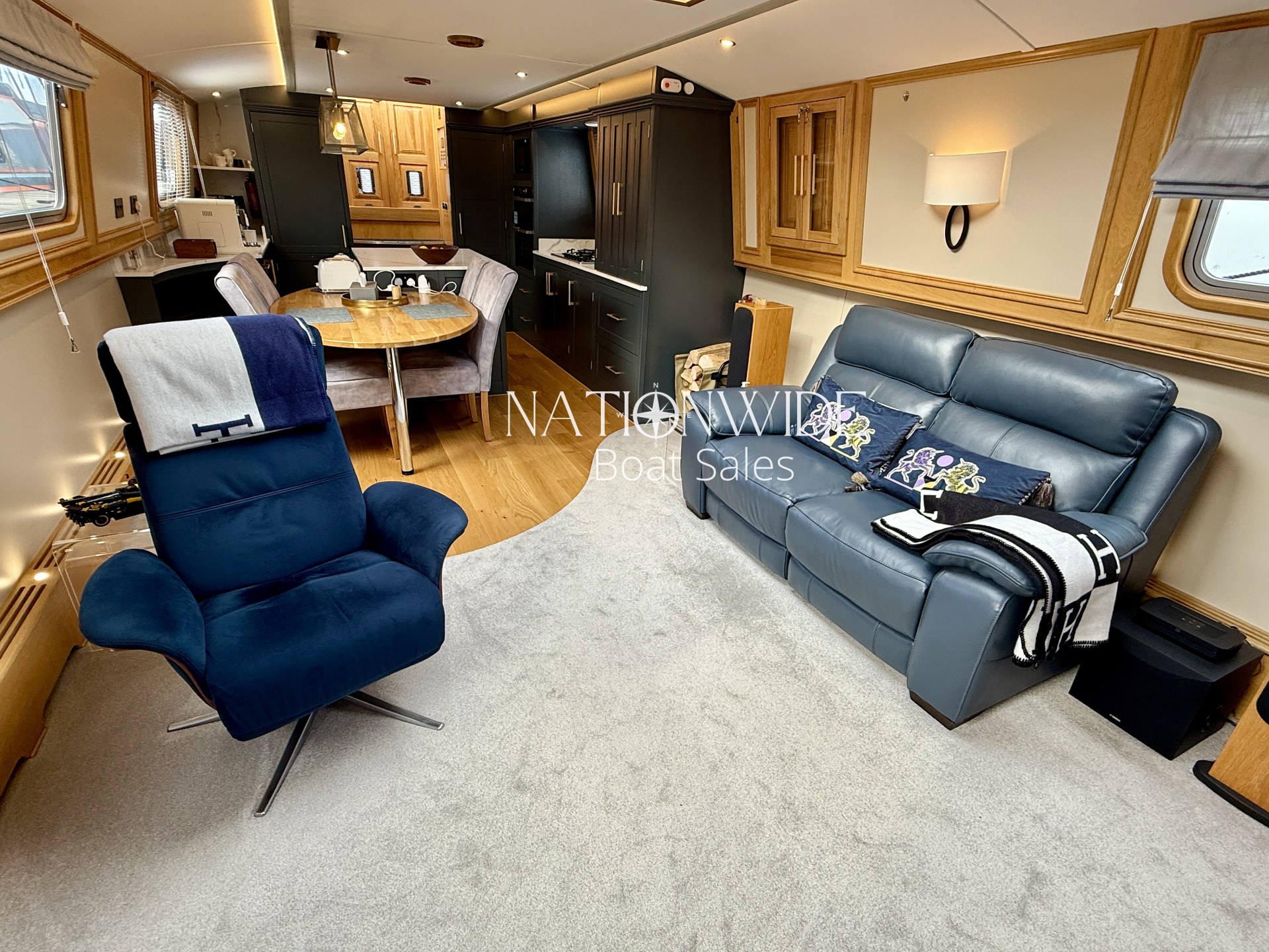 Introducing Serenity, an exquisite 62-foot by 12-foot Widebeam Cruiser crafted by Aqualine, with its popular reverse layout. This vessel is powered by a robust Canaline 70hp engine, complete with an upgraded control panel, and features a highly efficient Sleipner SE80/185T bow thruster. The onboard heating system, comprising a calorifier/immersion and Webasto, works in tandem with the Dovre multifuel woodburning stove in the saloon, ensuring warmth and comfort throughout. For those warmer days, a 12,000 BTU air conditioner with a custom external vent via the duck hatch offers refreshing coolness.