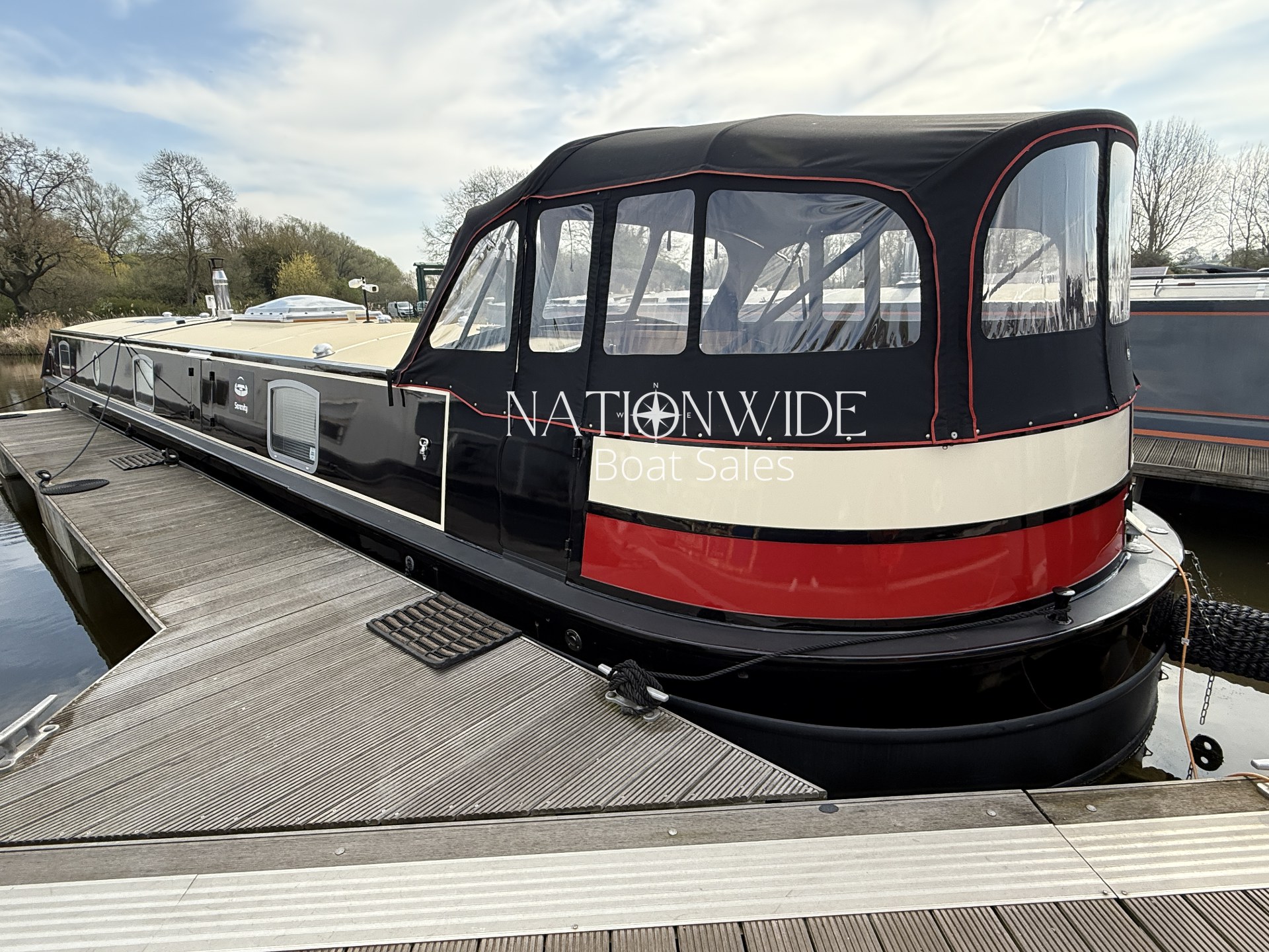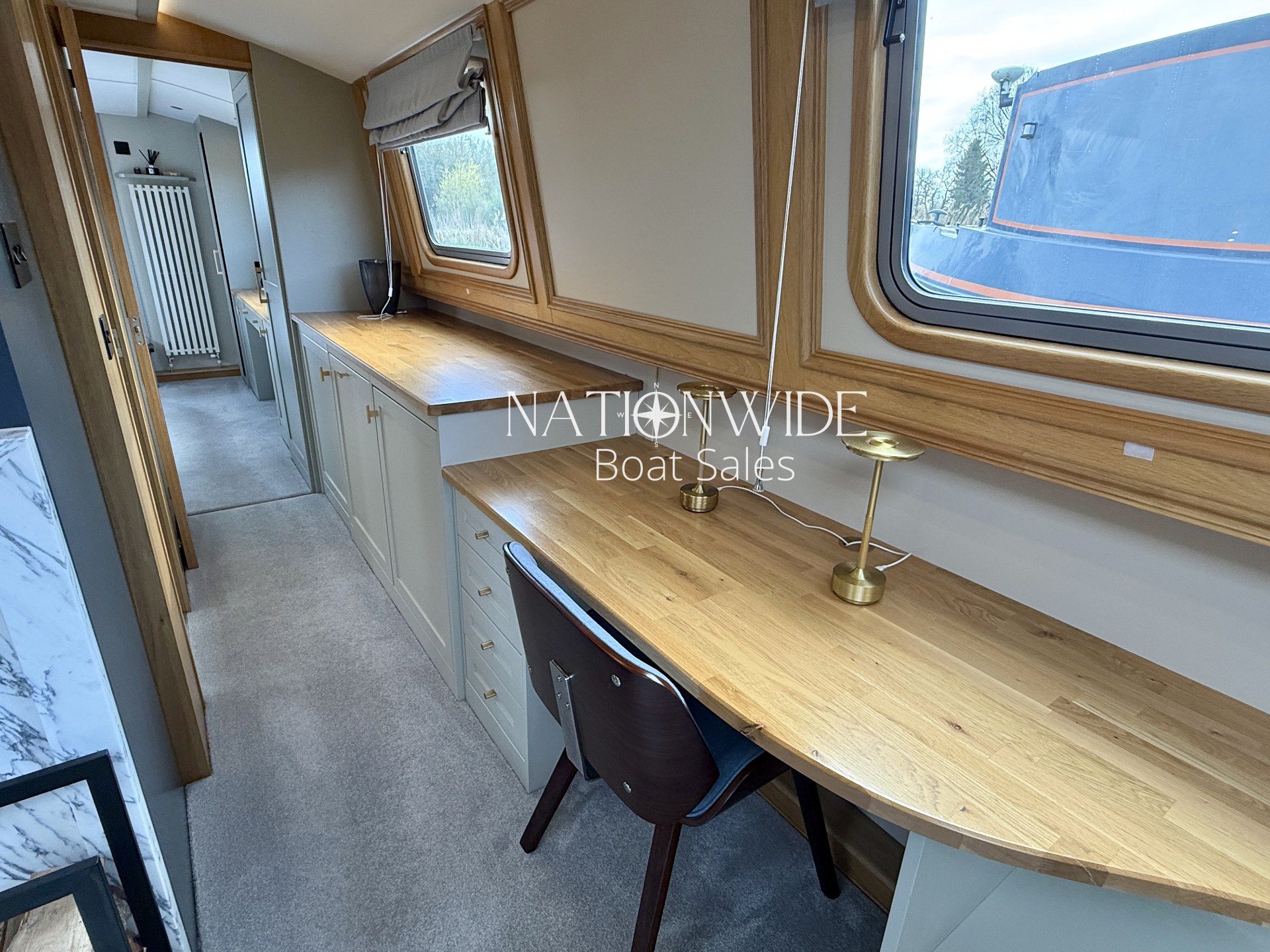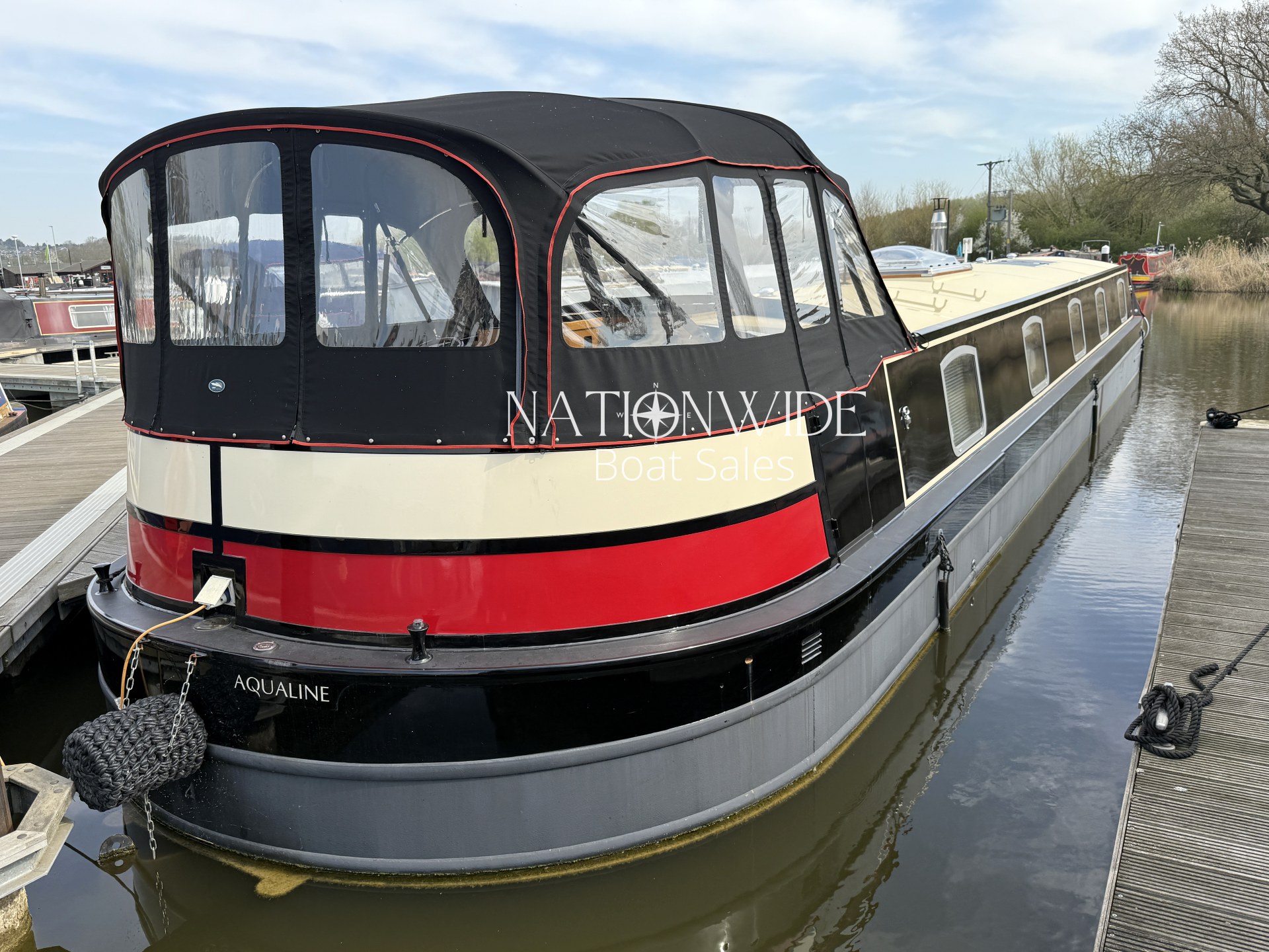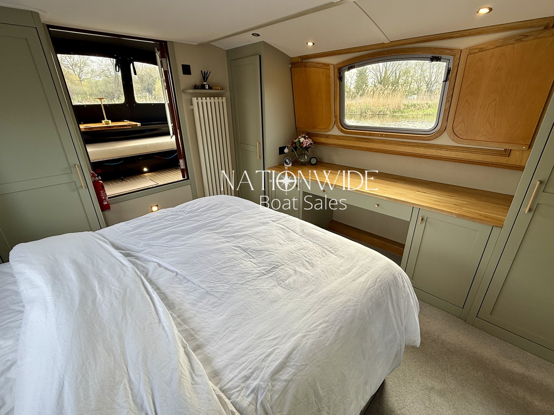 Introducing Serenity, an exquisite 62-foot by 12-foot Widebeam Cruiser crafted by Aqualine, with its popular reverse layout. This vessel is powered by a robust Canaline 70hp engine, complete with an upgraded control panel, and features a highly efficient Sleipner SE80/185T bow thruster. The onboard heating system, comprising a calorifier/immersion and Webasto, works in tandem with the Dovre multifuel woodburning stove in the saloon, ensuring warmth and comfort throughout. For those warmer days, a 12,000 BTU air conditioner with a custom external vent via the duck hatch offers refreshing coolness.