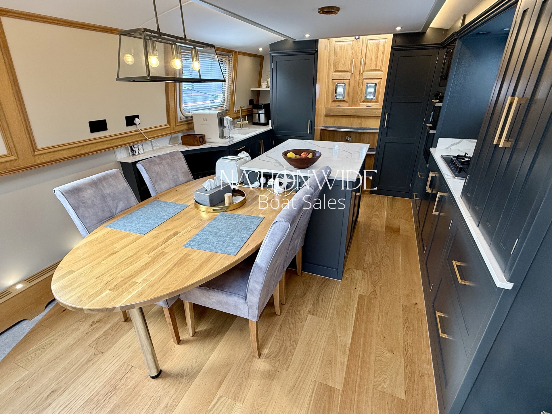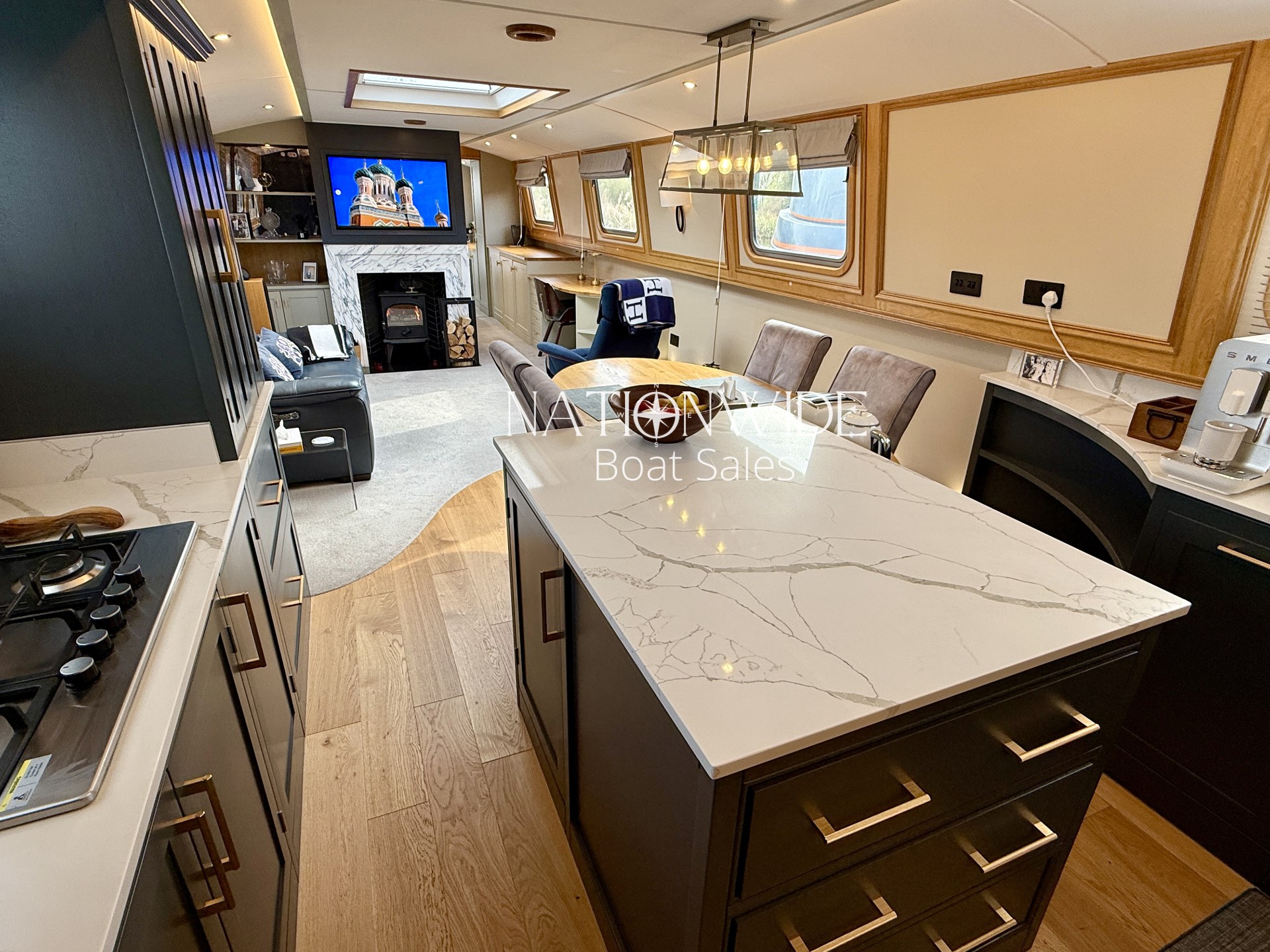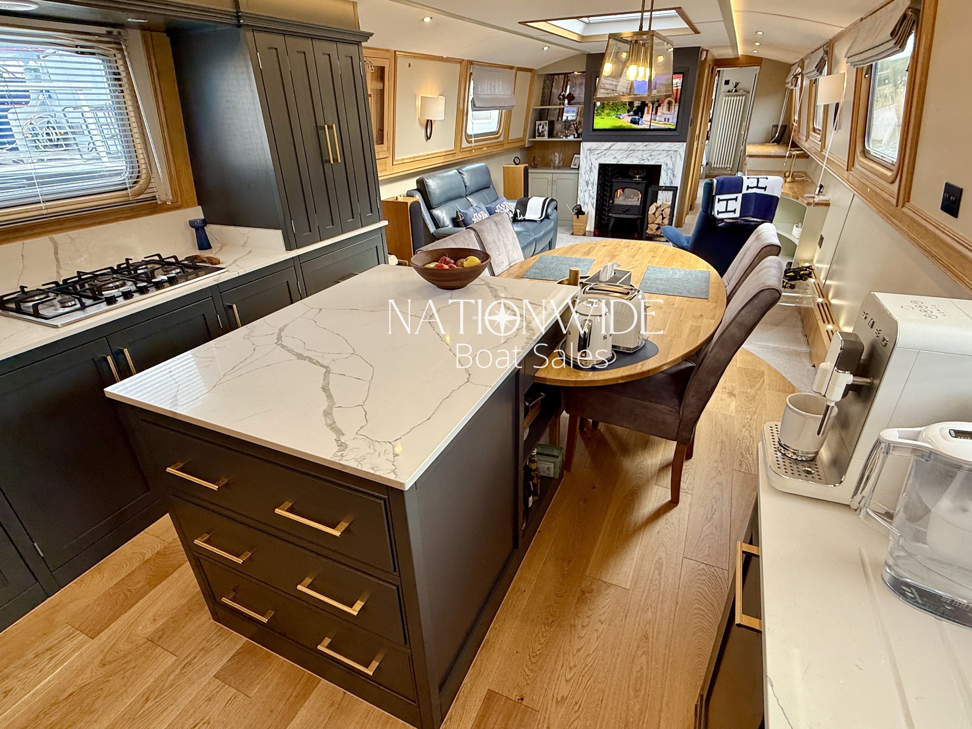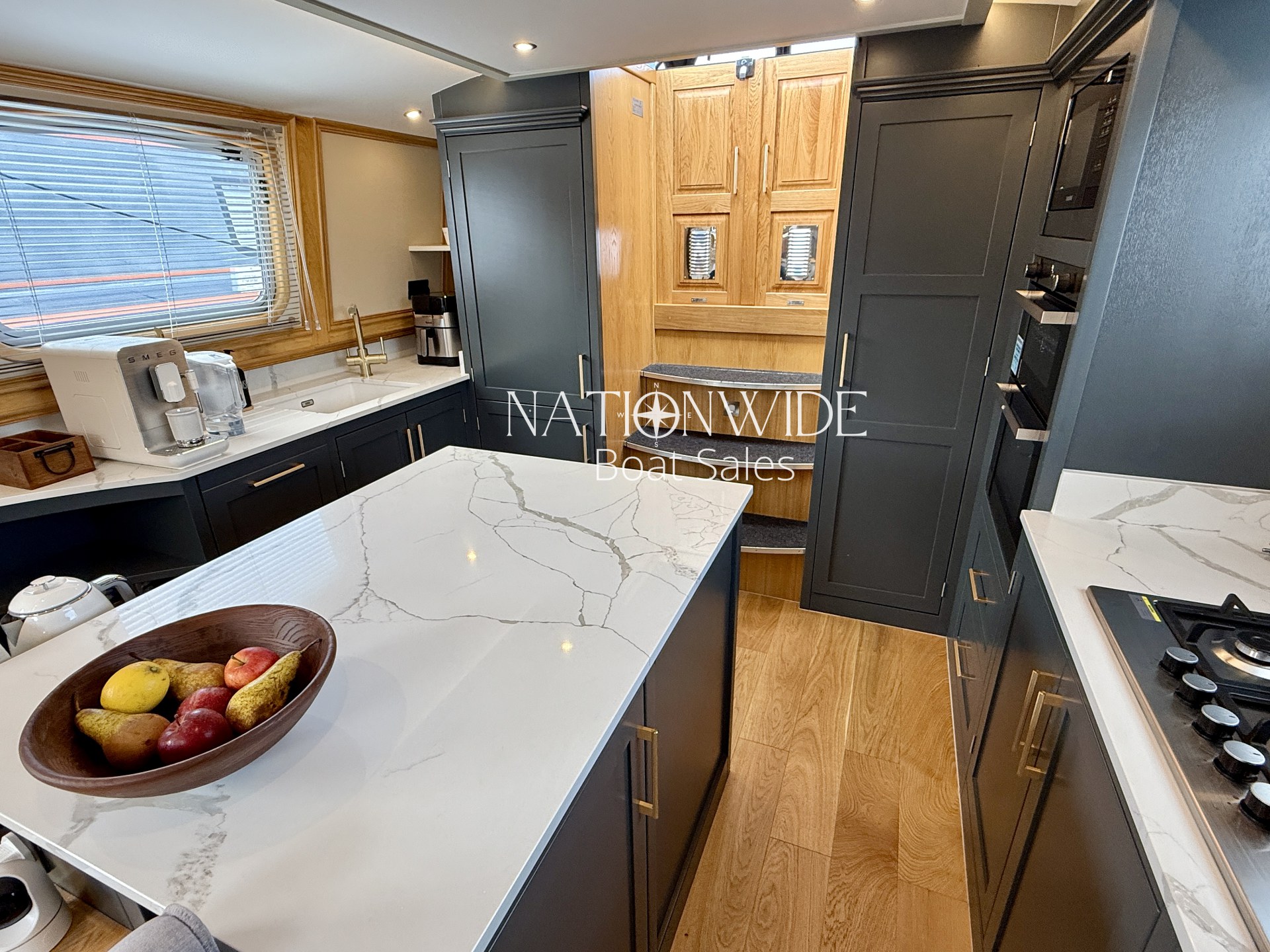 The spacious galley is a culinary delight, featuring a full-size stainless steel 5-burner hob and oven, integrated 240v Whirlpool fridge and freezer, a Samsung microwave, and a Bosch dishwasher. A filtered water tap with four step water filtering system, Tefal Easy Fry Precision, and a 2-in-1 Digital SMEG BCC02 Bean-To-Cup Coffee Machine complete the kitchen, all beautifully accented with Quartz worktops leading into a cozy saloon.