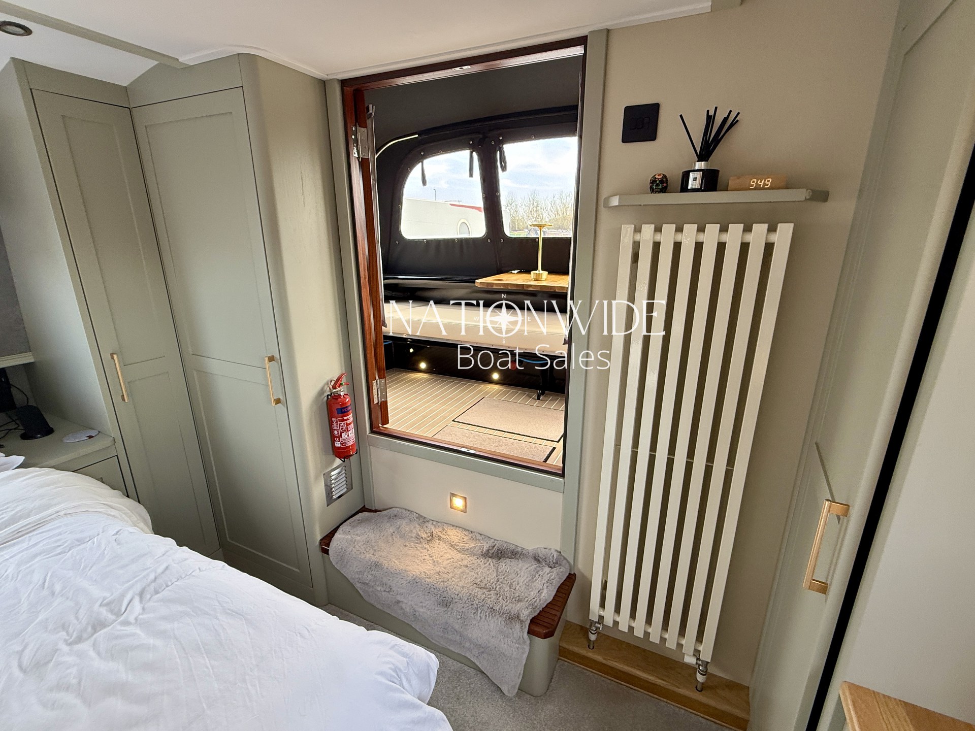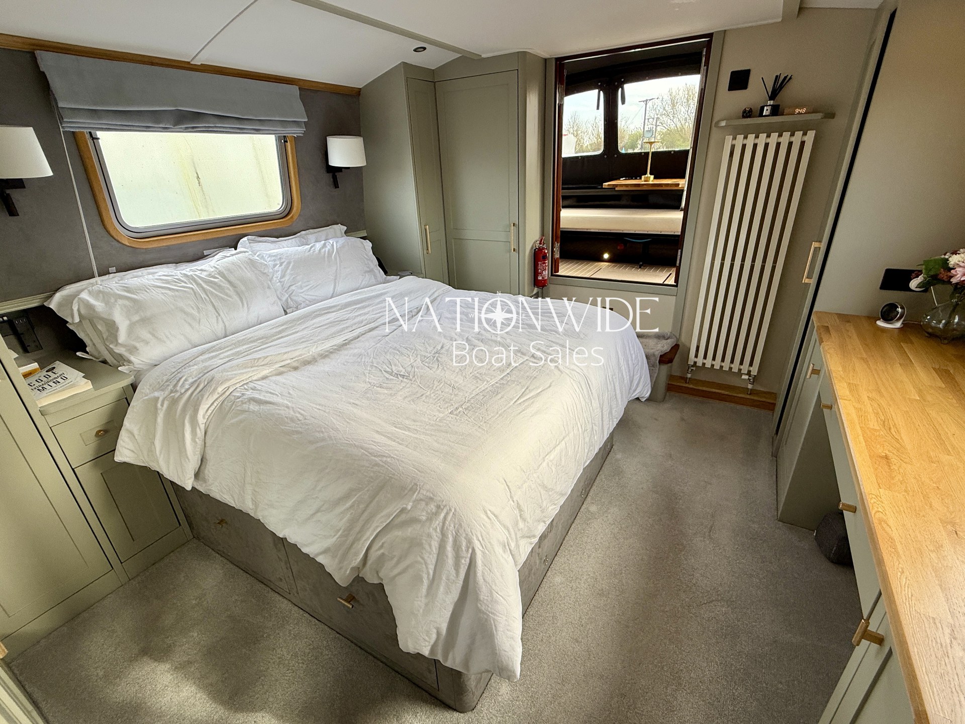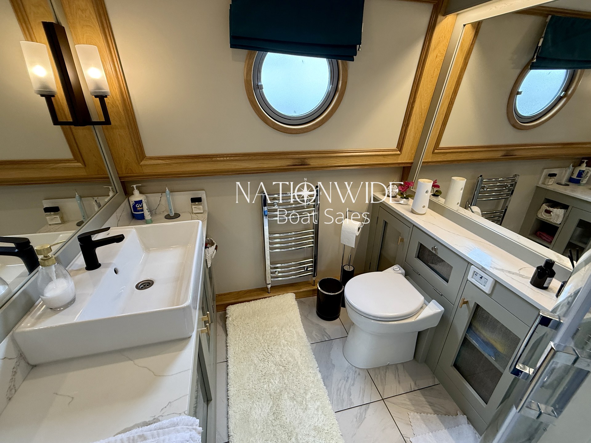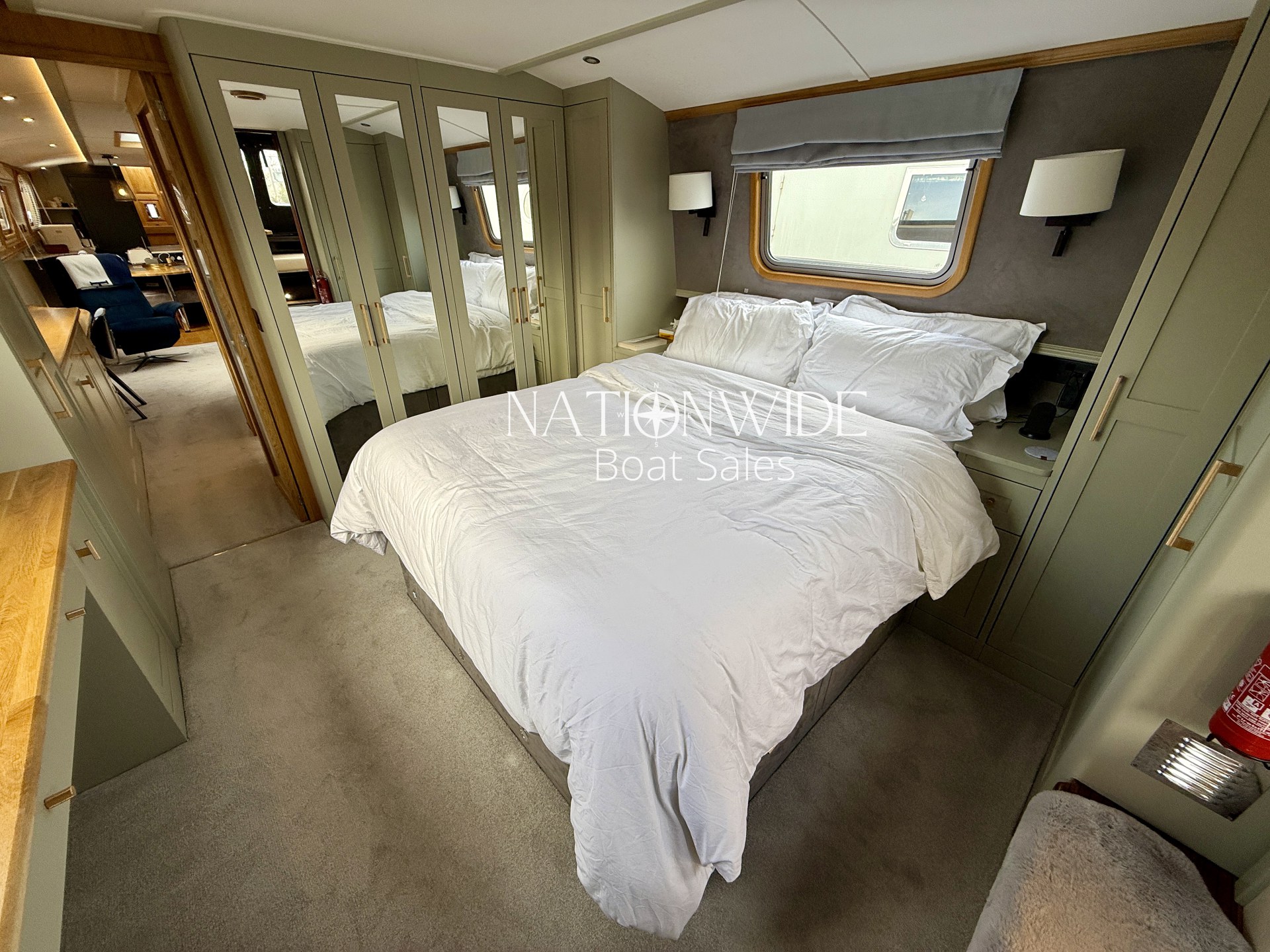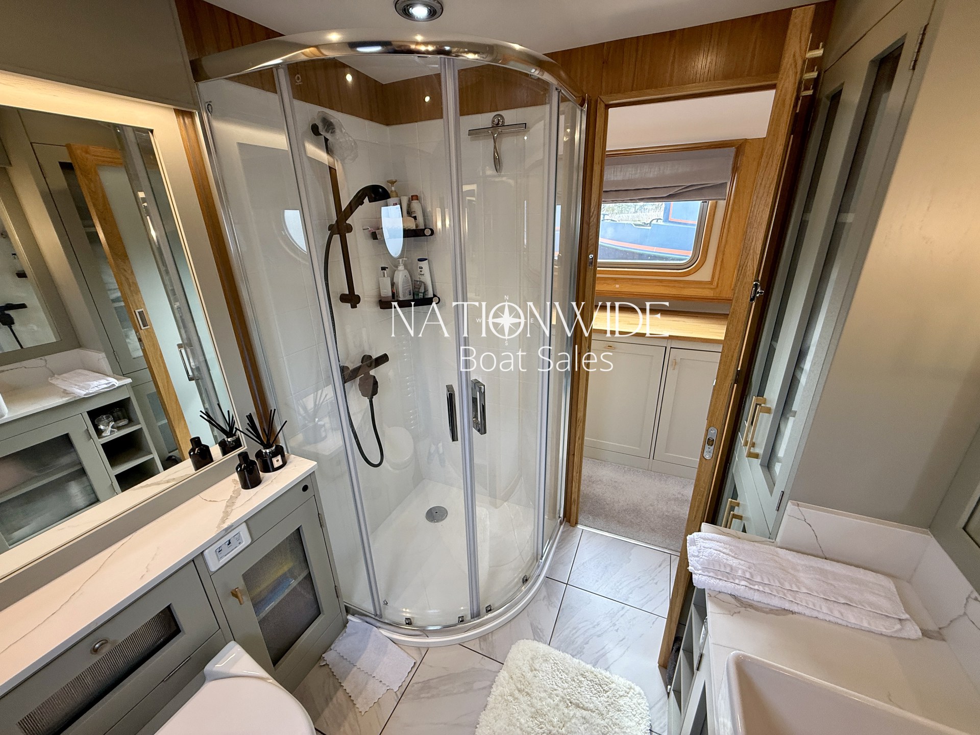 Accommodation is luxurious, with a fixed king-size bed in the main cabin and additional berth potential in the saloon. The bathroom is elegantly designed with tiled flooring, a Macerator pump-out Sanimarin toilet, shower, vanity basin, Quartz topped vanity, heated towel rail, and illuminated mirror.