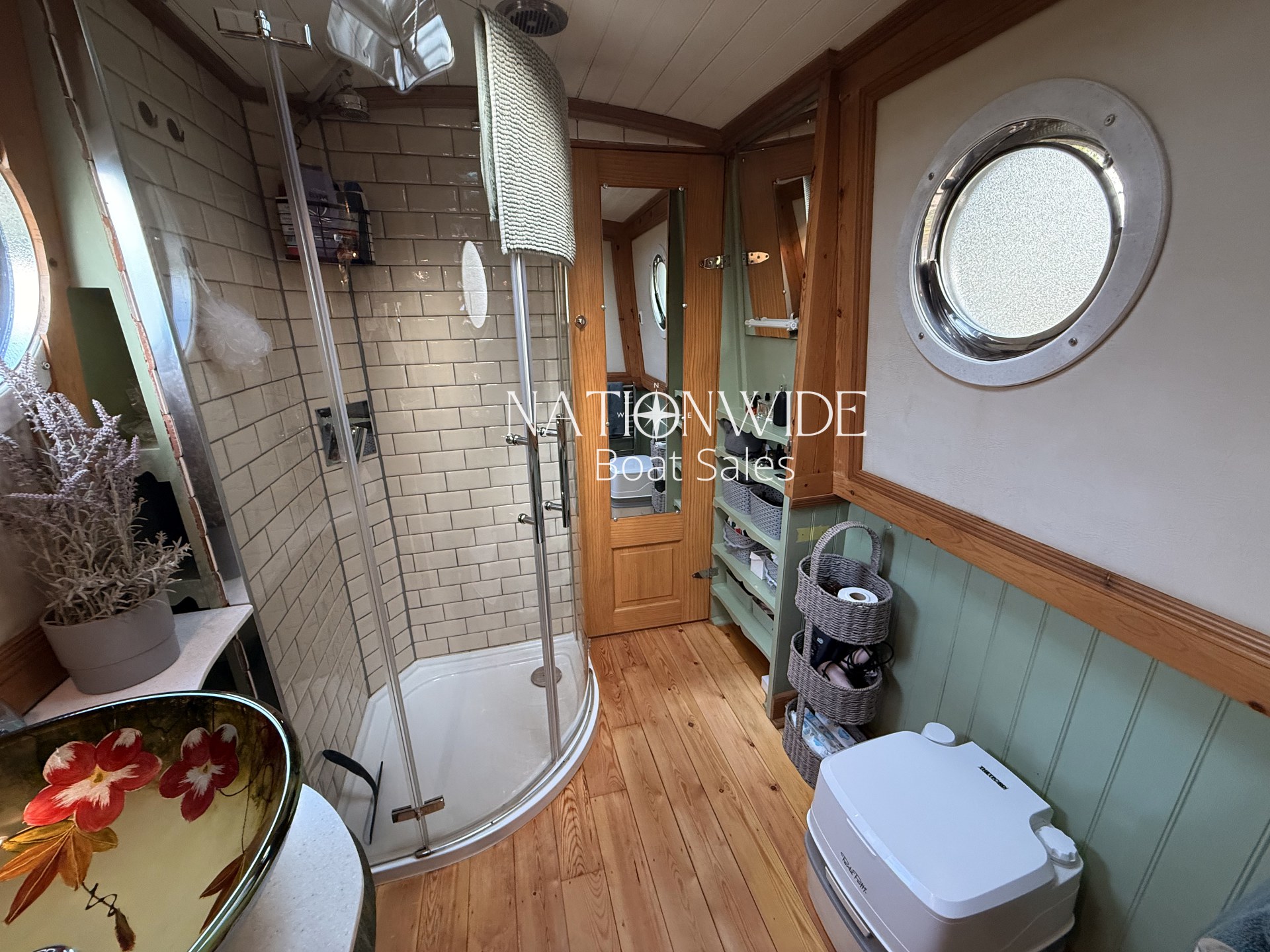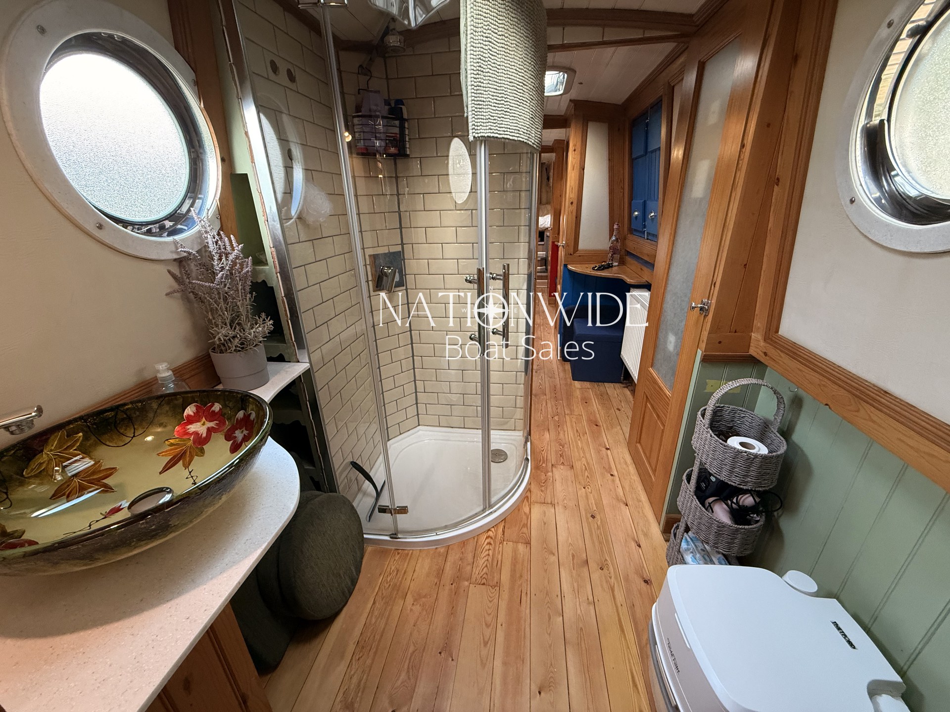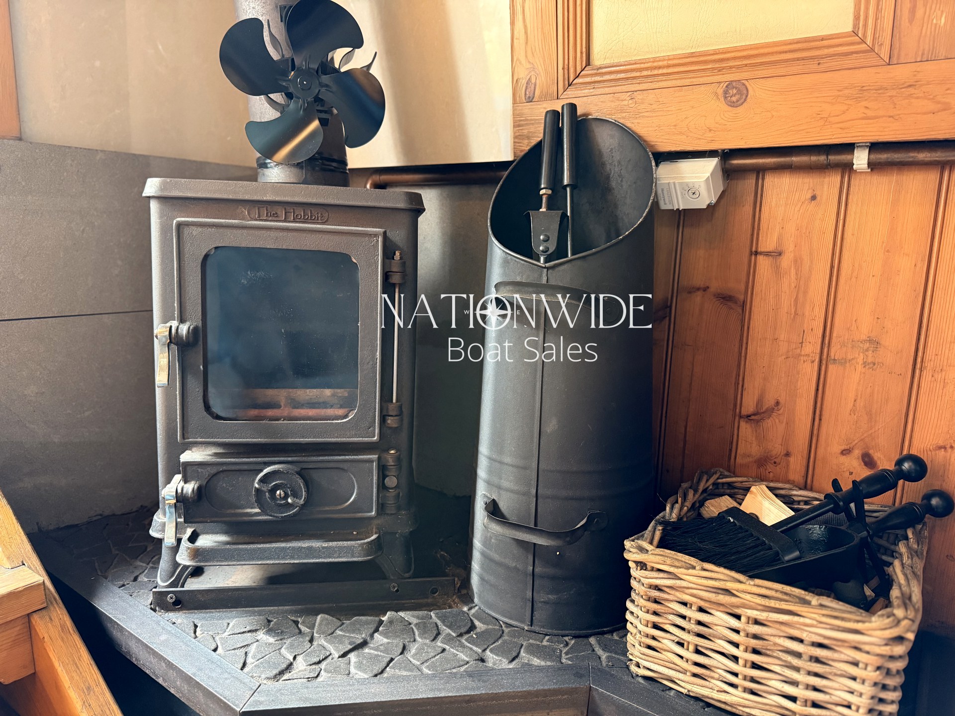 The interior finish showcases solid oak flooring, tongue and groove cabin sides, and spray foam insulation for year-round comfort. The galley is well-equipped with a Statesman cooker and Prity stove with backboiler, Shoreline fridge, and solid wood worktops, creating a warm and homely space for preparing meals. The walkthrough bathroom includes a shower, vanity basin, and cassette toilet with fittings in place for a pump-out option.