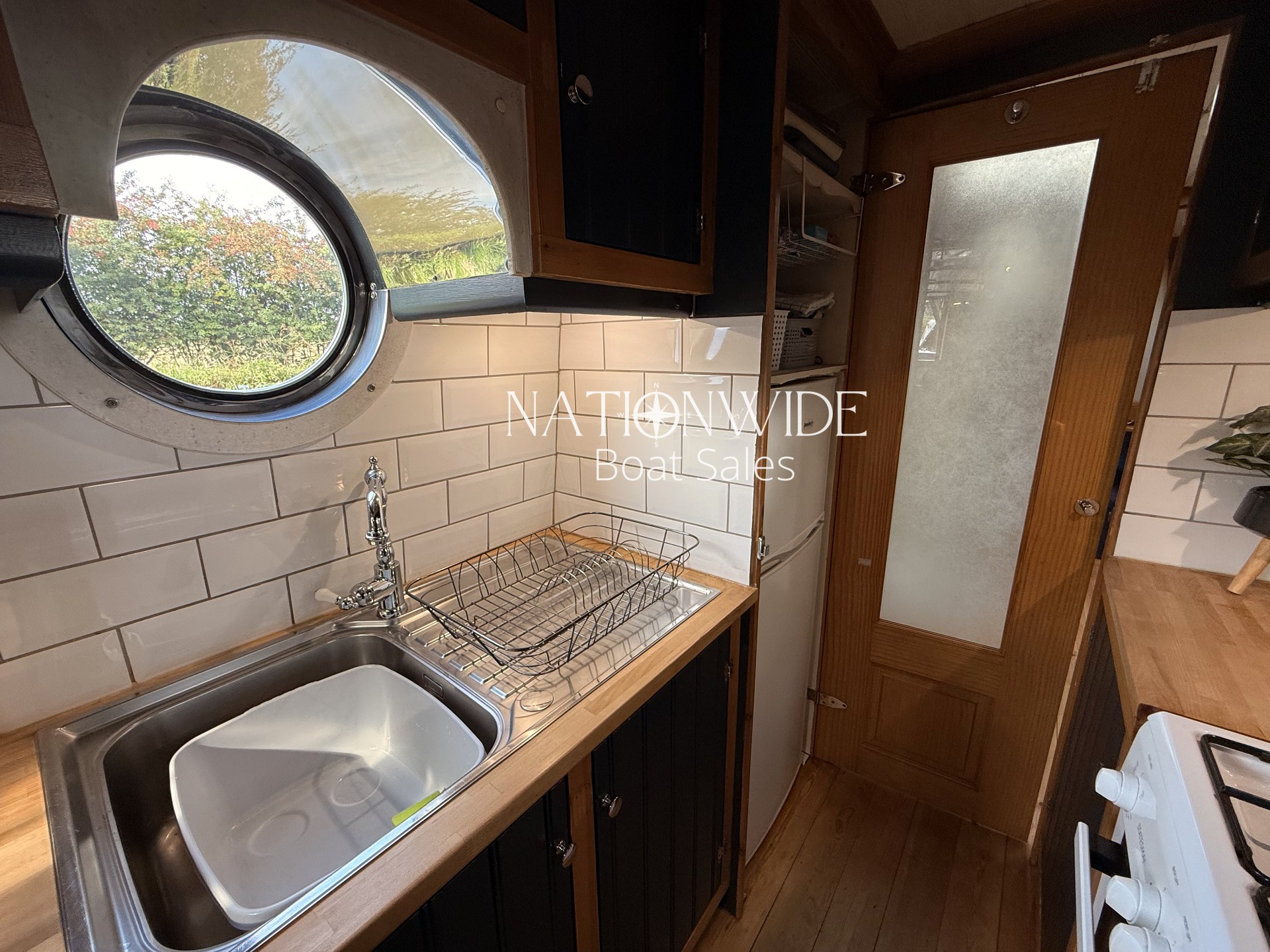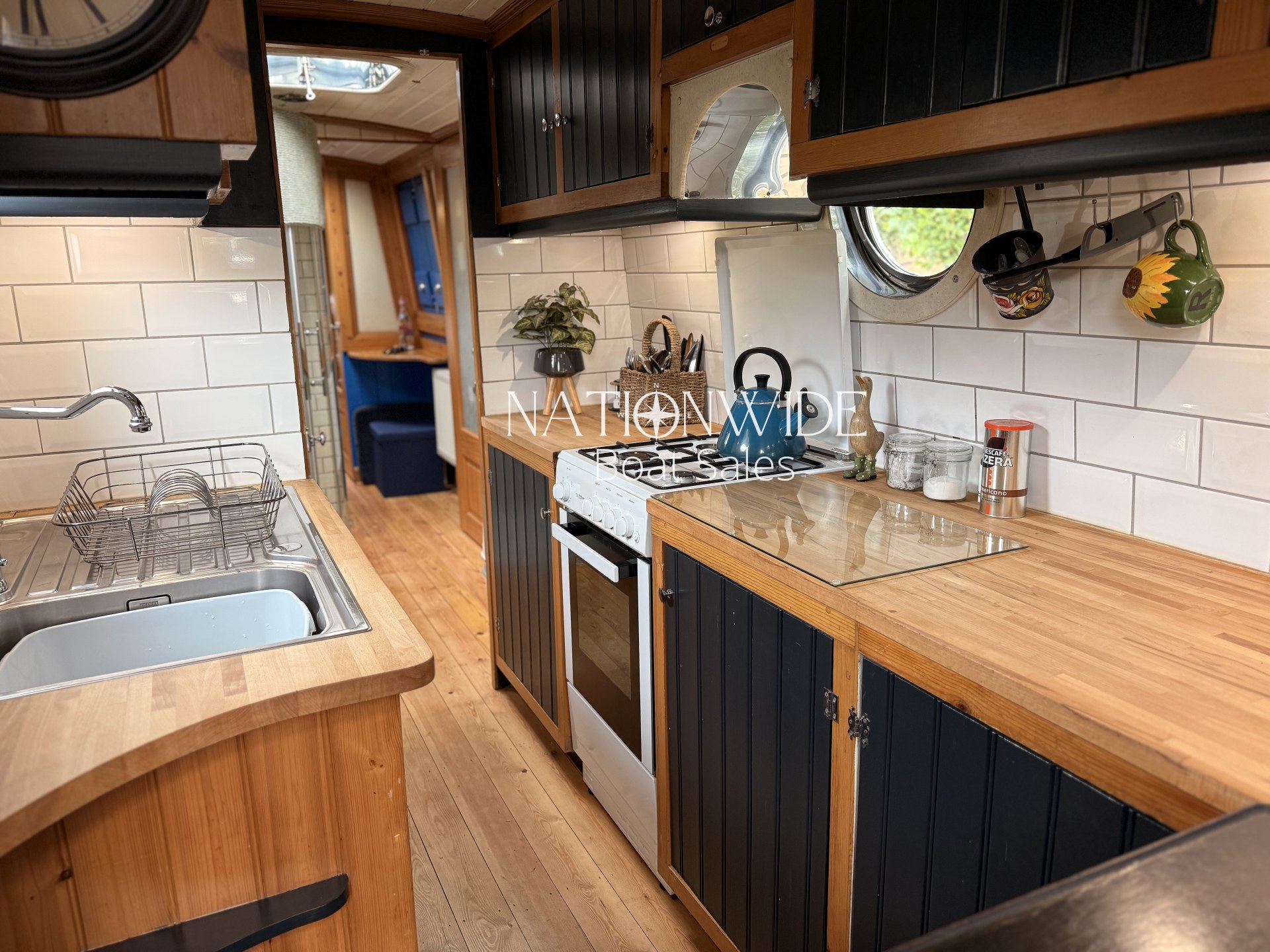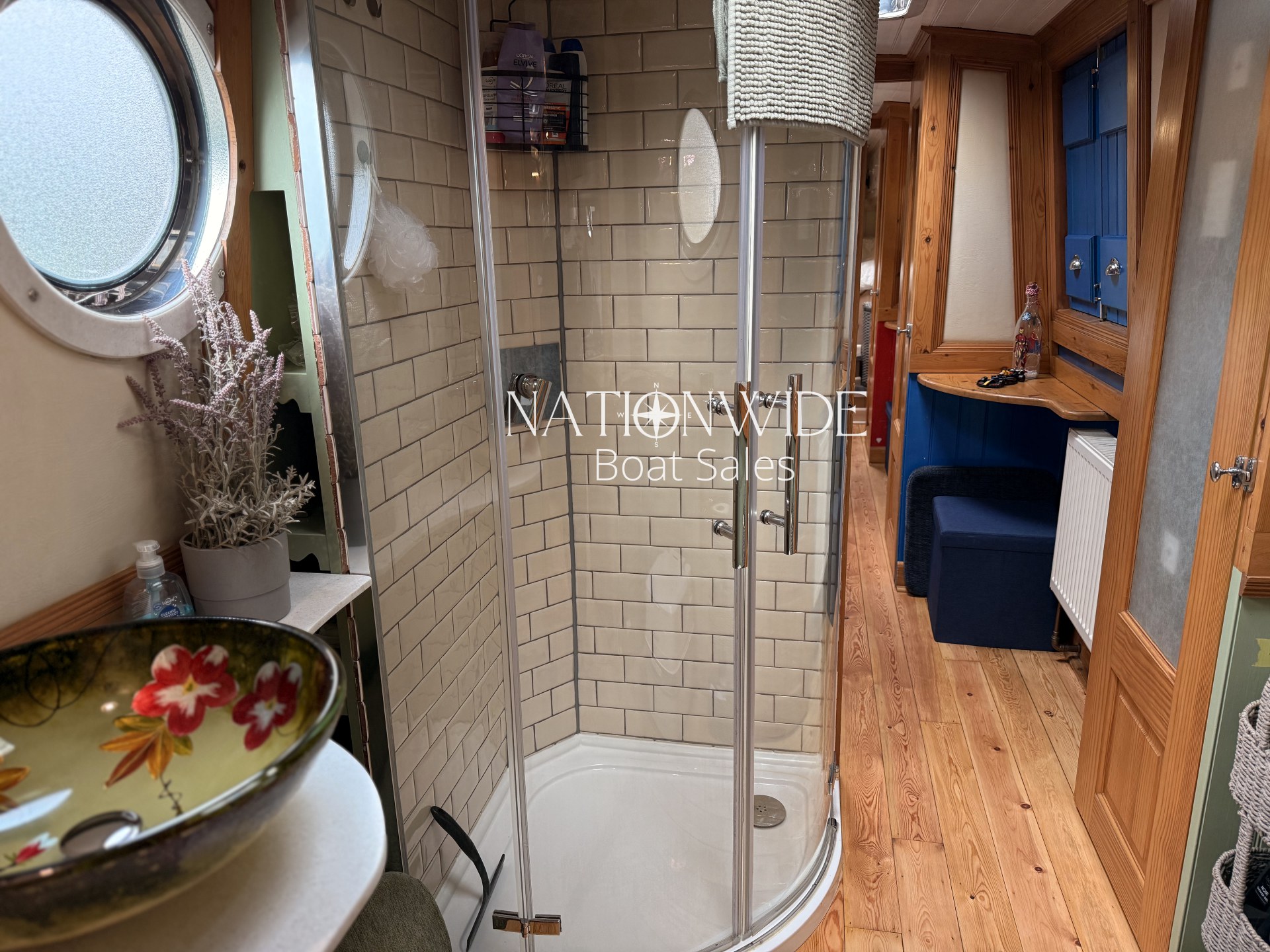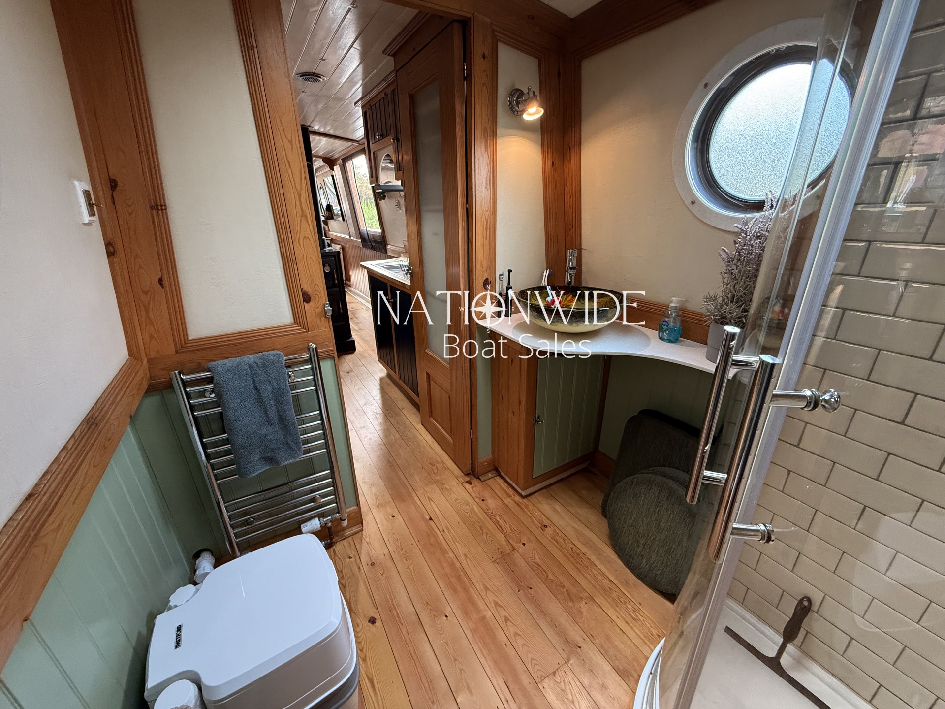 The interior finish showcases solid oak flooring, tongue and groove cabin sides, and spray foam insulation for year-round comfort. The galley is well-equipped with a Statesman cooker and Prity stove with backboiler, Shoreline fridge, and solid wood worktops, creating a warm and homely space for preparing meals. The walkthrough bathroom includes a shower, vanity basin, and cassette toilet with fittings in place for a pump-out option.