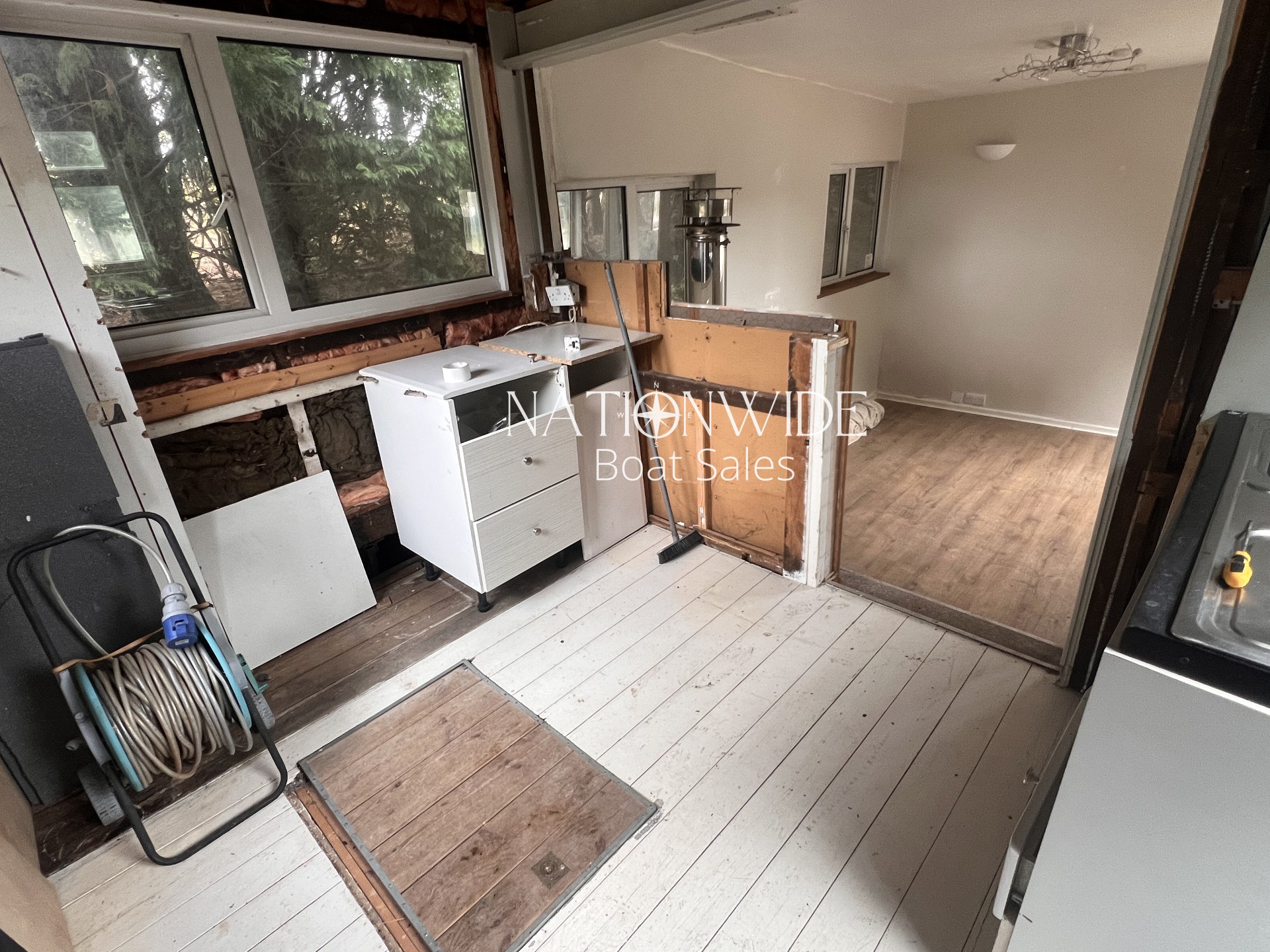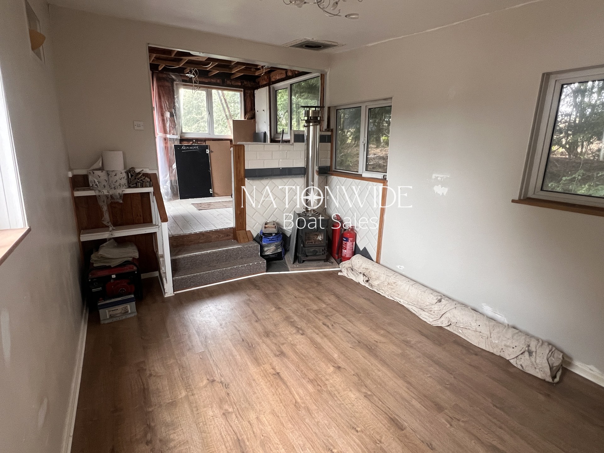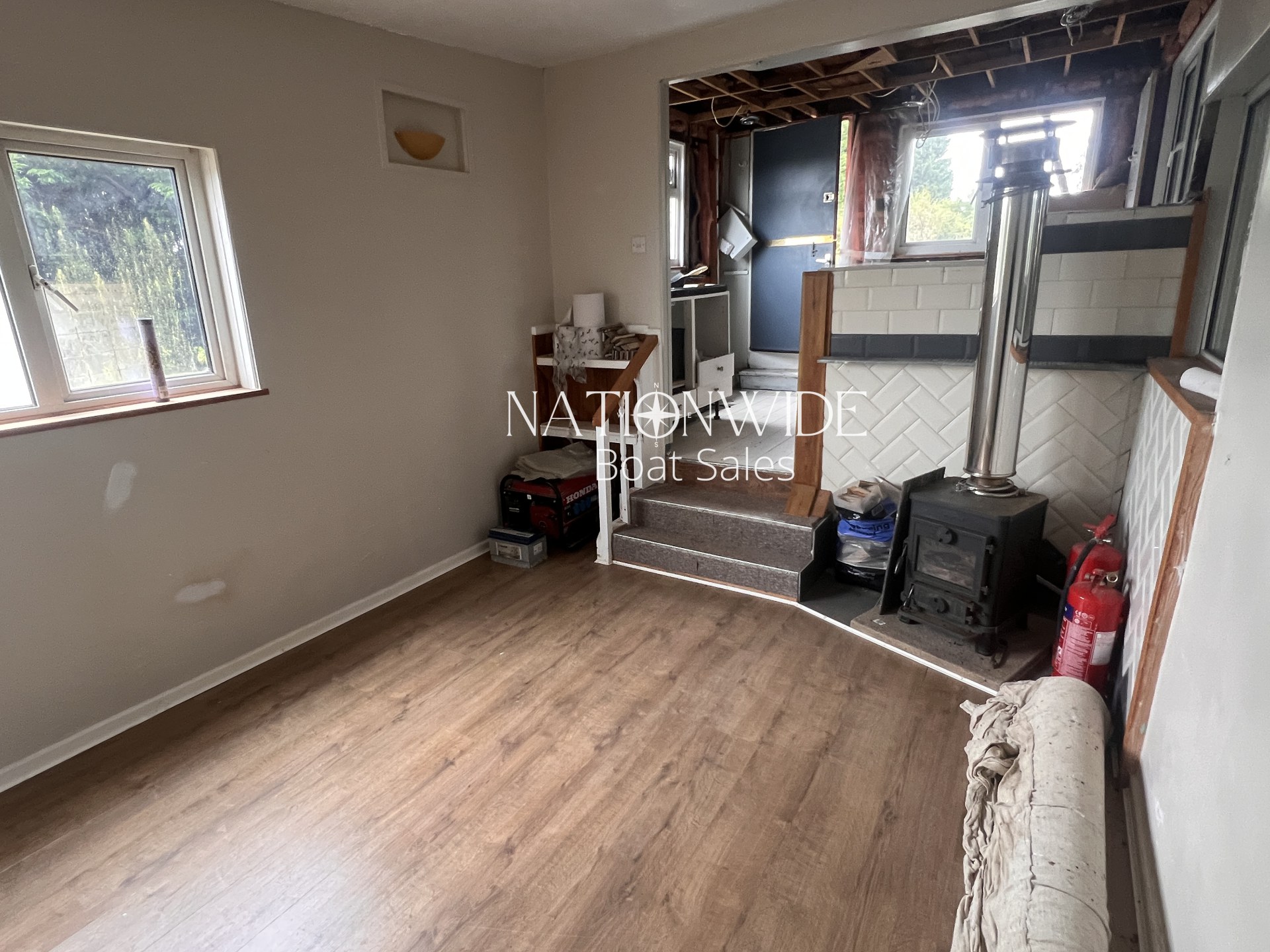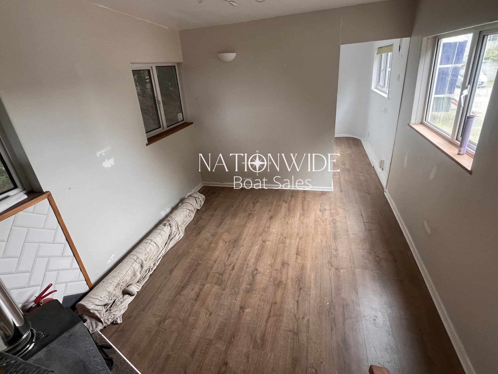 Say hello to ‘Tranquillity’, a spacious 60ft by 12ft 6′ static houseboat that’s waiting for your personal touch to make it home. It’s a work-in-progress that comes with laminate flooring and rockwool insulation for a cozy interior. In the living area, you’ll find a snug solid fuel stove. The current electric system includes a standalone petrol generator and 1 starter with 1 leisure batteries. The kitchen is a blank canvas, ready for you to install your favourite appliances. The onboard bathroom comes equipped with a cassette toilet, shower, and vanity basin. The living space is flexible and open, just waiting for your own unique layout.