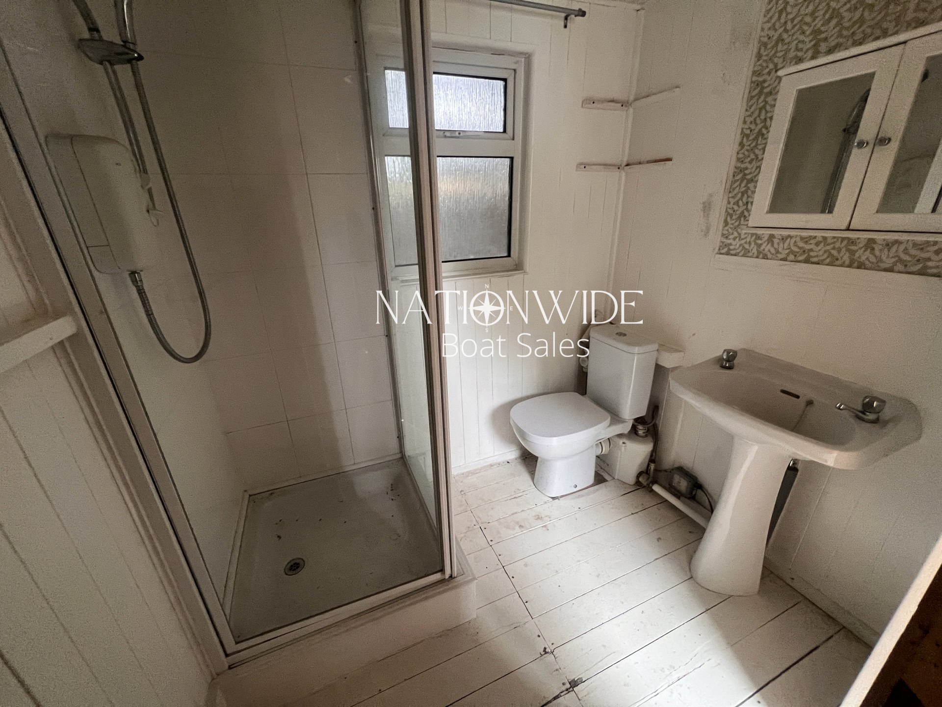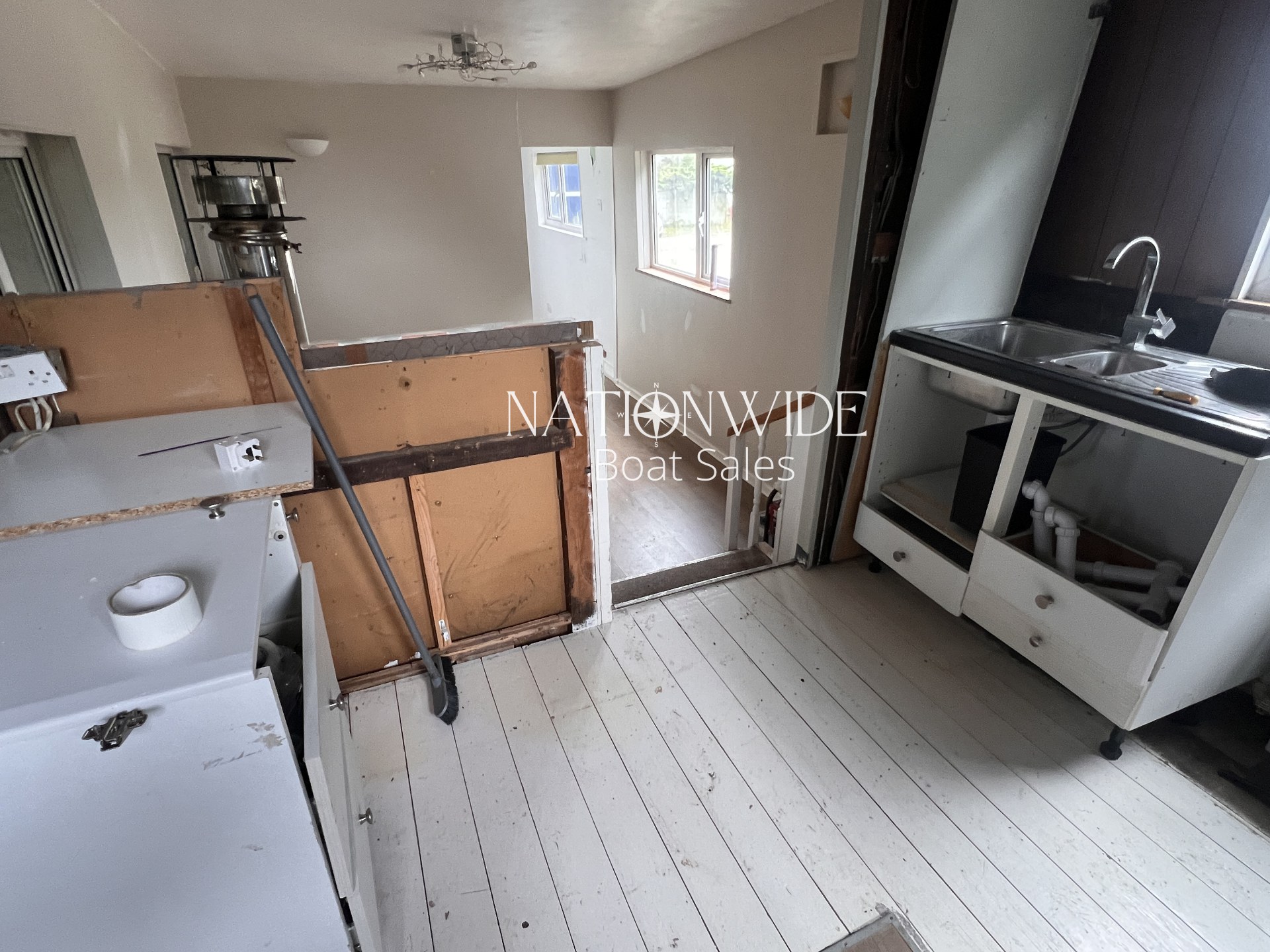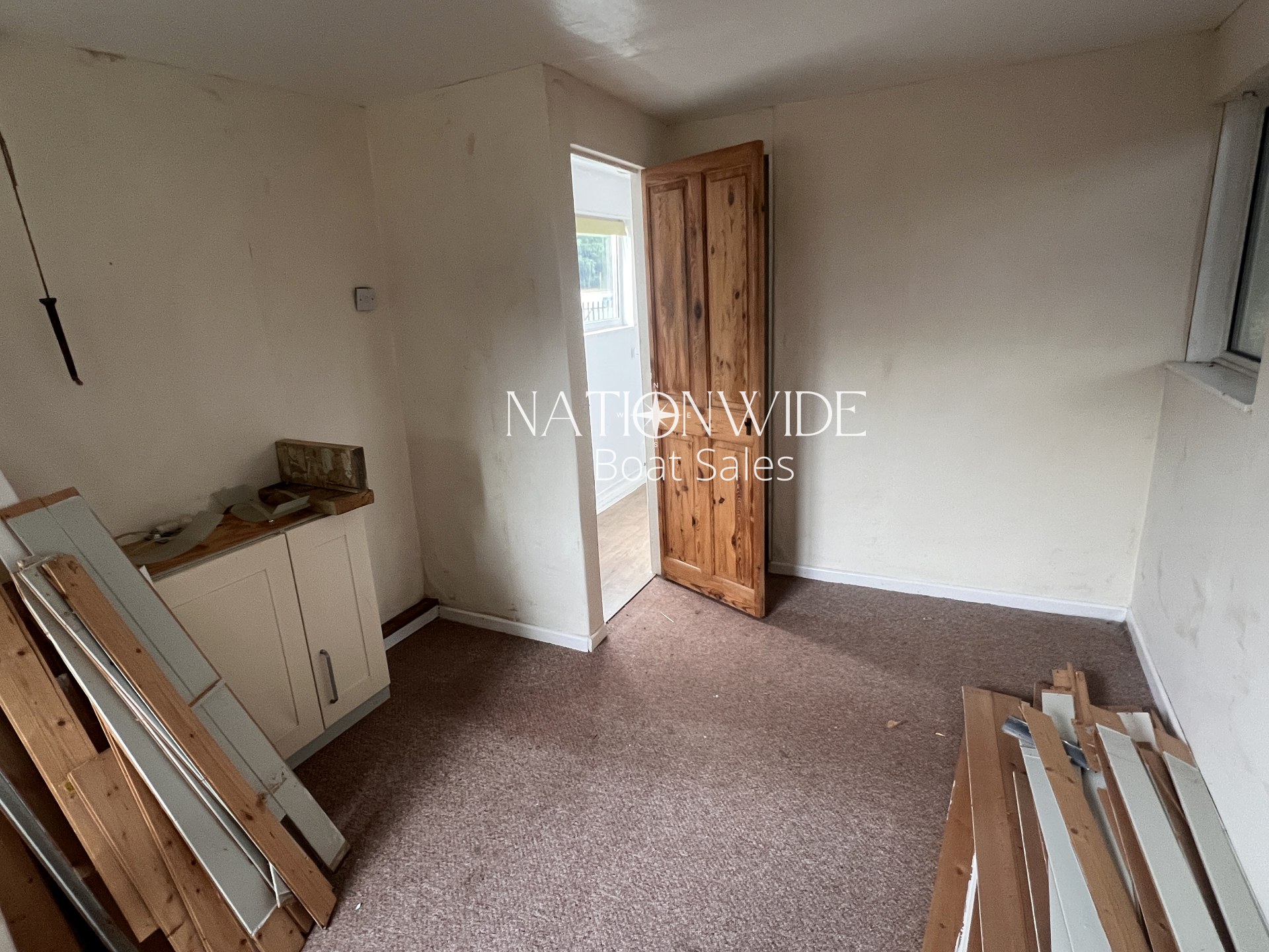 Say hello to ‘Tranquillity’, a spacious 60ft by 12ft 6′ static houseboat that’s waiting for your personal touch to make it home. It’s a work-in-progress that comes with laminate flooring and rockwool insulation for a cozy interior. In the living area, you’ll find a snug solid fuel stove. The current electric system includes a standalone petrol generator and 1 starter with 1 leisure batteries. The kitchen is a blank canvas, ready for you to install your favourite appliances. The onboard bathroom comes equipped with a cassette toilet, shower, and vanity basin. The living space is flexible and open, just waiting for your own unique layout.