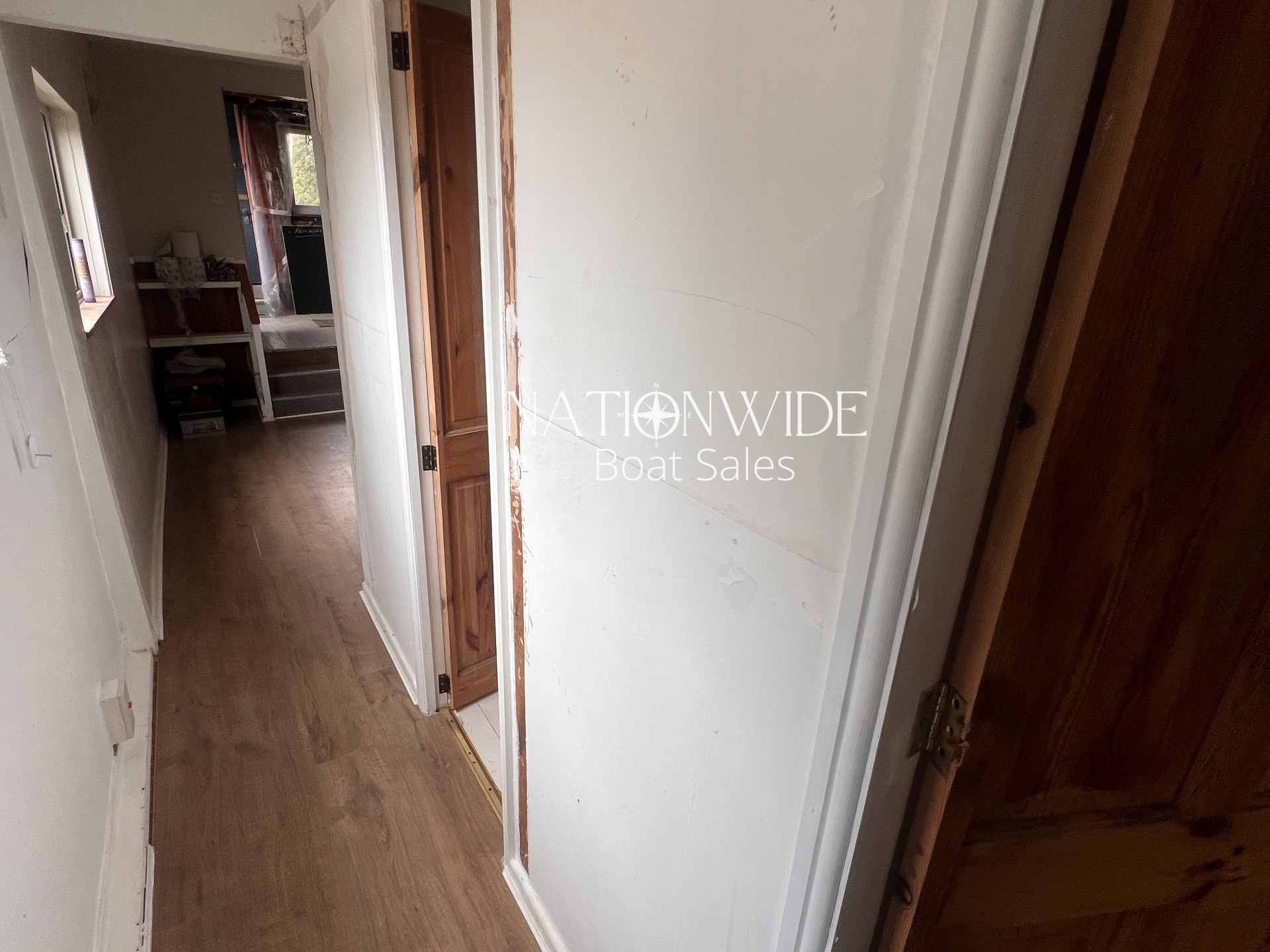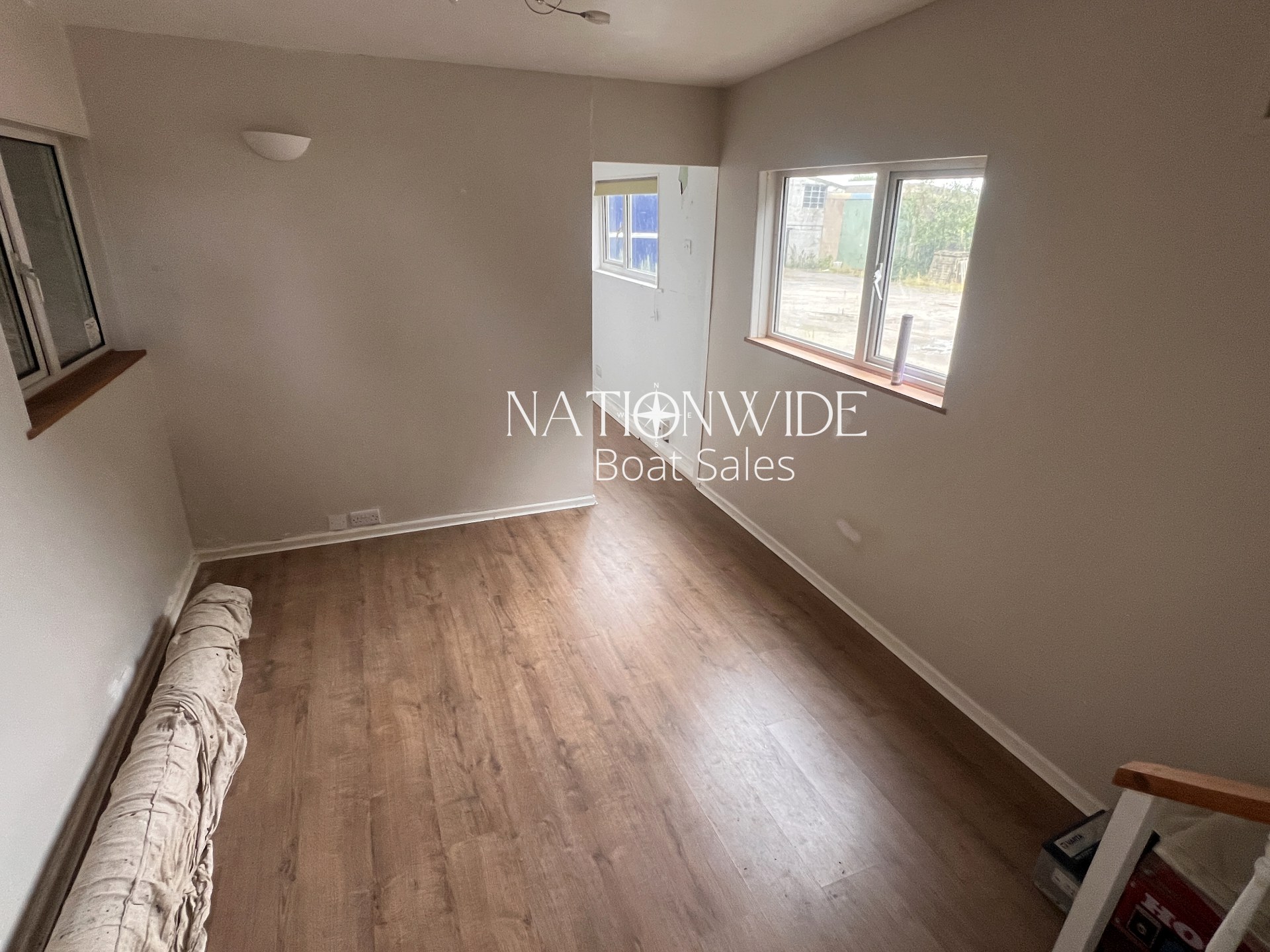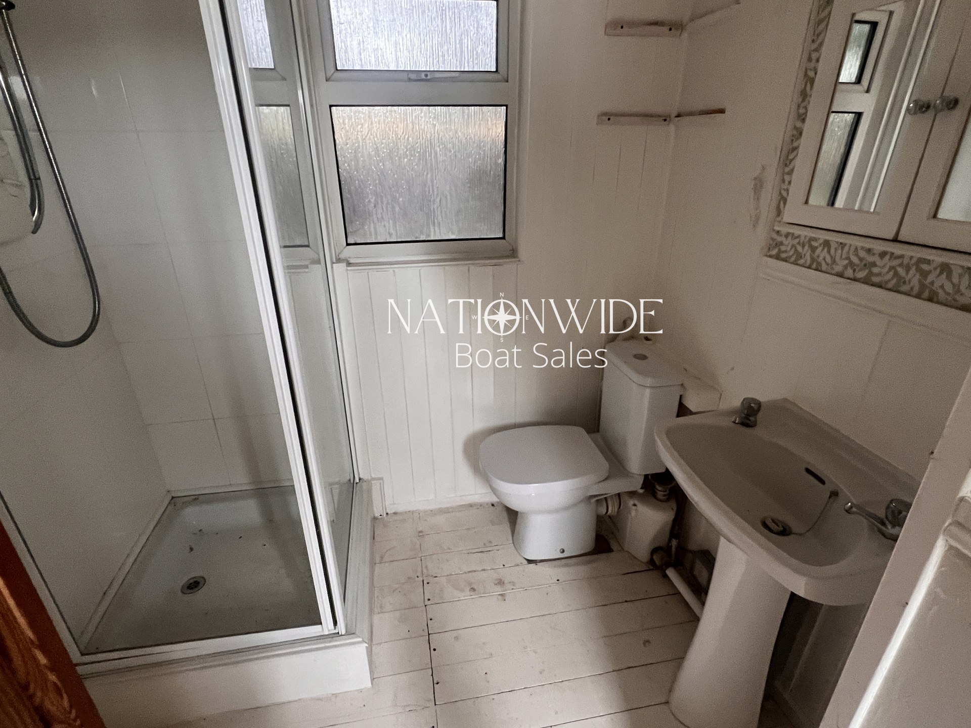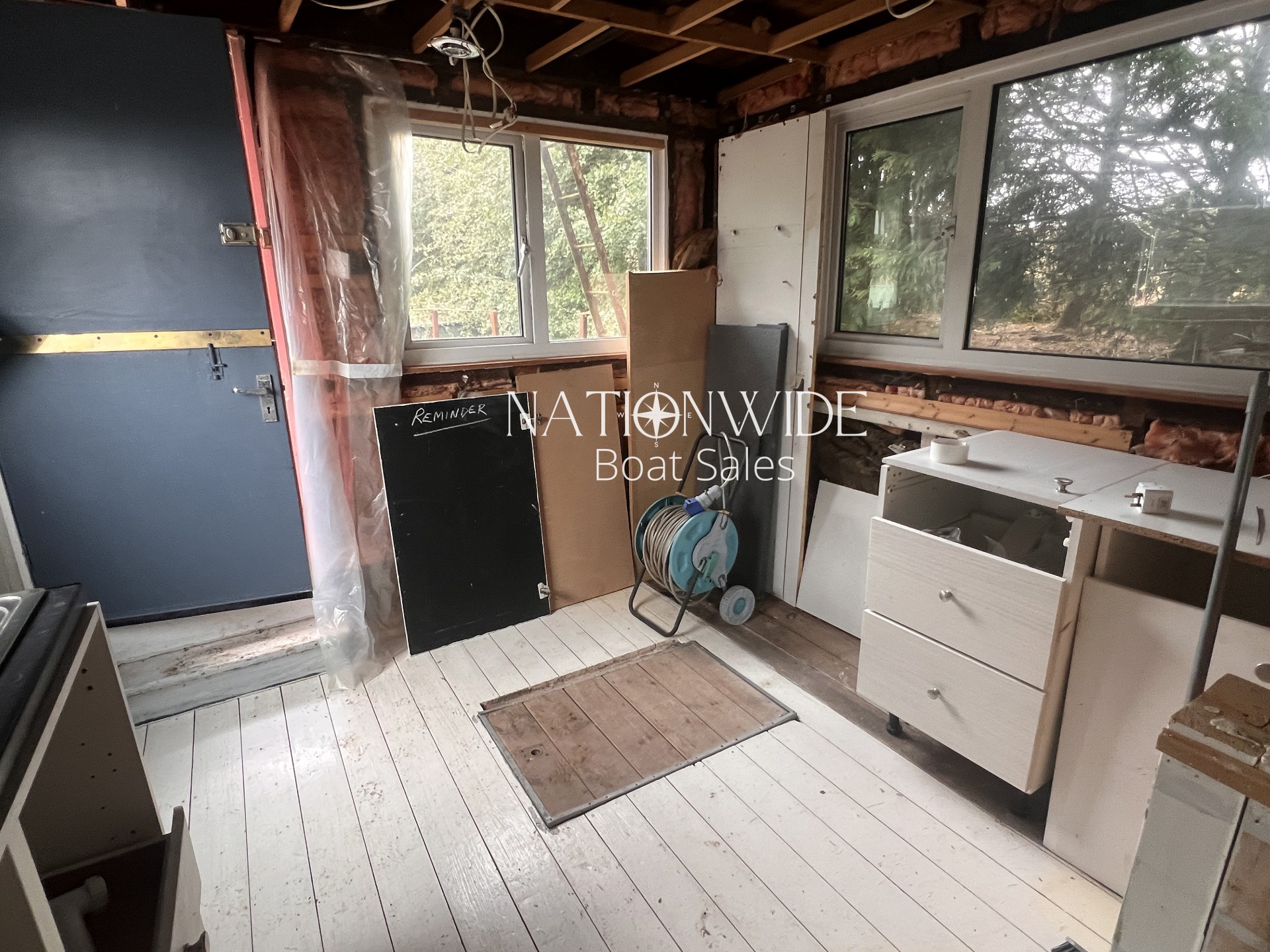Say hello to ‘Tranquillity’, a spacious 60ft by 12ft 6′ static houseboat that’s waiting for your personal touch to make it home. It’s a work-in-progress that comes with laminate flooring and rockwool insulation for a cozy interior. In the living area, you’ll find a snug solid fuel stove. The current electric system includes a standalone petrol generator and 1 starter with 1 leisure batteries. The kitchen is a blank canvas, ready for you to install your favourite appliances. The onboard bathroom comes equipped with a cassette toilet, shower, and vanity basin. The living space is flexible and open, just waiting for your own unique layout.