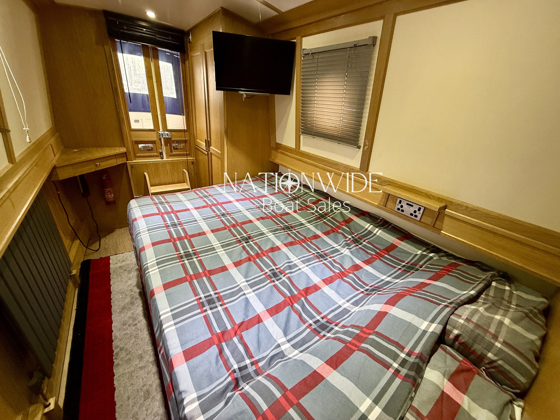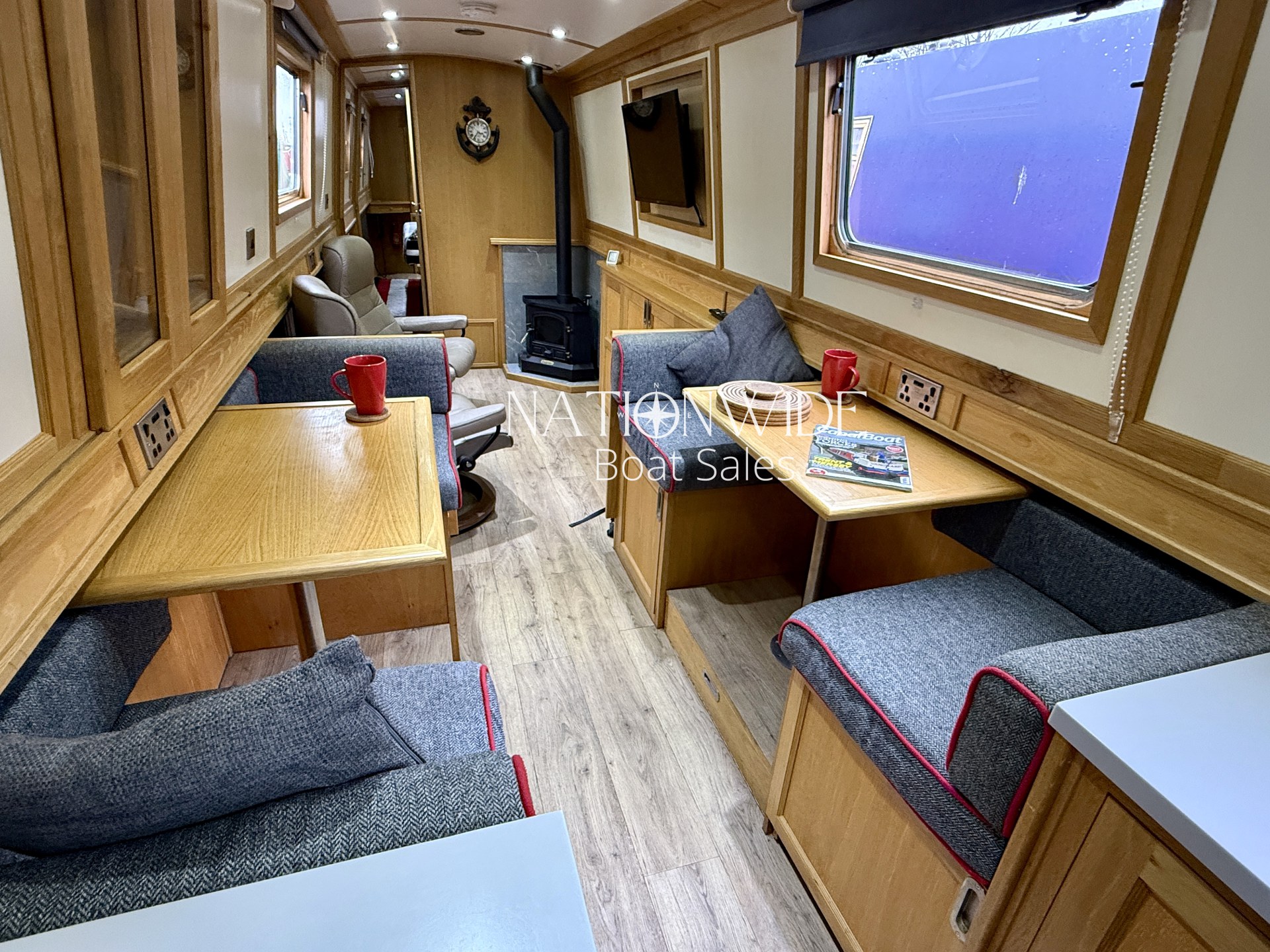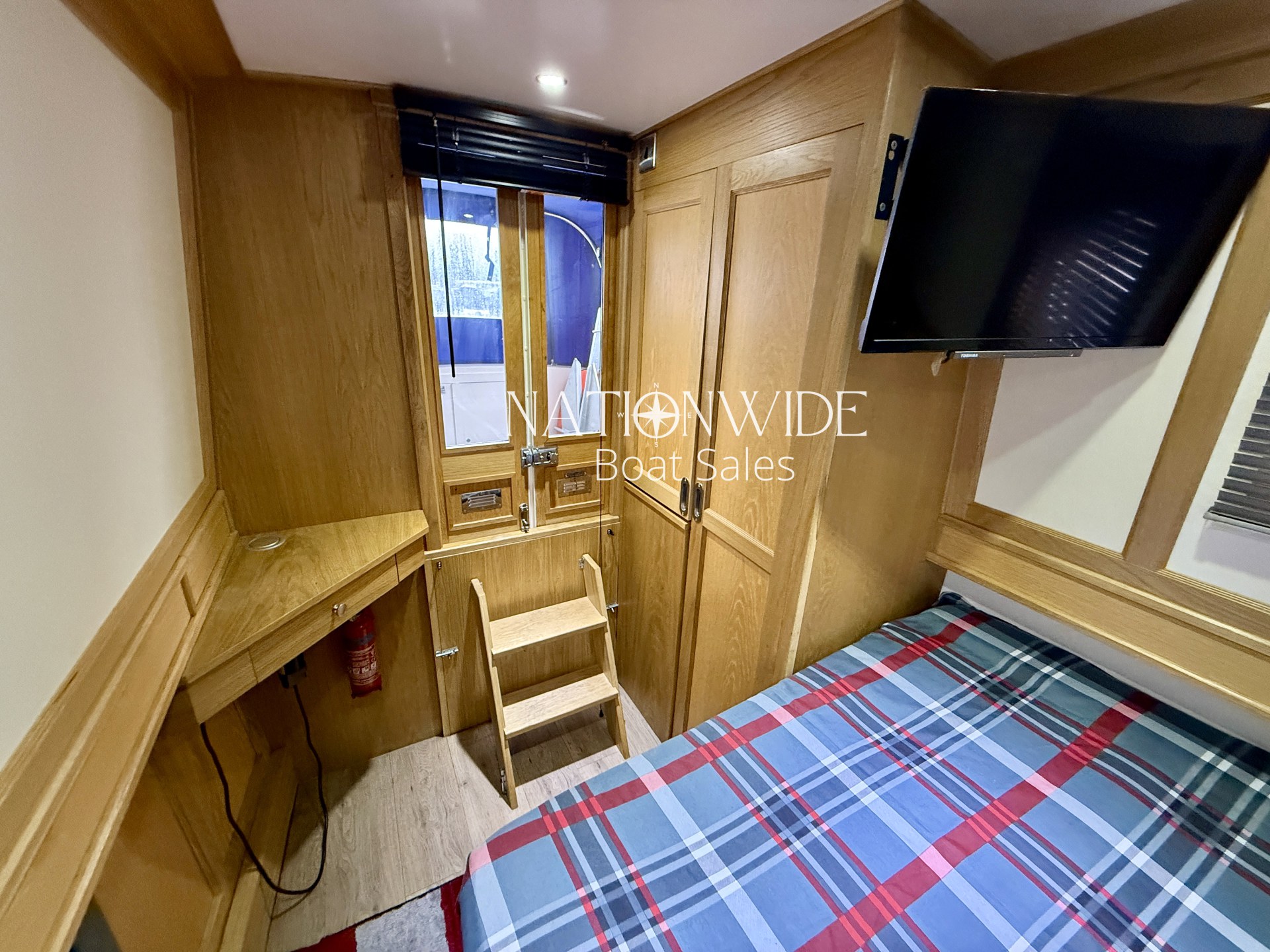 Powered by a smooth and capable Beta Marine 43hp engine with a hospital silencer and a Vetus 75 KGF bow thruster, Vanguard handles easily whether you’re navigating tight marinas or open stretches of canal. A generous 200-litre fuel tank and flat-bottomed 10/6/4 steel hull provide both range and stability, making her equally suited to long-term cruising or comfortable mooring life