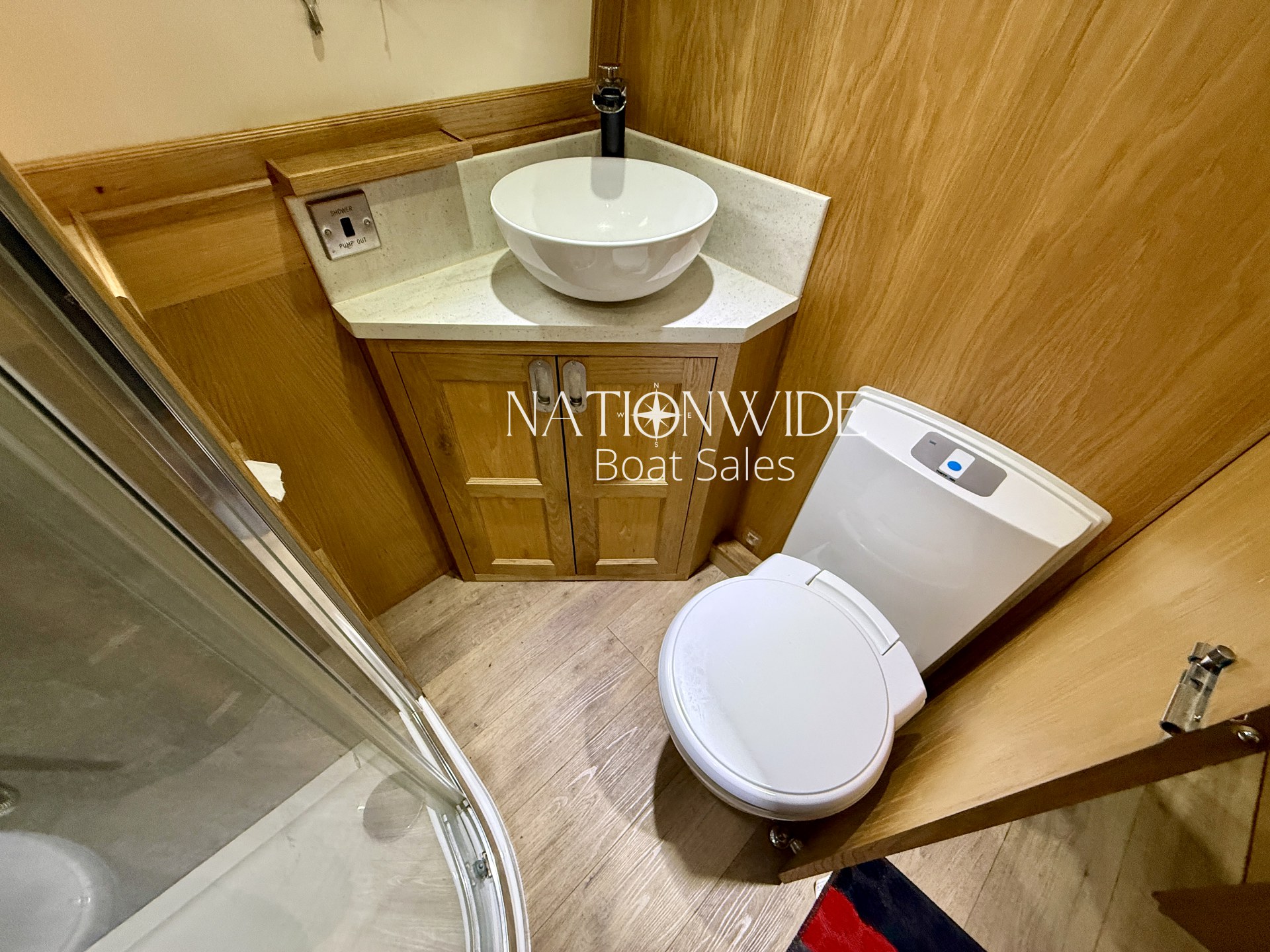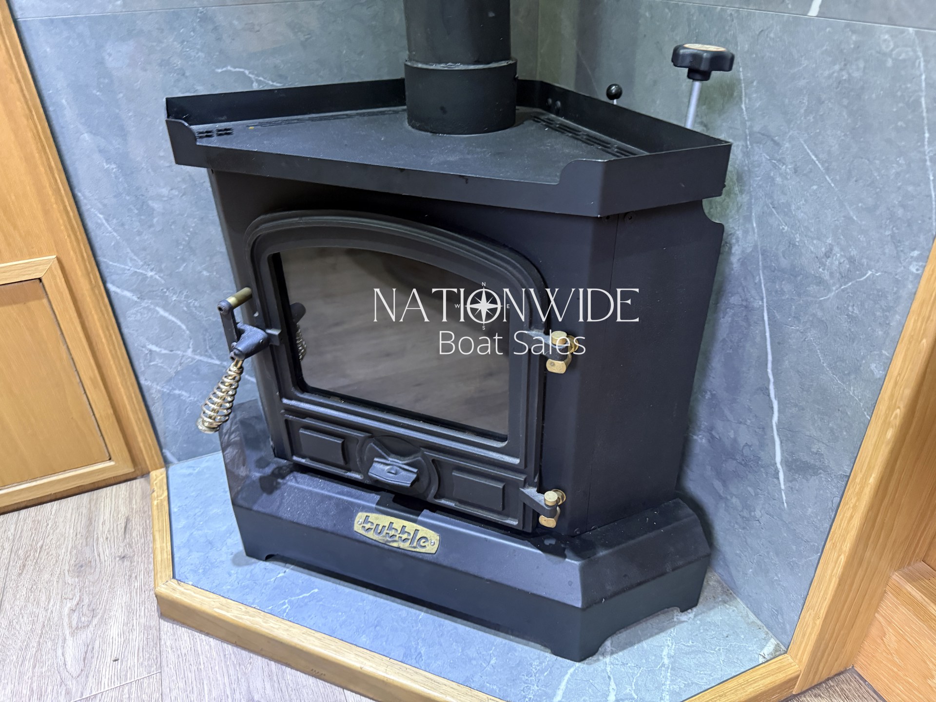 Heating and hot water are supplied via Webasto, immersion and calorifier, complemented by a characterful Bubble diesel stove on its own fuel supply, all controlled by Hive for easy temperature management from your phone. With a smart walk-through bathroom with shower, vanity basin and Thetford cassette toilet (plus spare cassette), Vanguard is well set up for extended stays aboard.