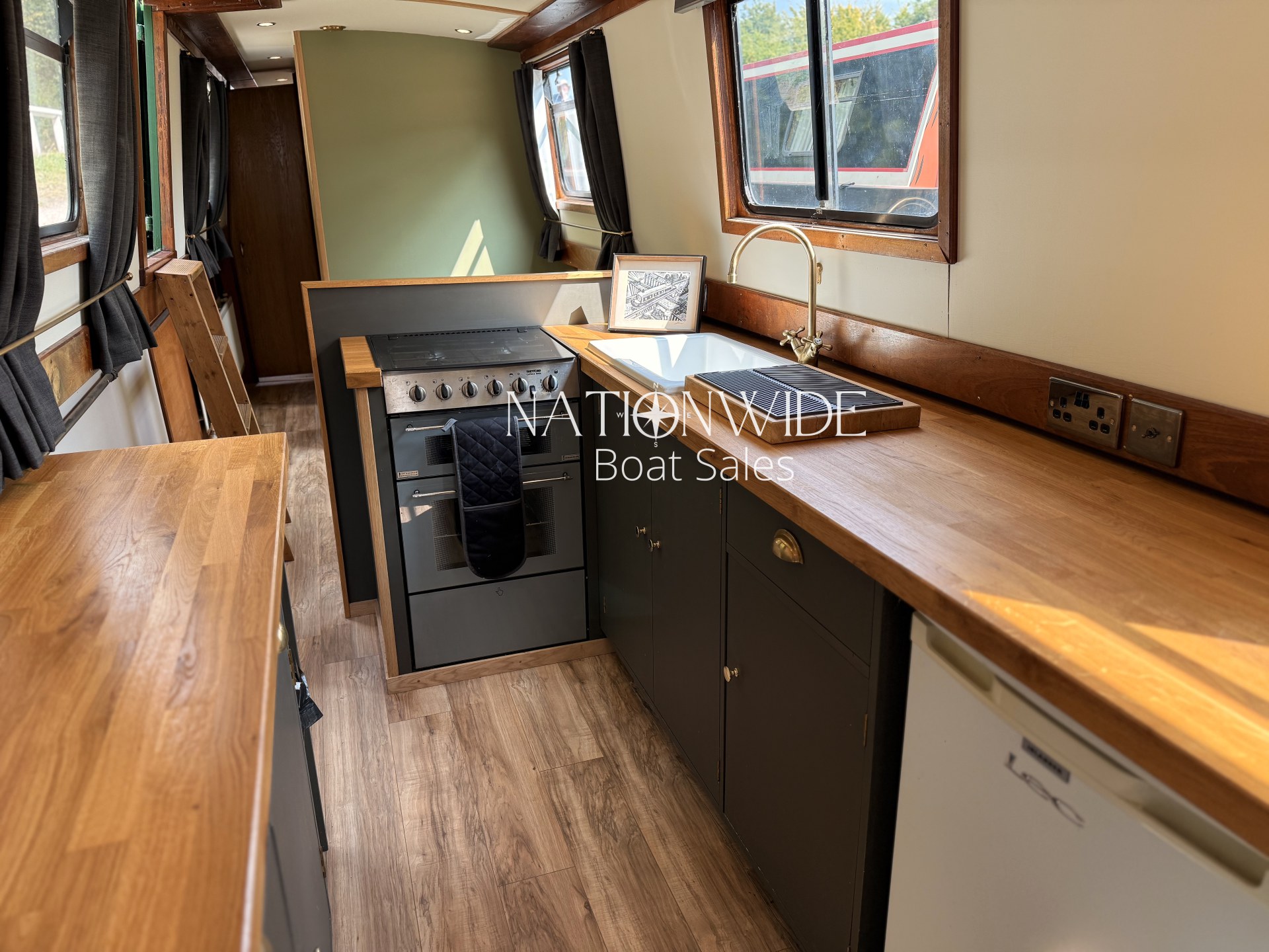 Step aboard to find a practical galley featuring solid wood worktops, a Thetford cooker, and a 12v LEC fridge, providing everything needed for life afloat. The boat offers a double fixed berths with a comfortable double bed, and there is scope for additional sleeping arrangements if desired. The bathroom is equipped with a cassette toilet, shower, and vanity basin, blending convenience with functionality.